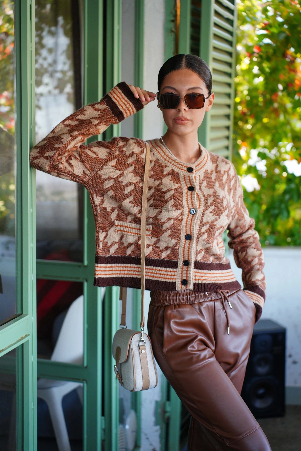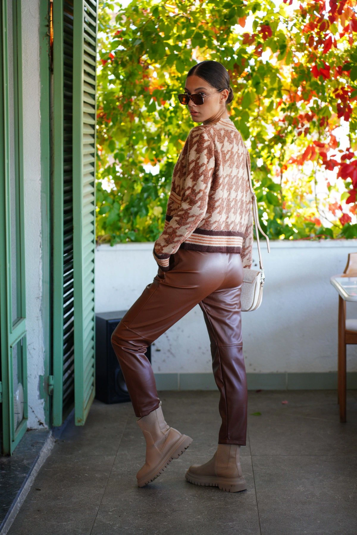 DİZ DİKİŞLİ BEL LASTİK CEPLİ DERİ PANTOLON – TABA