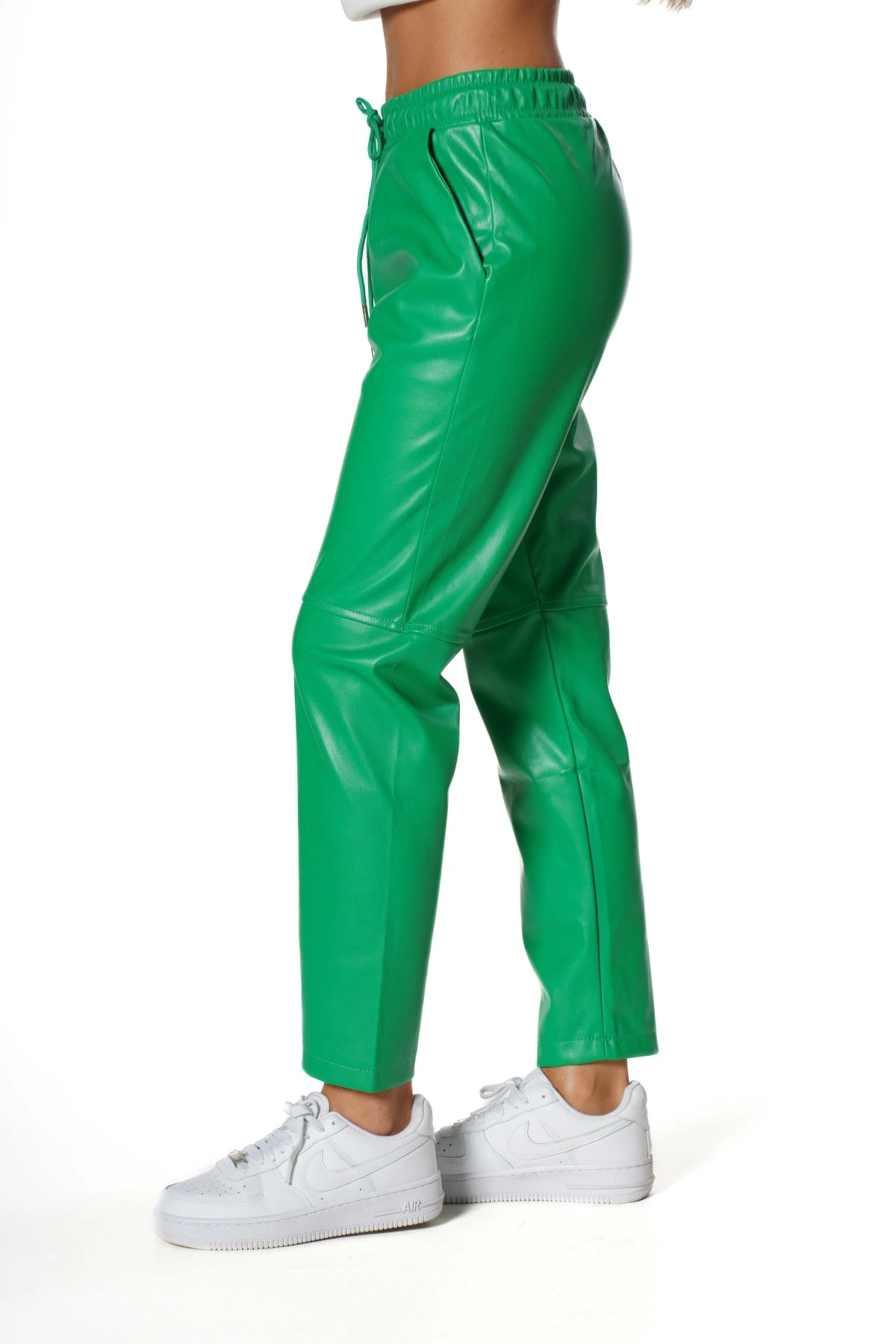 DİZ DİKİŞLİ BEL LASTİK CEPLİ DERİ PANTOLON – YEŞİL