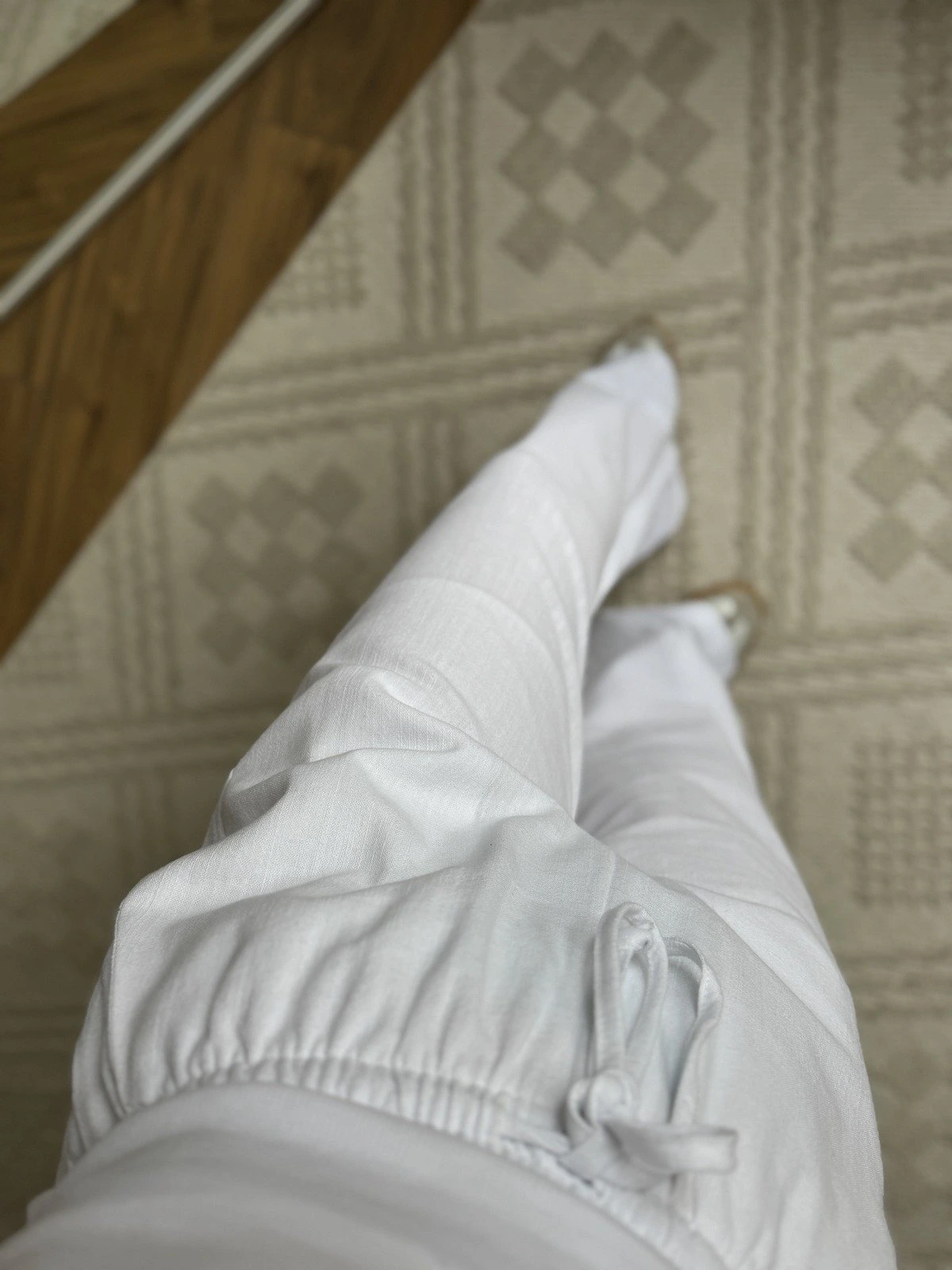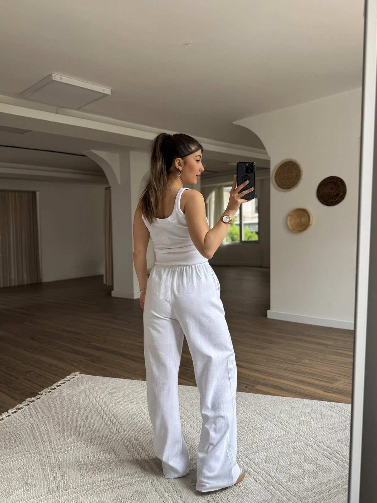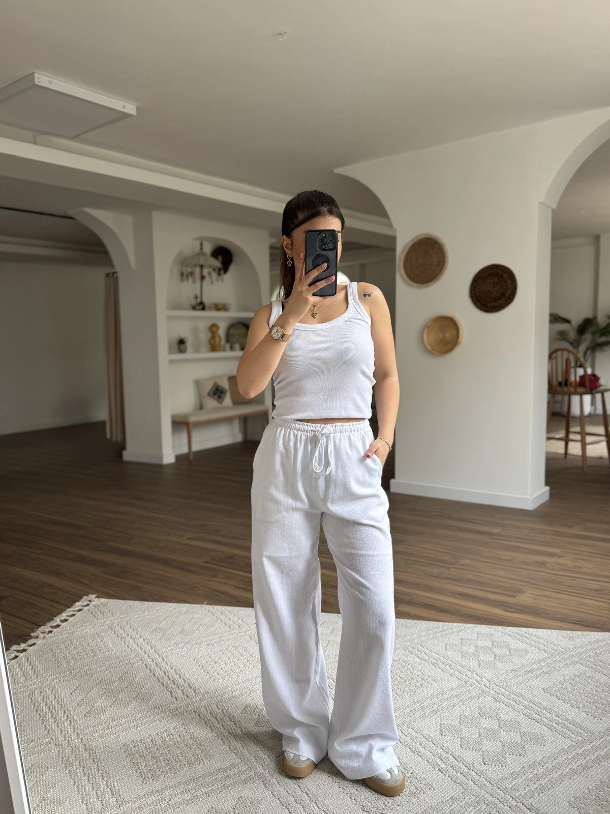 DOKULU PAMUK KUMAŞ CEPLİ RAHAT PANTOLON – BEYAZ