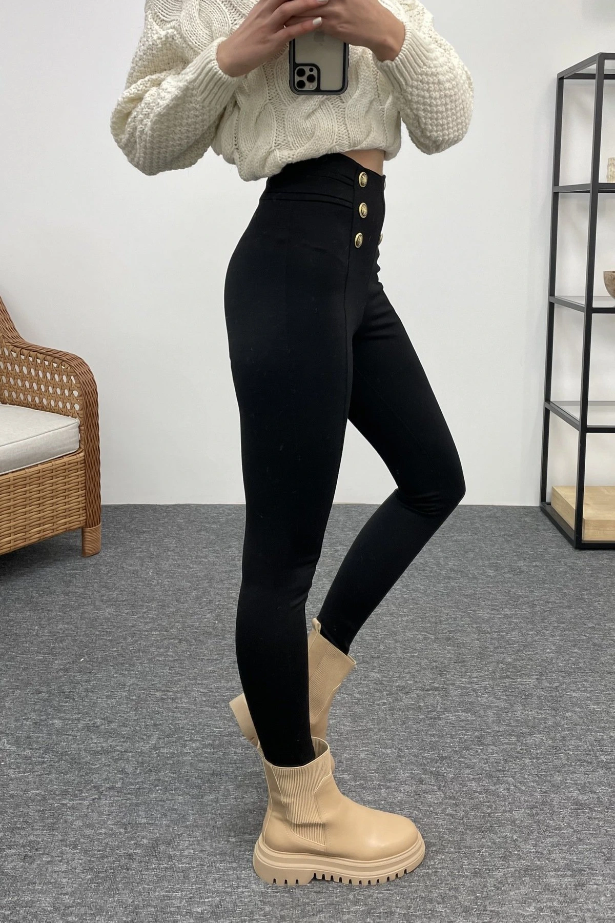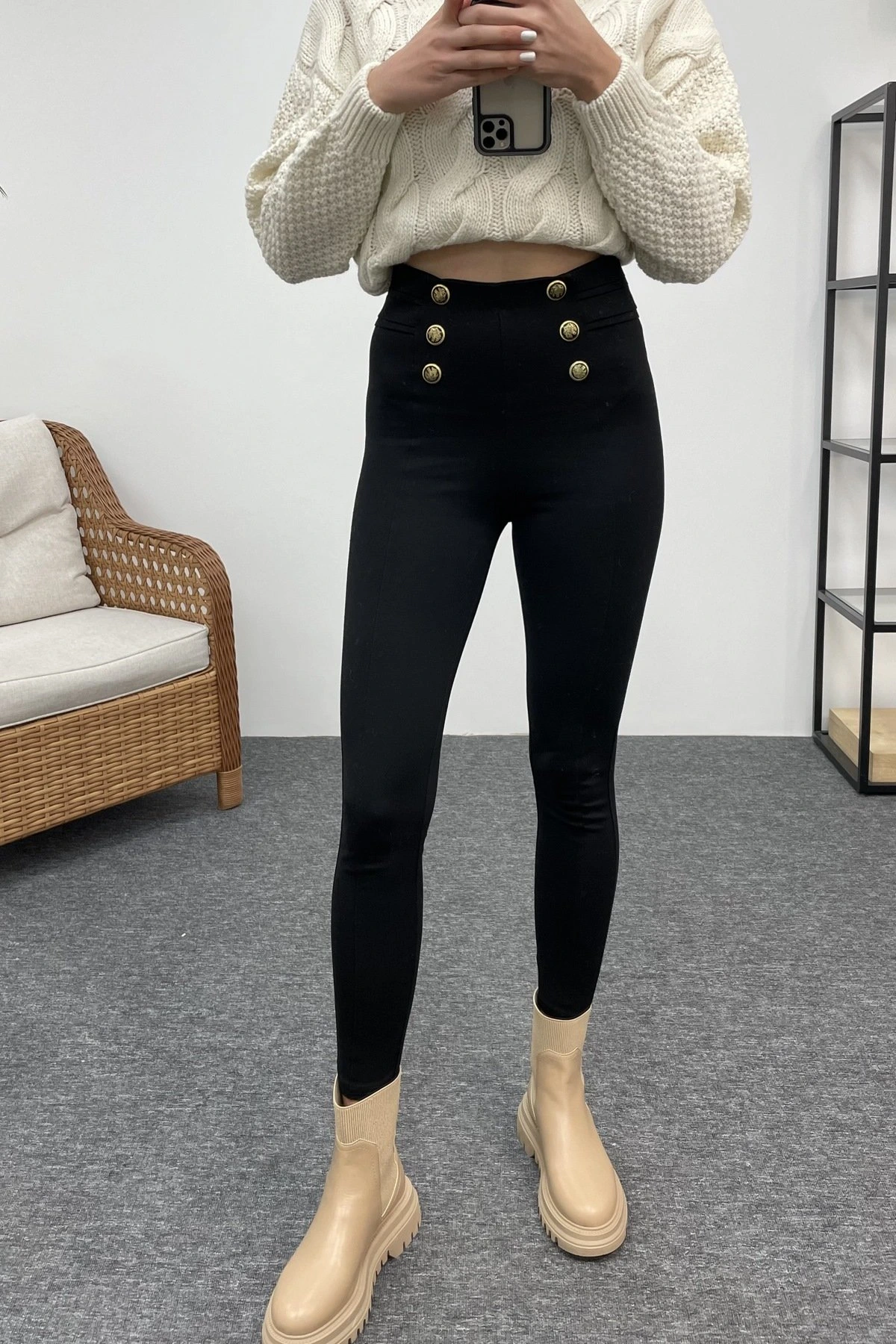 DÜĞME DETAY STREÇ PANTOLON – SİYAH