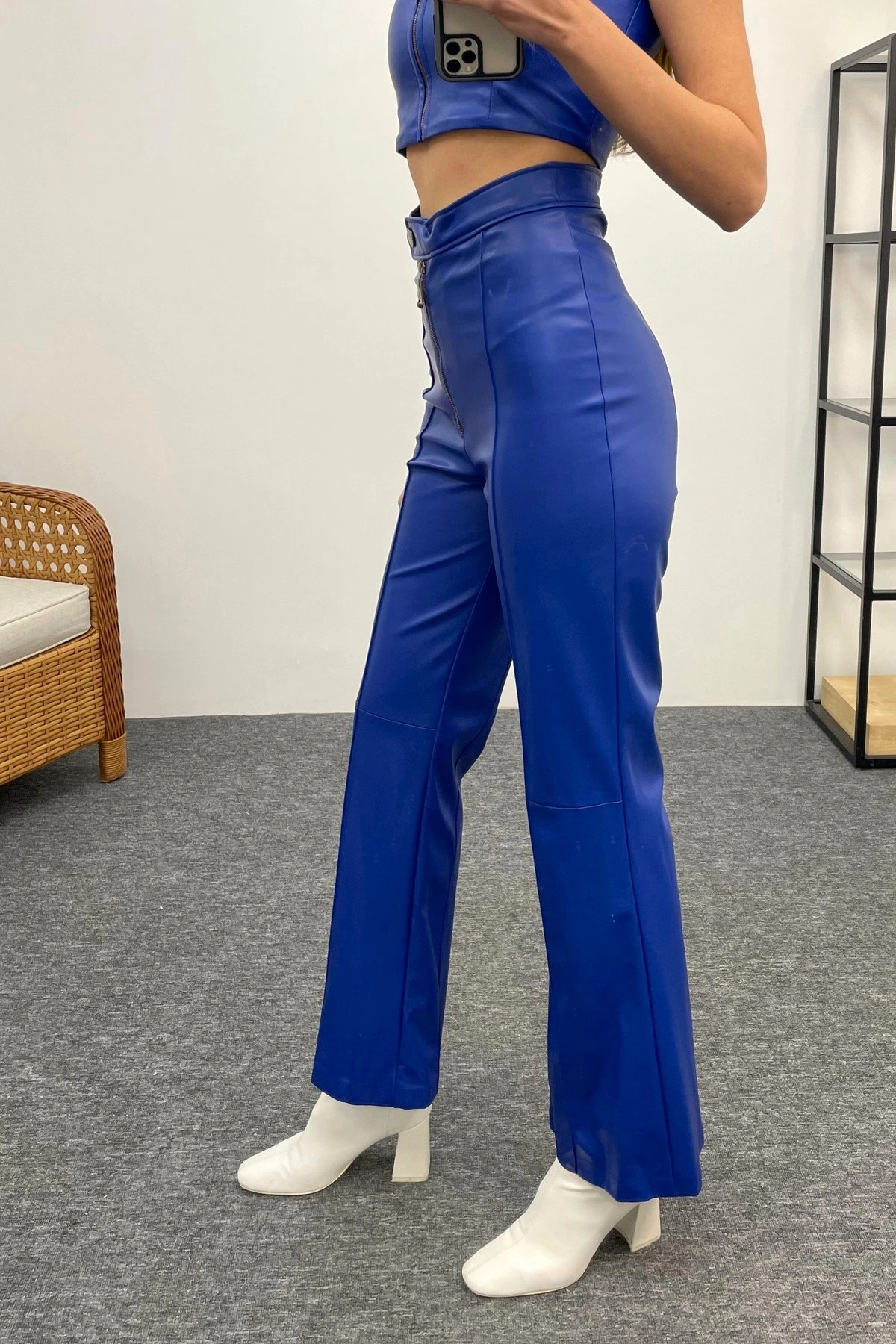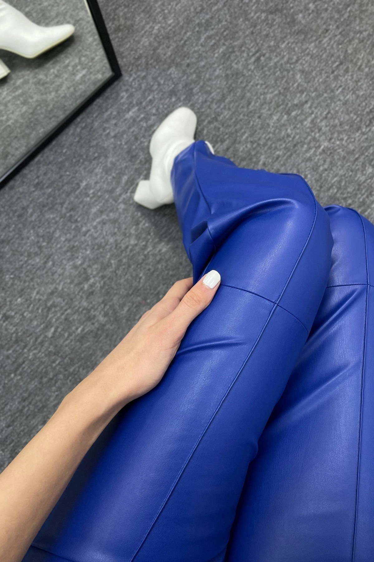 FERMUAR DETAY DERİ PANTOLON – SAKS