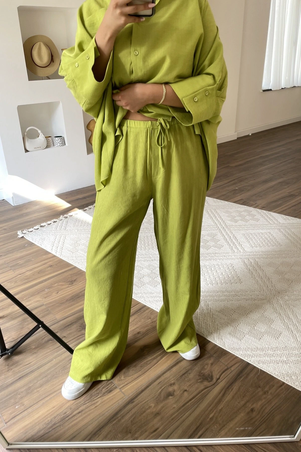 İNCE BEL LASTİK GENİŞ PAÇA VİSKON RAHAT PANTOLON – OLİVE
