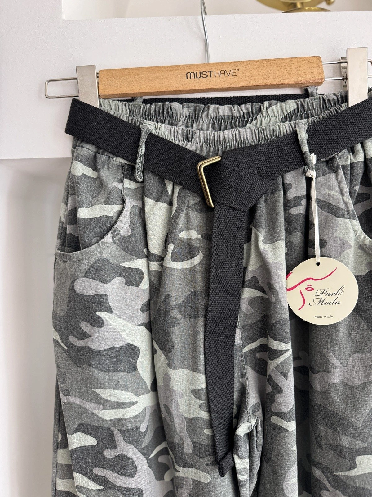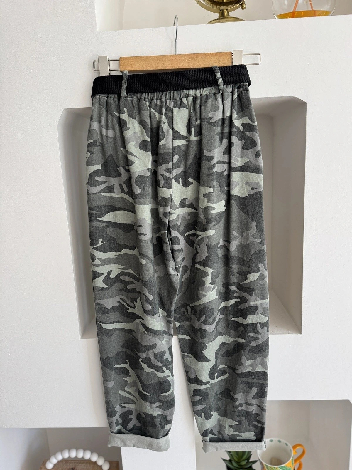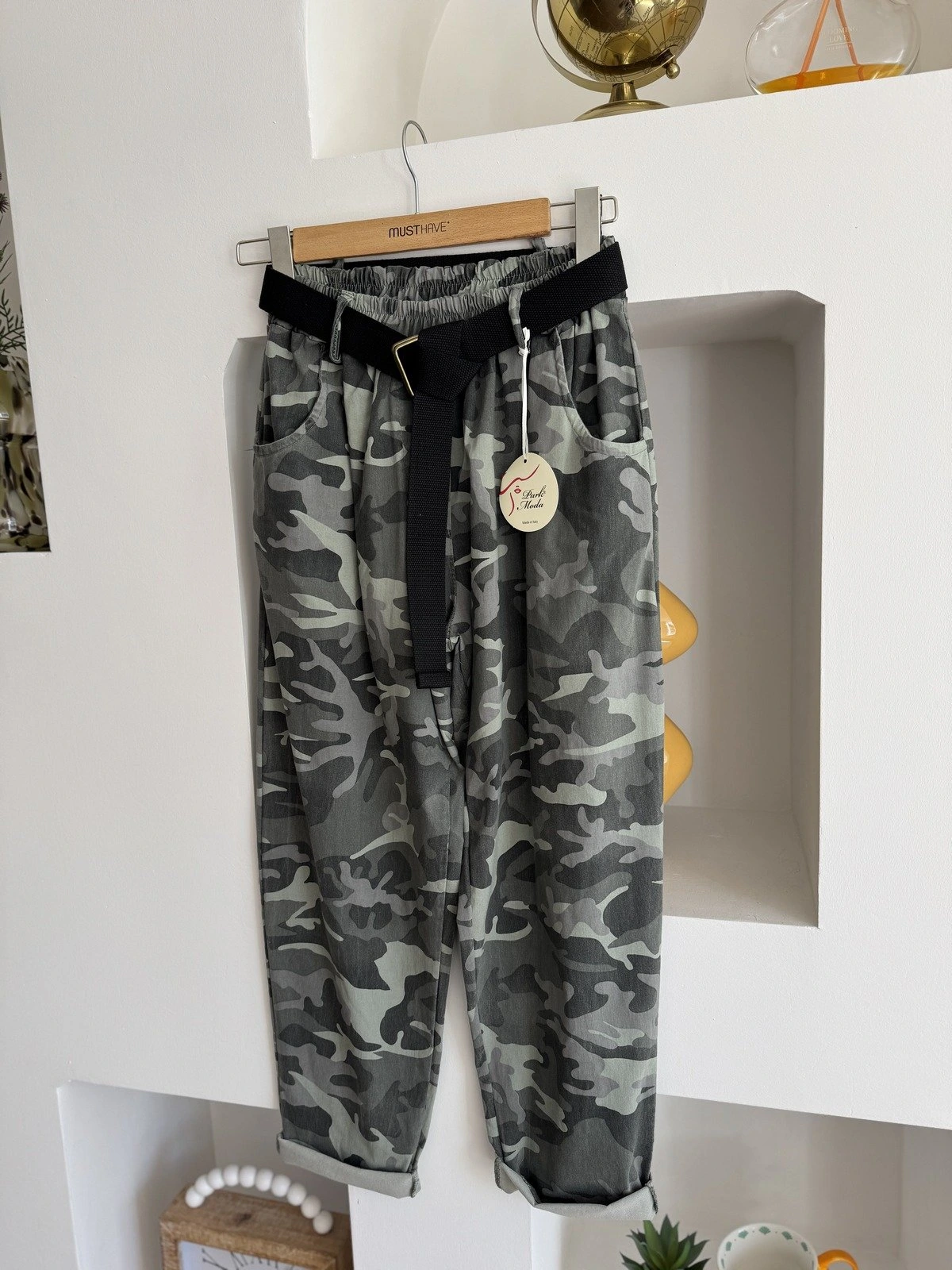 KAMUFLAJ DESEN KEMERLİ LİKRALI VİSKON PANTOLON – HAKİ