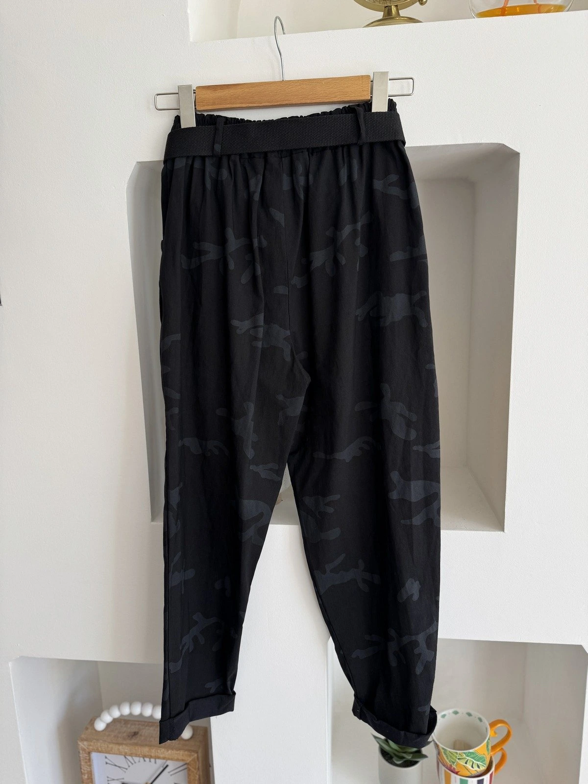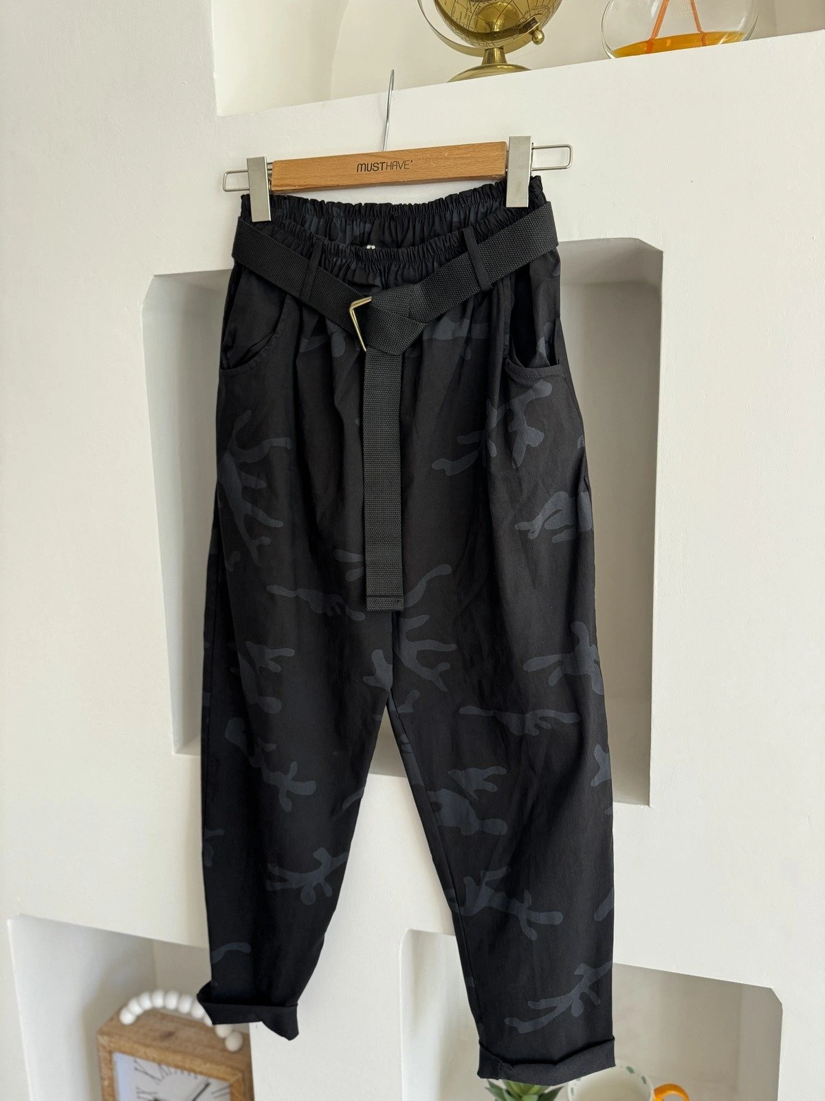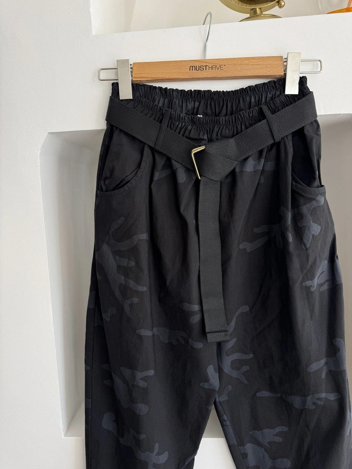 KAMUFLAJ DESEN KEMERLİ LİKRALI VİSKON PANTOLON – SİYAH