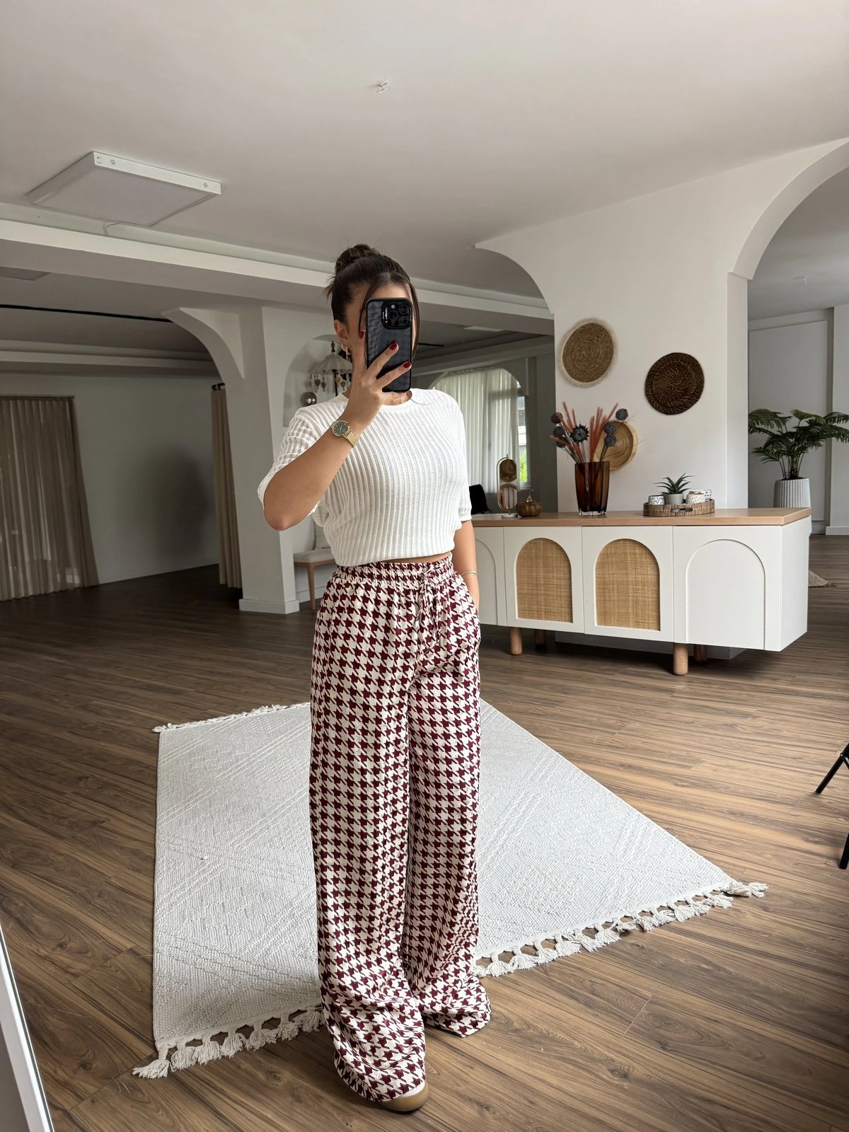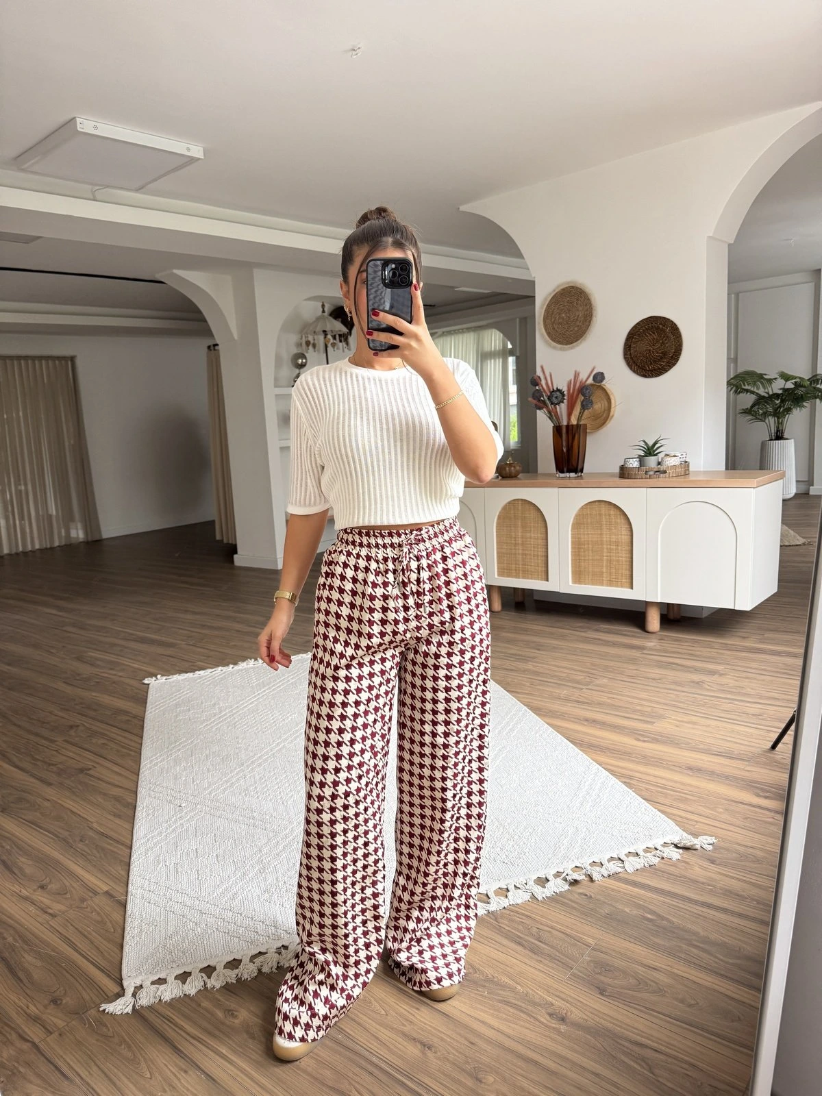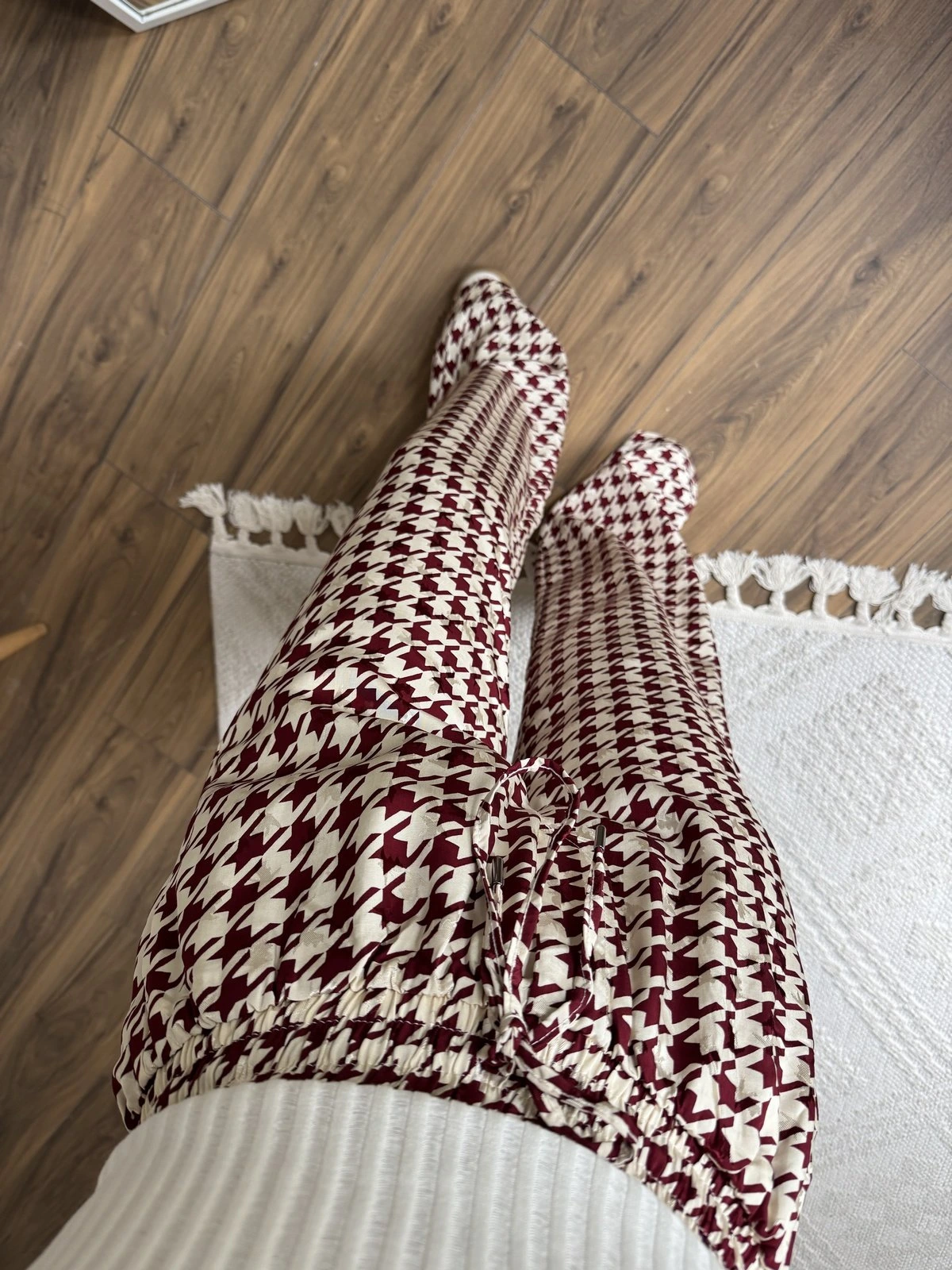 KAZAYAĞI DESEN BEL LASTİK CEPLİ VİSKON SATEN PANTOLON – BORDO