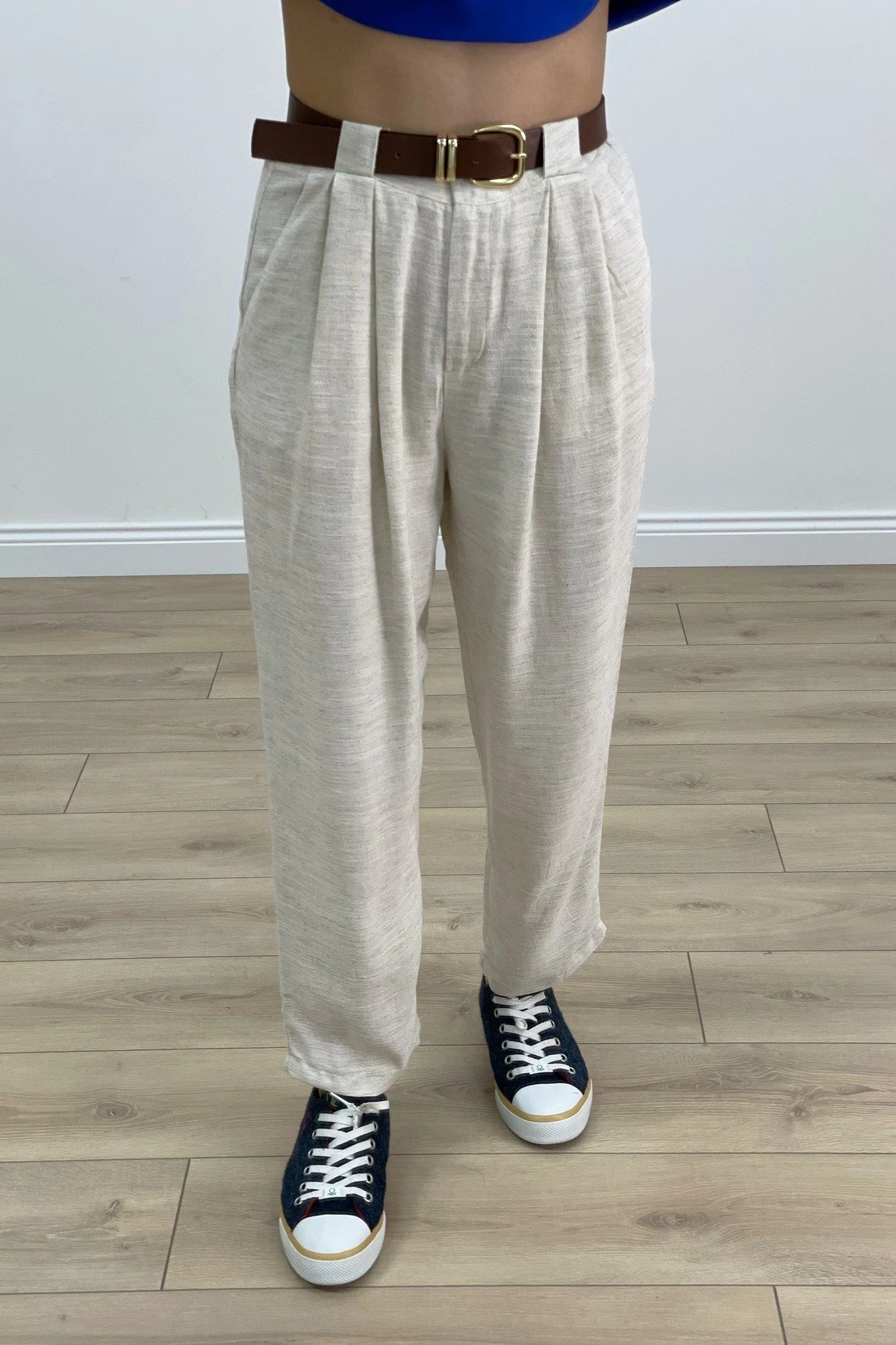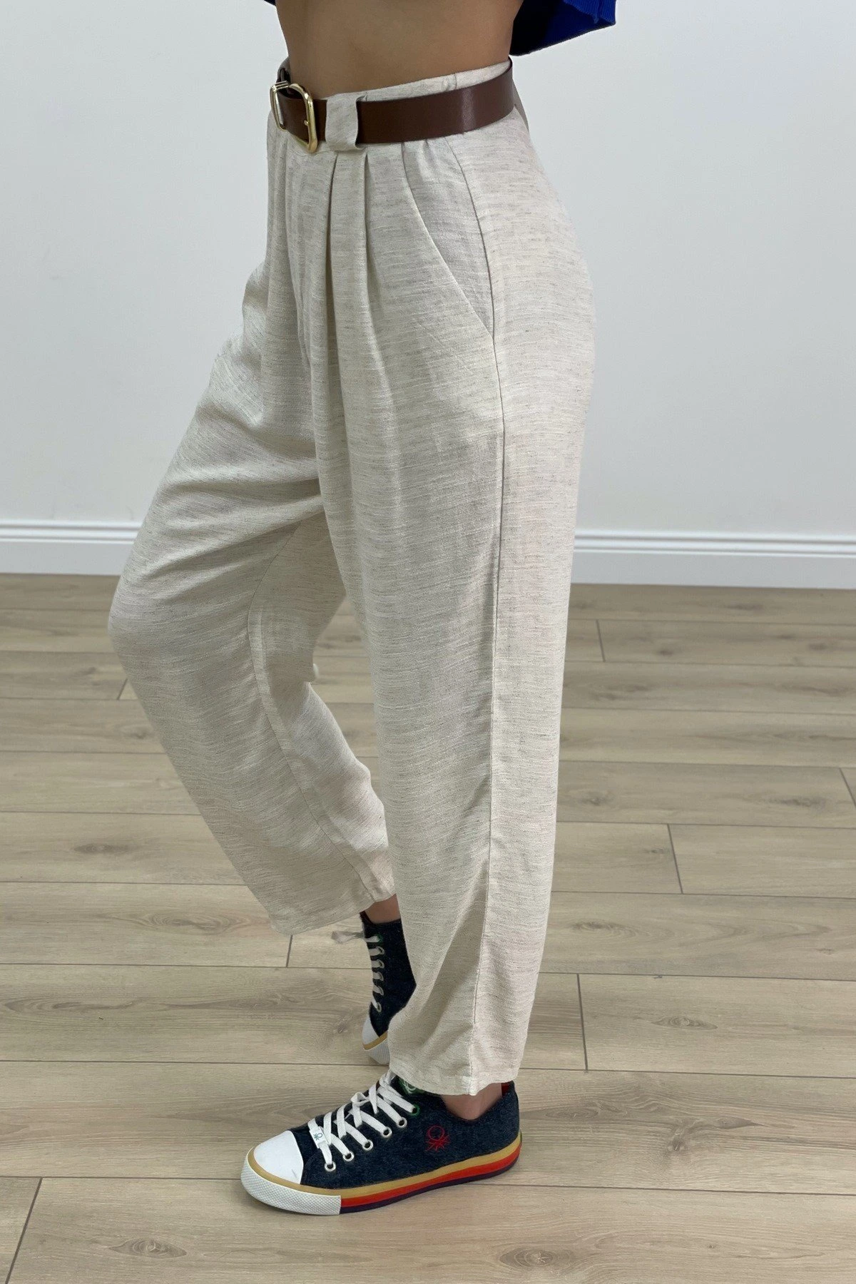 KEMERLİ ÇİFT PİLE VİSKON PANTOLON – NATUREL