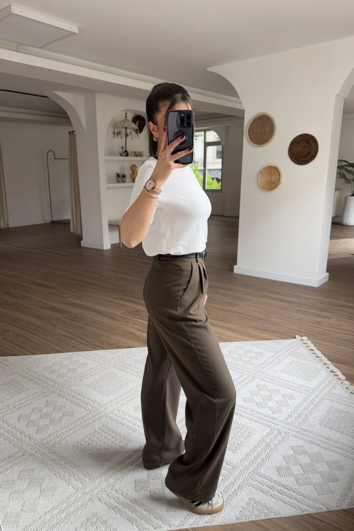 KEMERLİ ÖN PİLİ VİSKON BOL PAÇA KUMAŞ PANTOLON – KOYU KAHVE