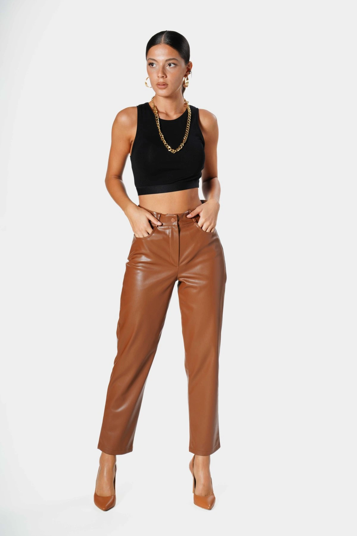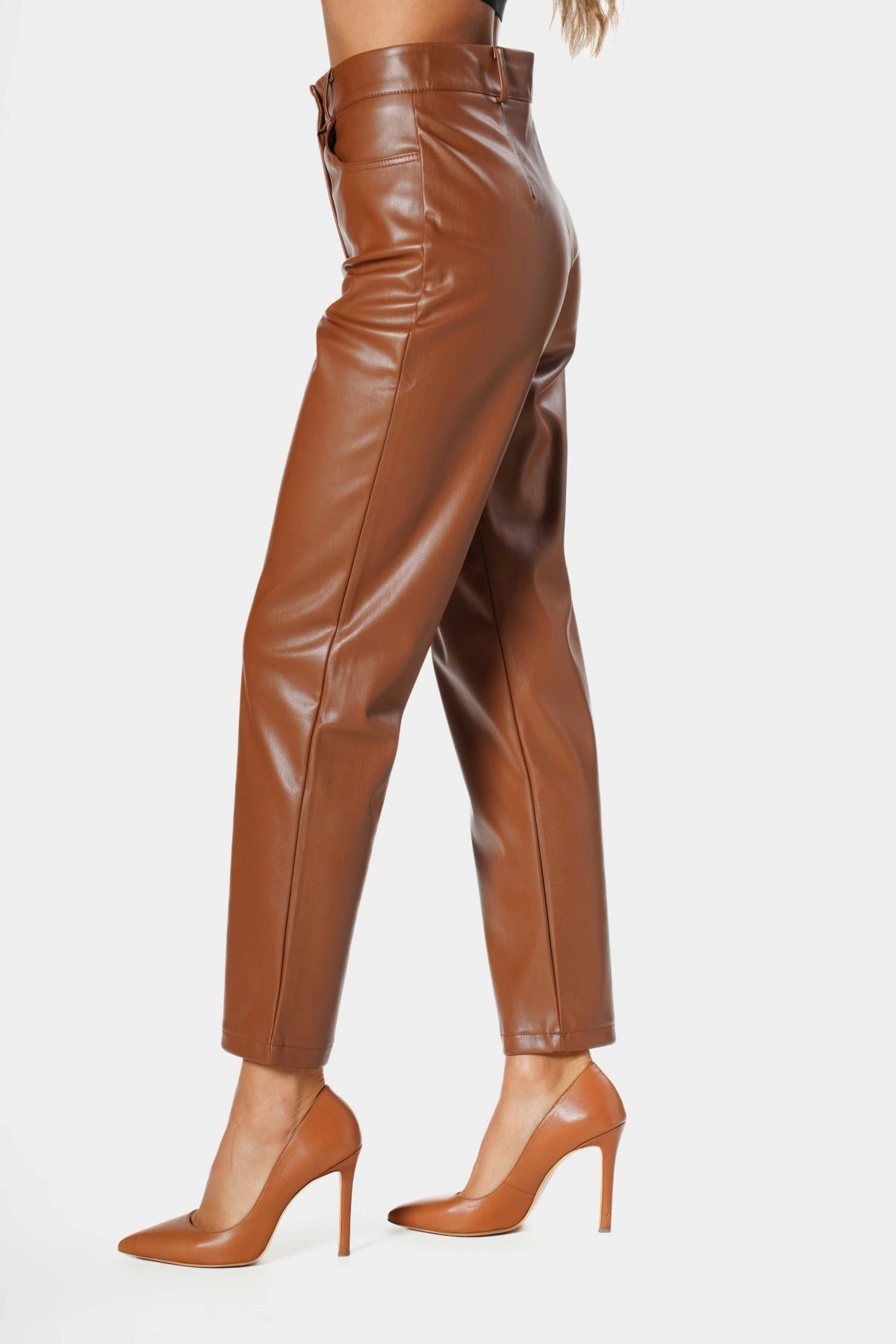 KOT CEPLİ DERİ PANTOLON – TABA