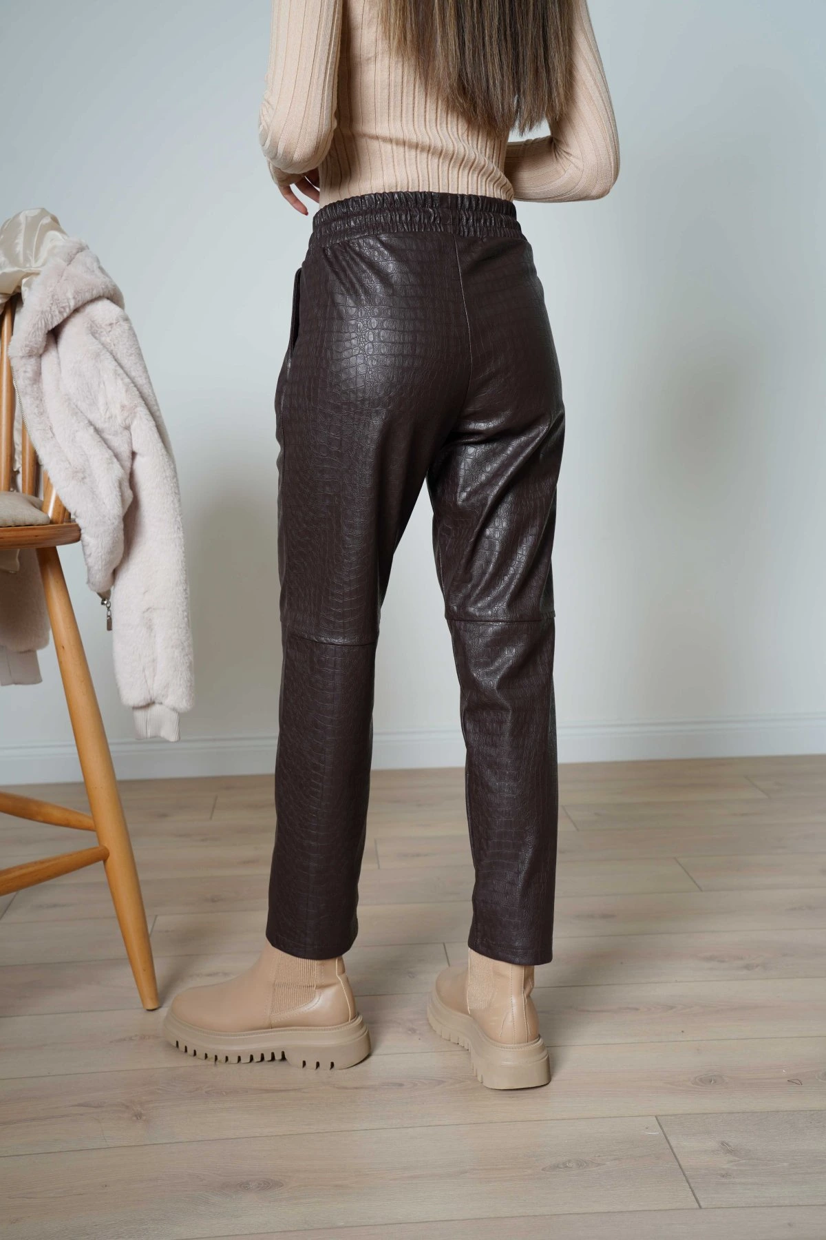 KROKODİL DESEN DİZ DİKİŞLİ DERİ PANTOLON – KAHVE