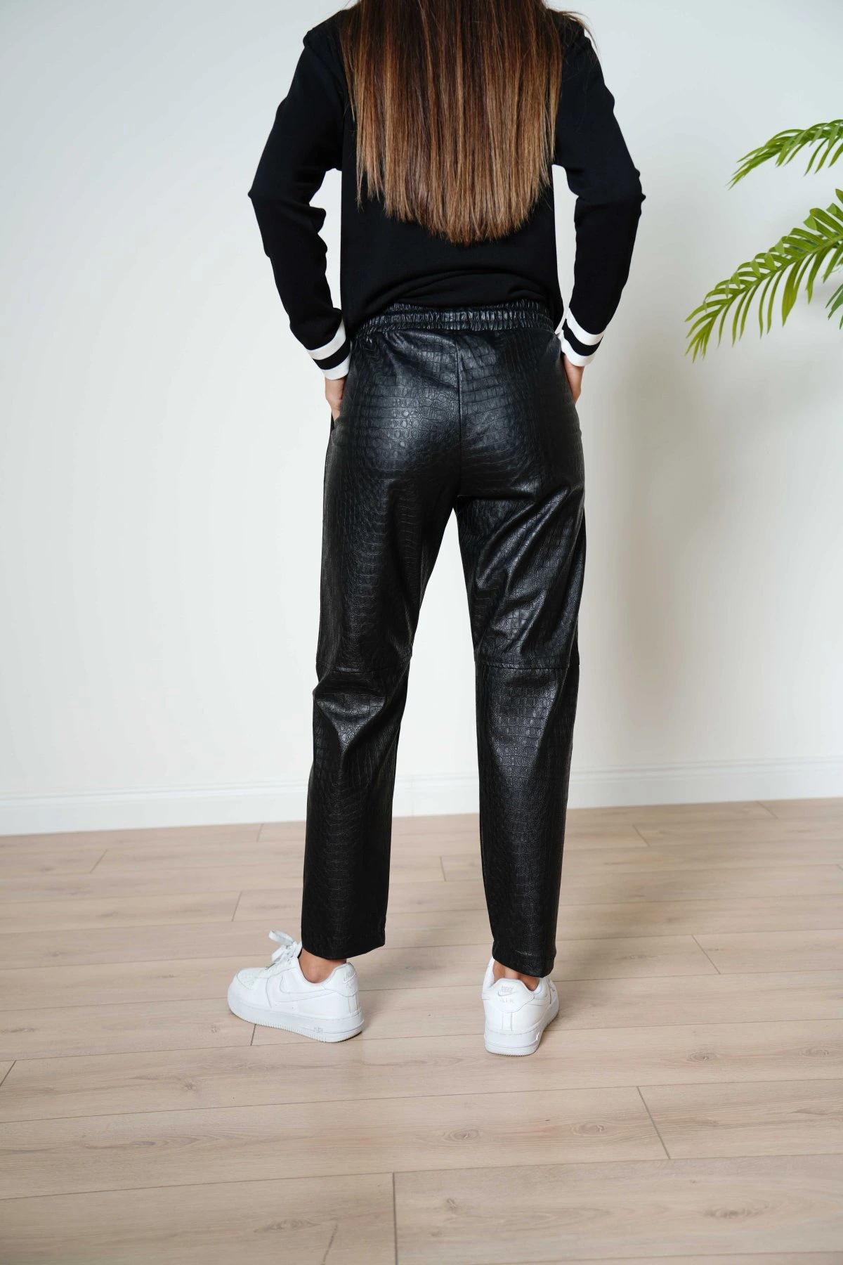 KROKODİL DESEN DİZ DİKİŞLİ DERİ PANTOLON – SİYAH