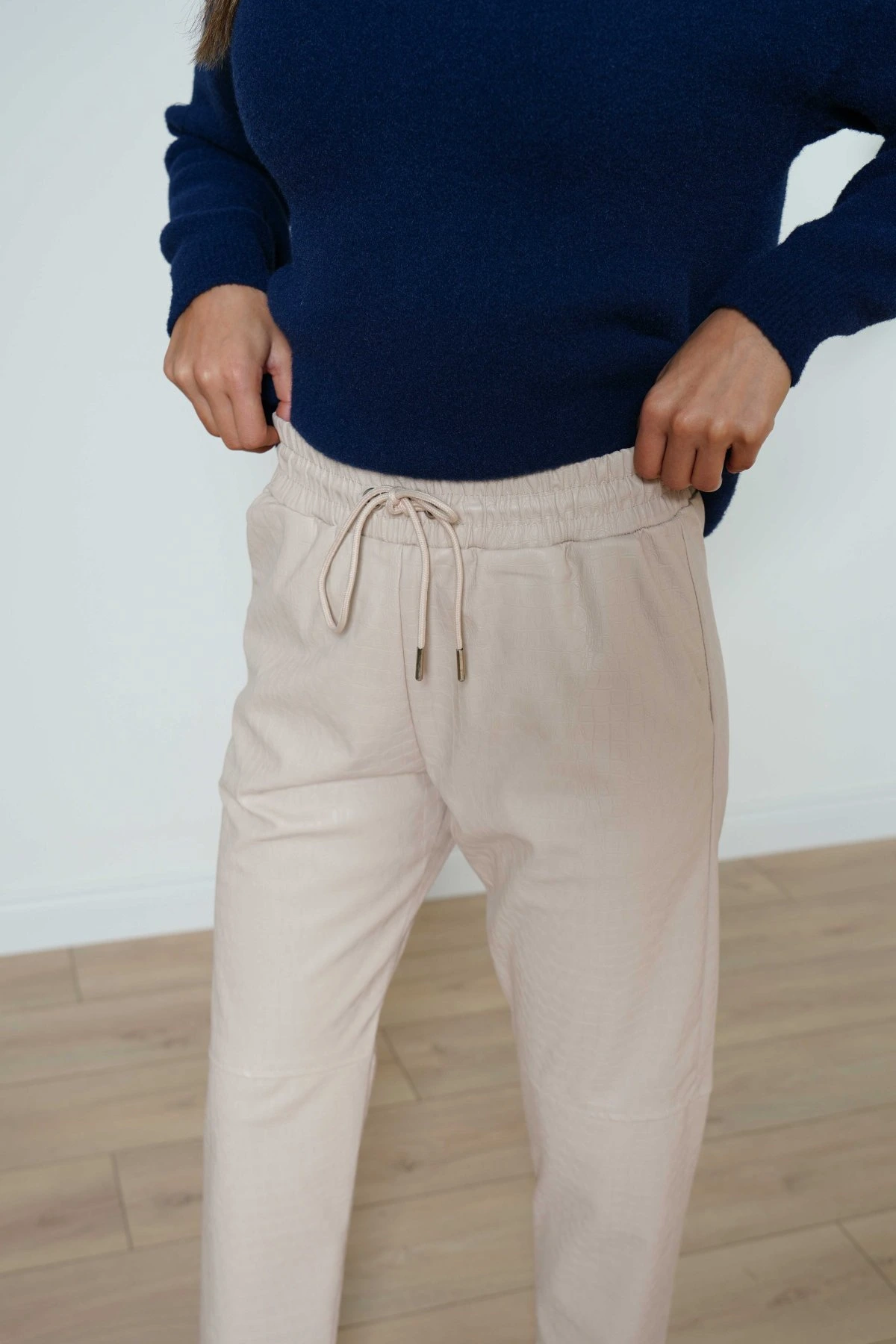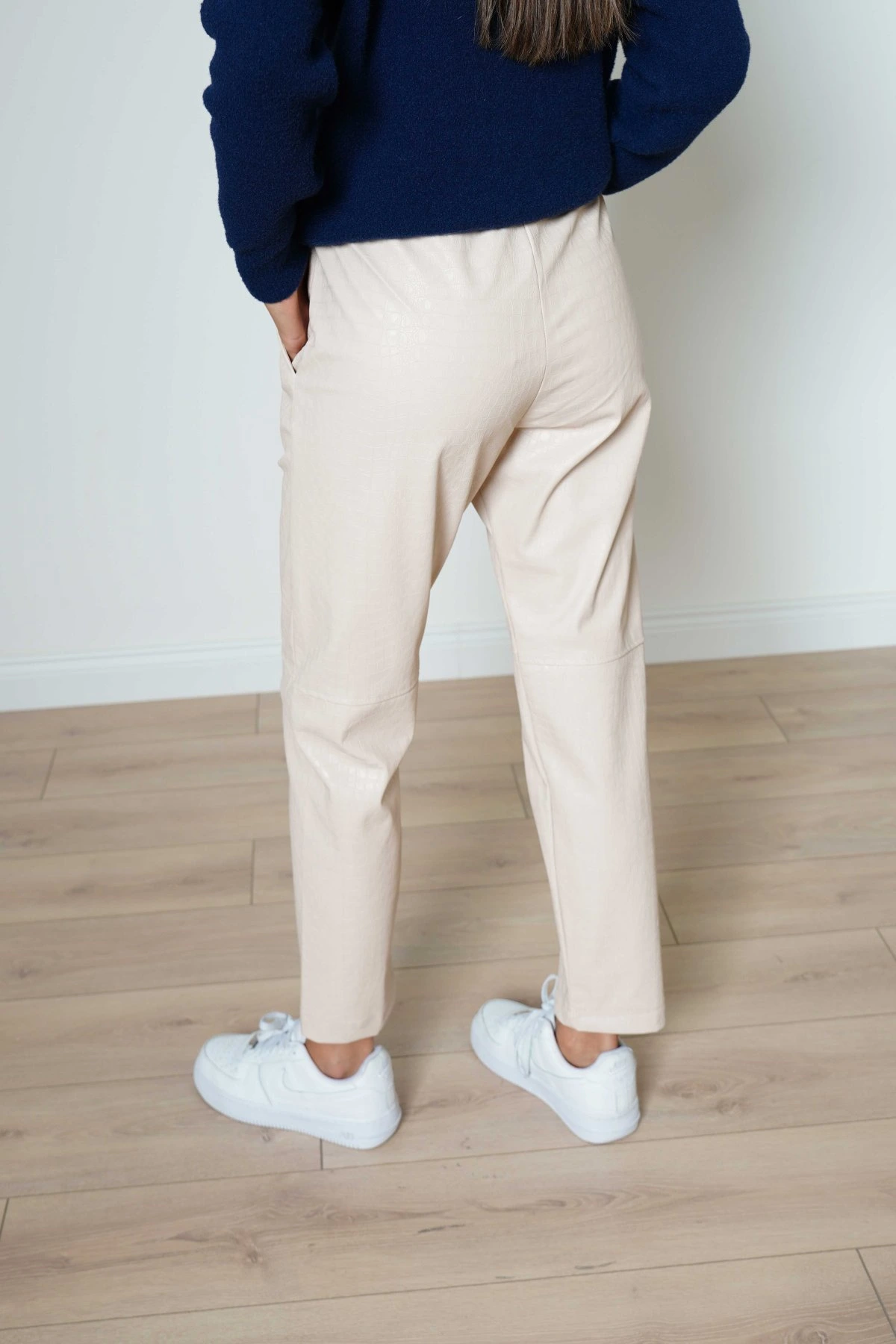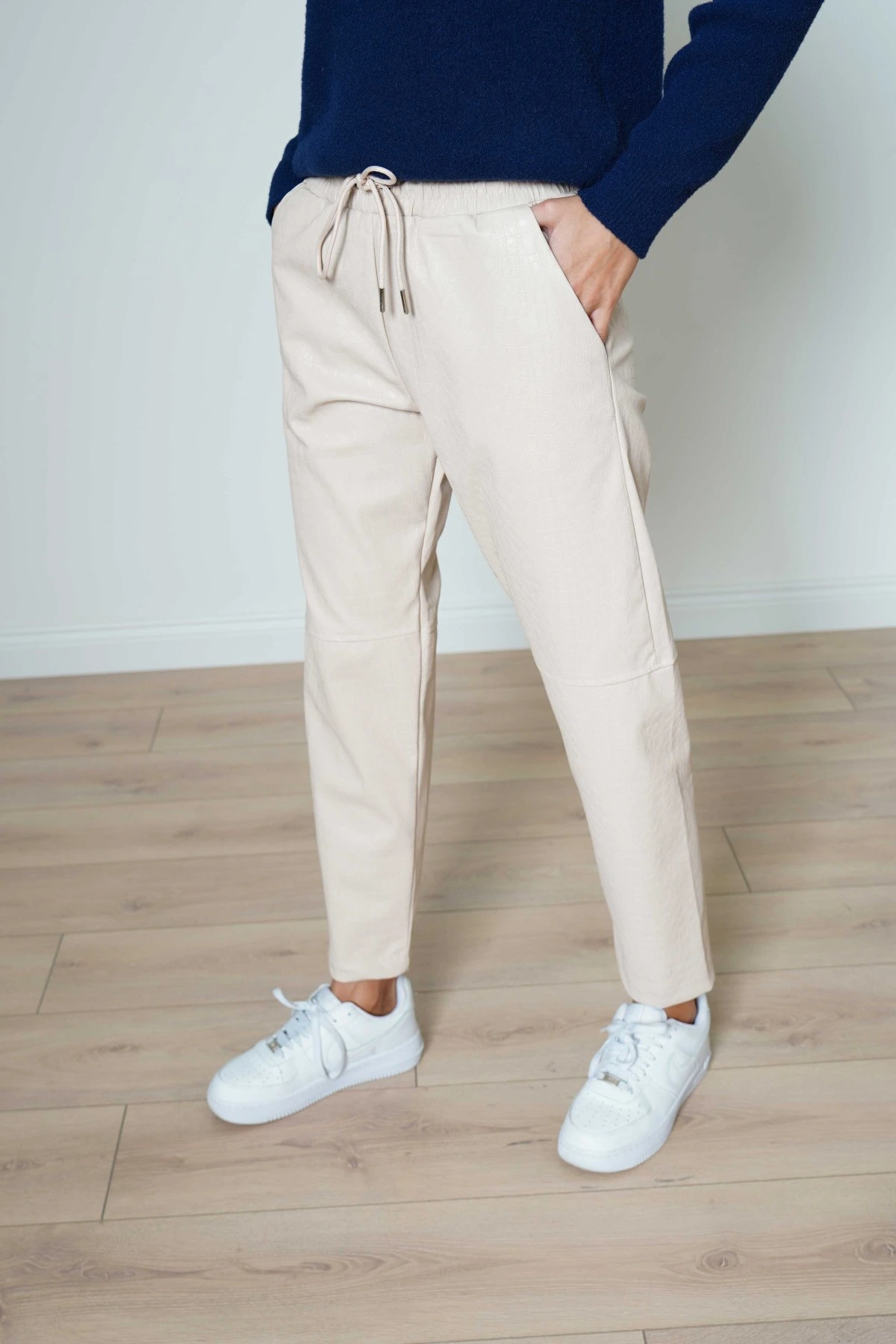 KROKODİL DESEN DİZ DİKİŞLİ DERİ PANTOLON – TAŞ