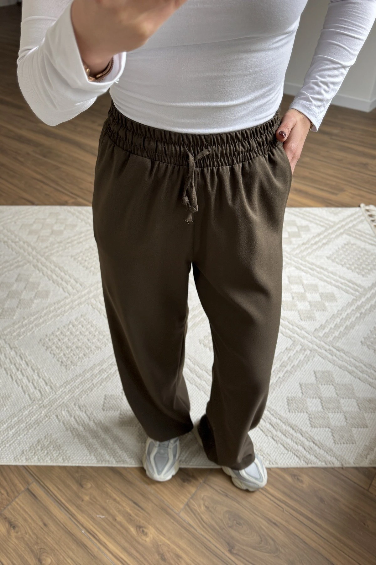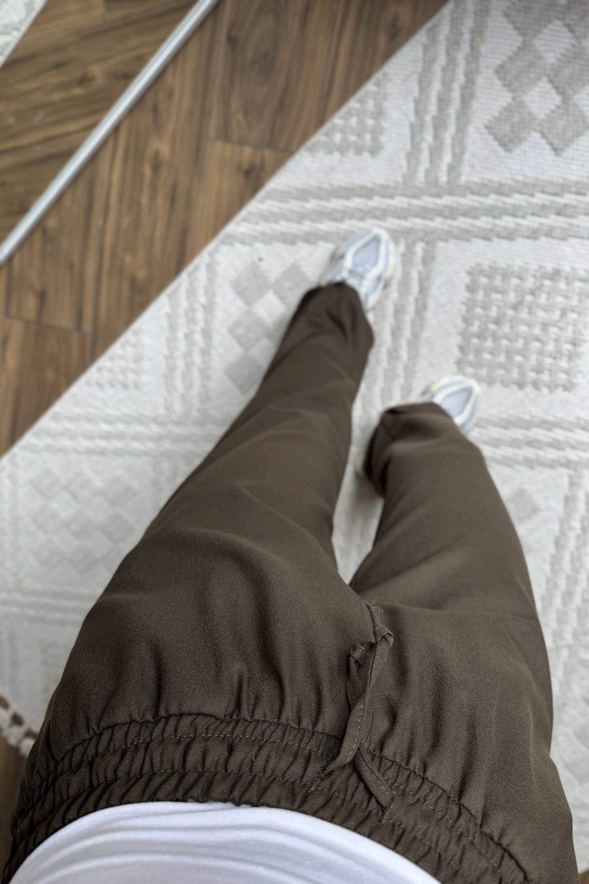 LASTİK BOL PAÇA CEPLİ VİSKON RAHAT PANTOLON – KAHVE