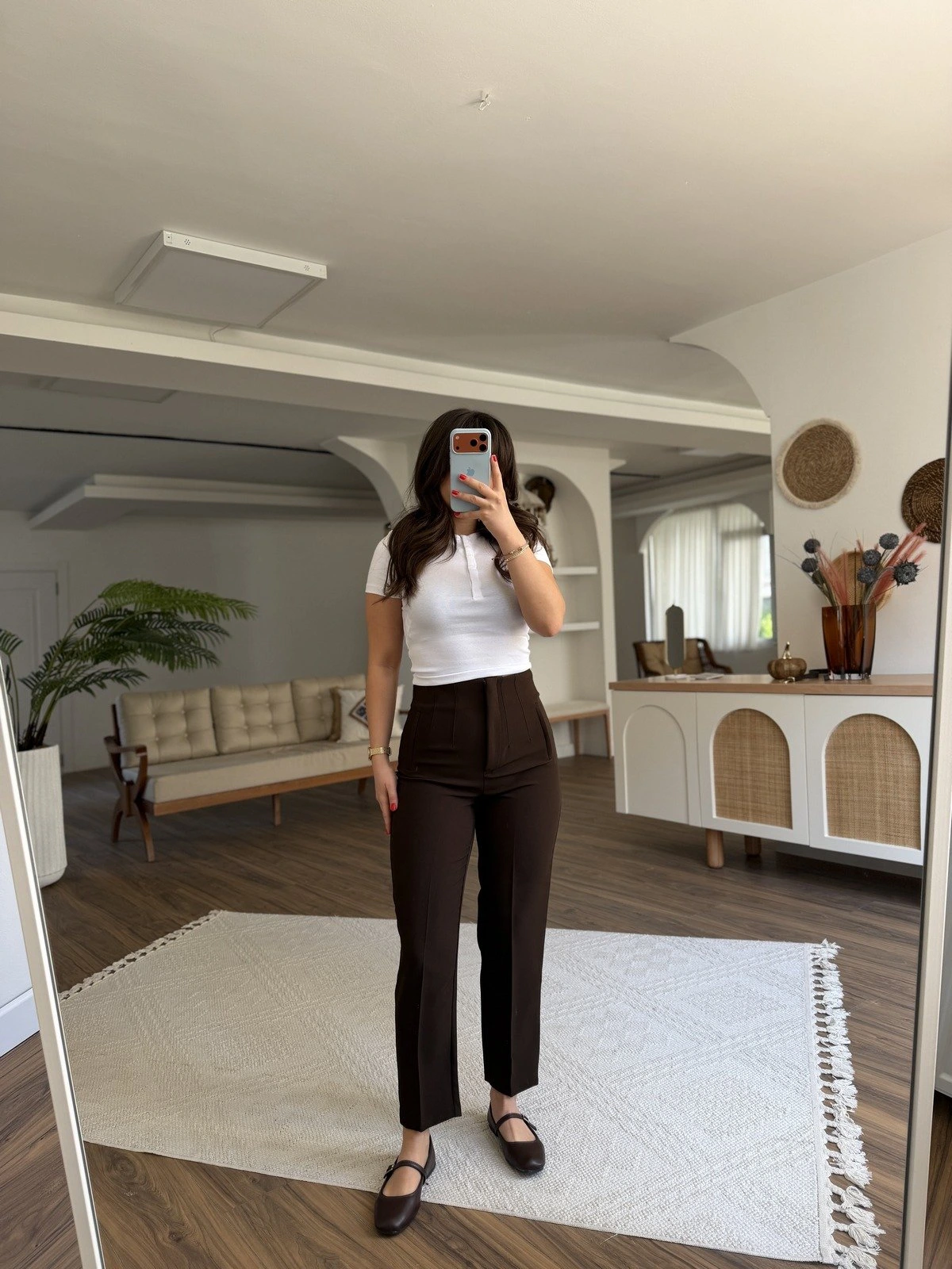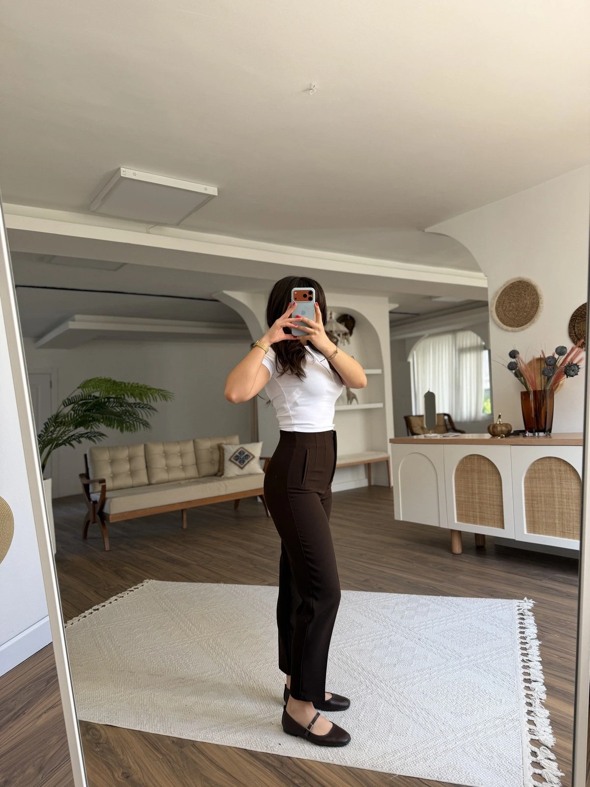 ÖN ARKA PENSLİ HAVUÇ MODEL LİKRALI PANTOLON – KAHVE
