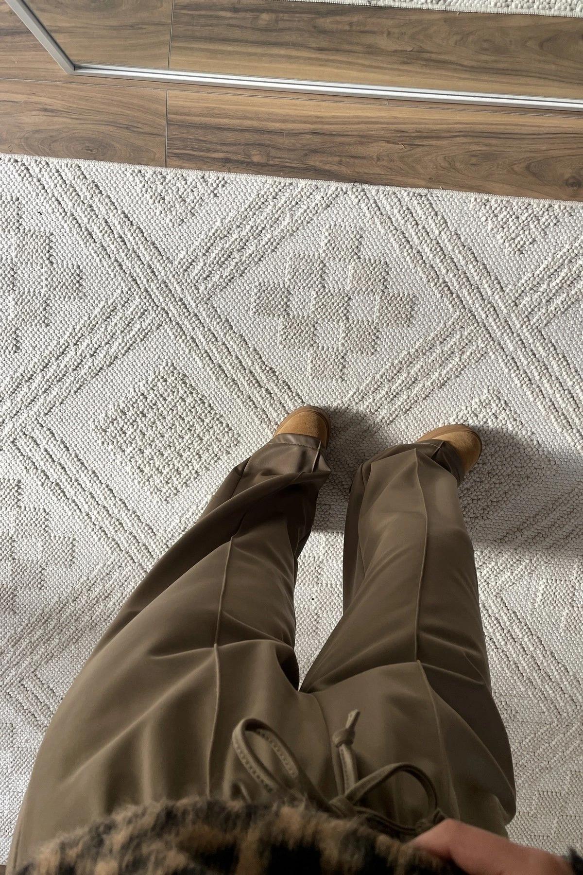 ÖN DİKİŞ ÖRME DERİ GÖRÜNÜMLÜ BOL PAÇA PANTOLON – HAKİ