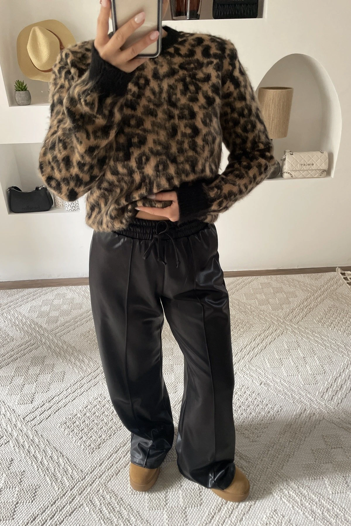 ÖN DİKİŞ ÖRME DERİ GÖRÜNÜMLÜ BOL PAÇA PANTOLON – SİYAH