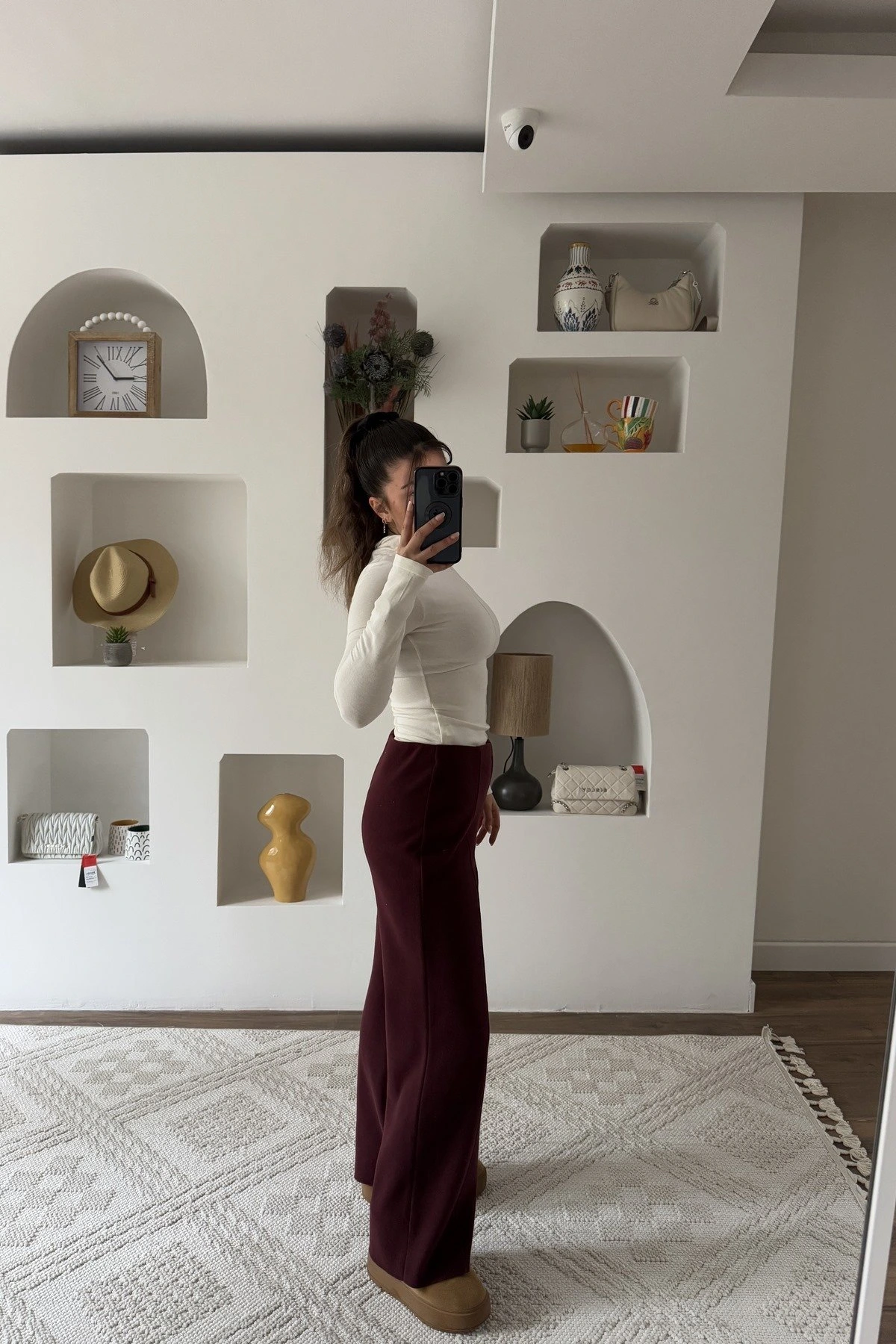 ÖN DİKİŞ SELANİK ÖRGÜ BEL LASTİK PAMUK PANTOLON – BORDO