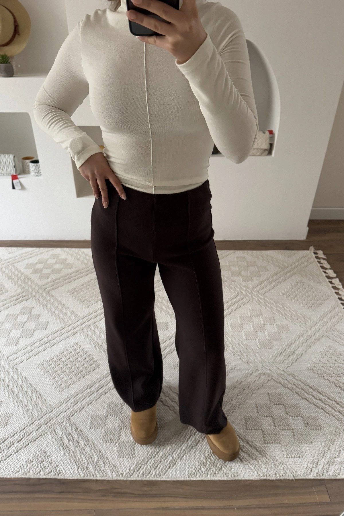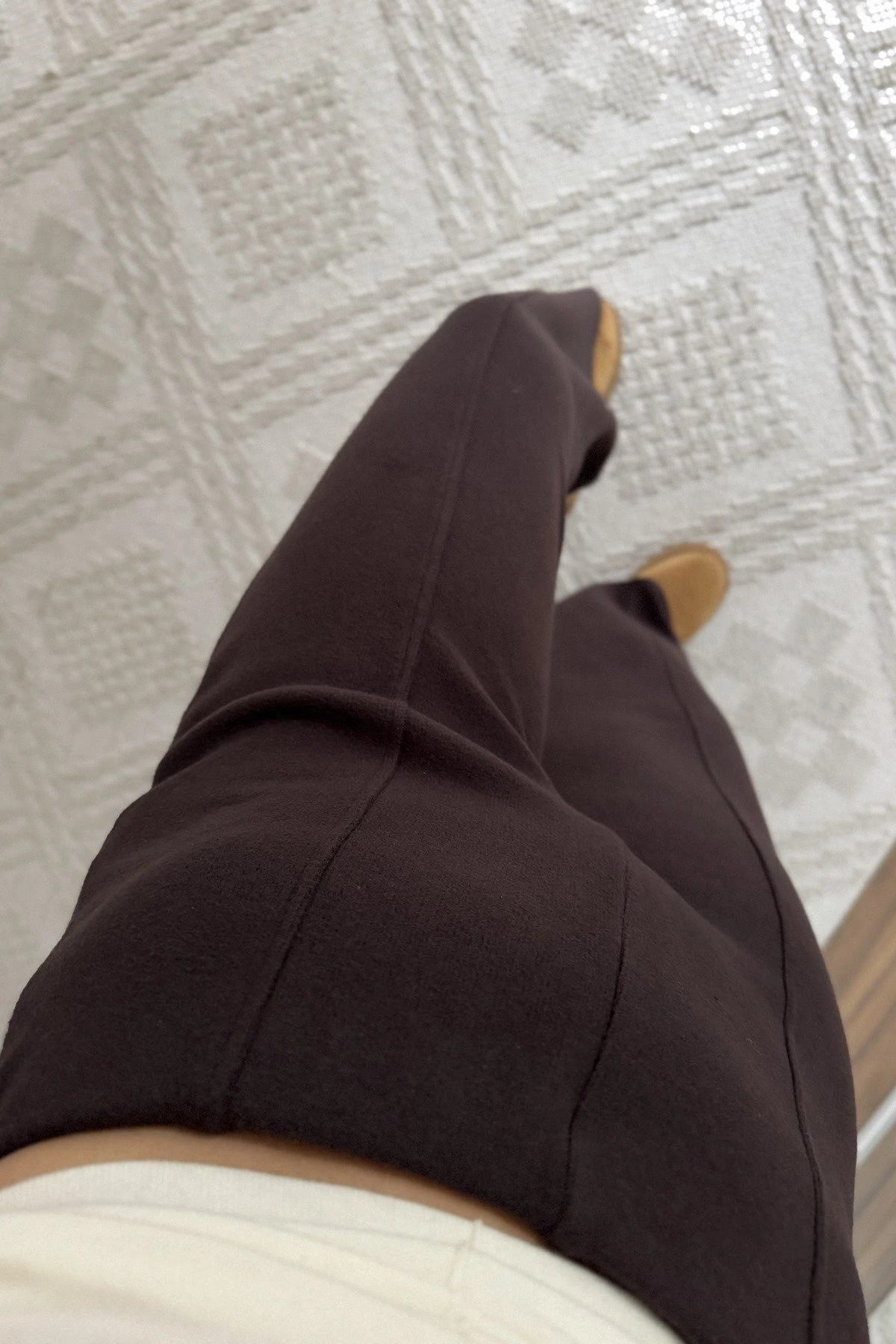 ÖN DİKİŞ SELANİK ÖRGÜ BEL LASTİK PAMUK PANTOLON – KAHVE