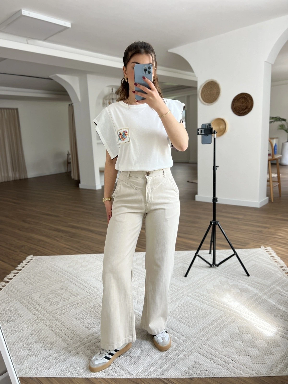 ÖN VEREV DİKİŞ DETAY BRİTLİ GENİŞ PAÇA PANTOLON – TAŞ