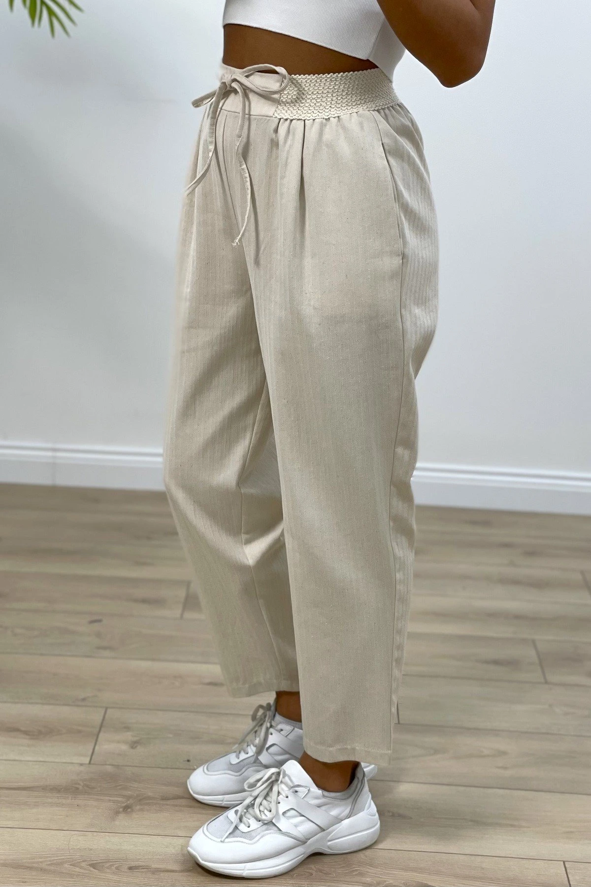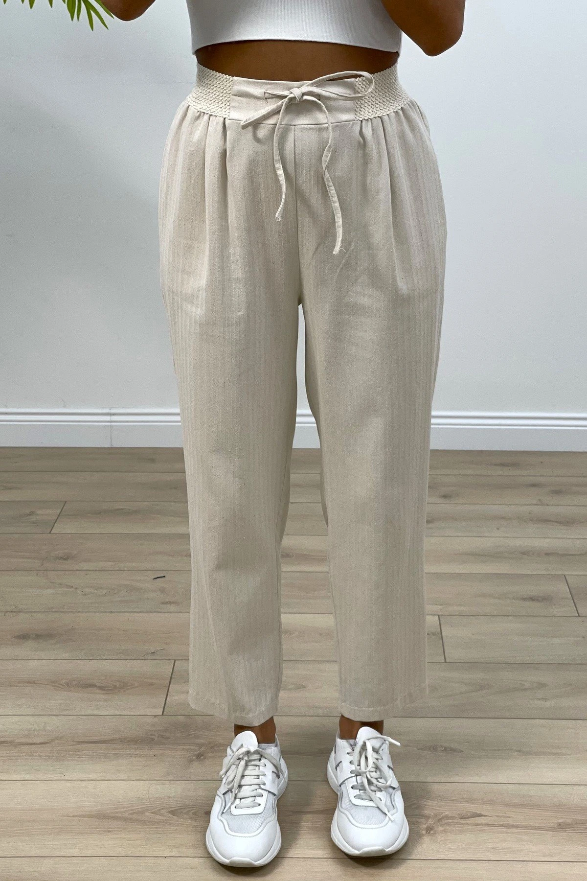 ÖRGÜ BEL ÇİFT PİLE RAHAT PANTOLON – BEJ
