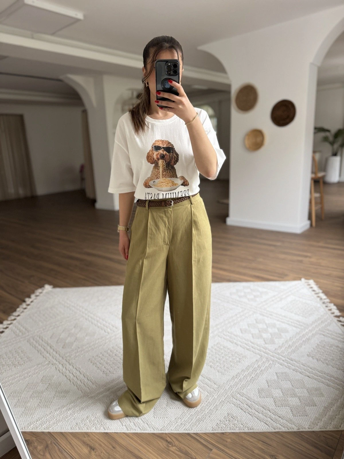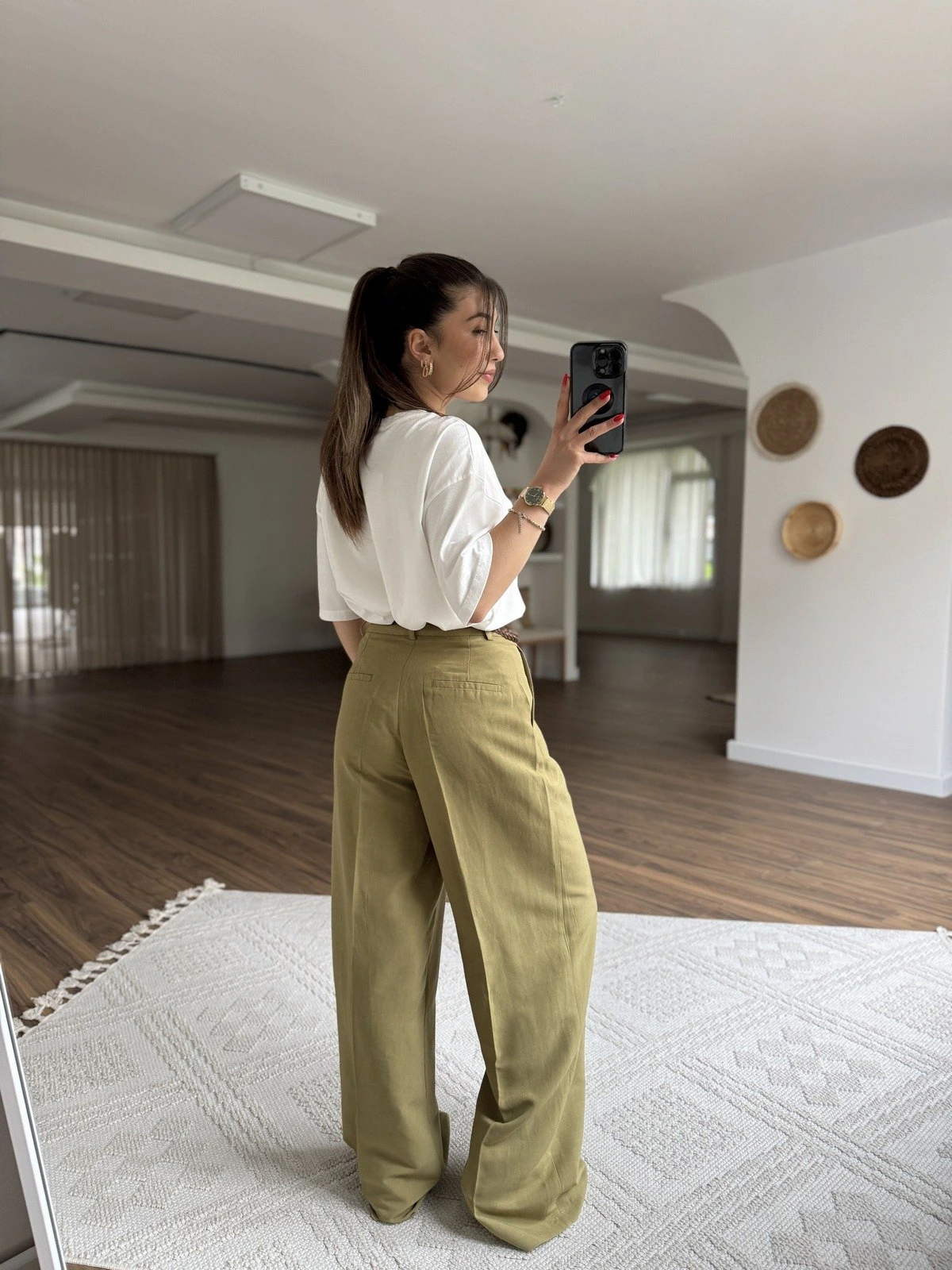 ÖRGÜ KEMER ÖN PİLİ VİSKON KETEN BOL PAÇA PANTOLON – HAKİ