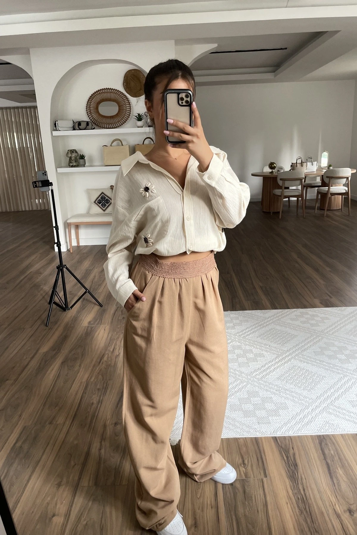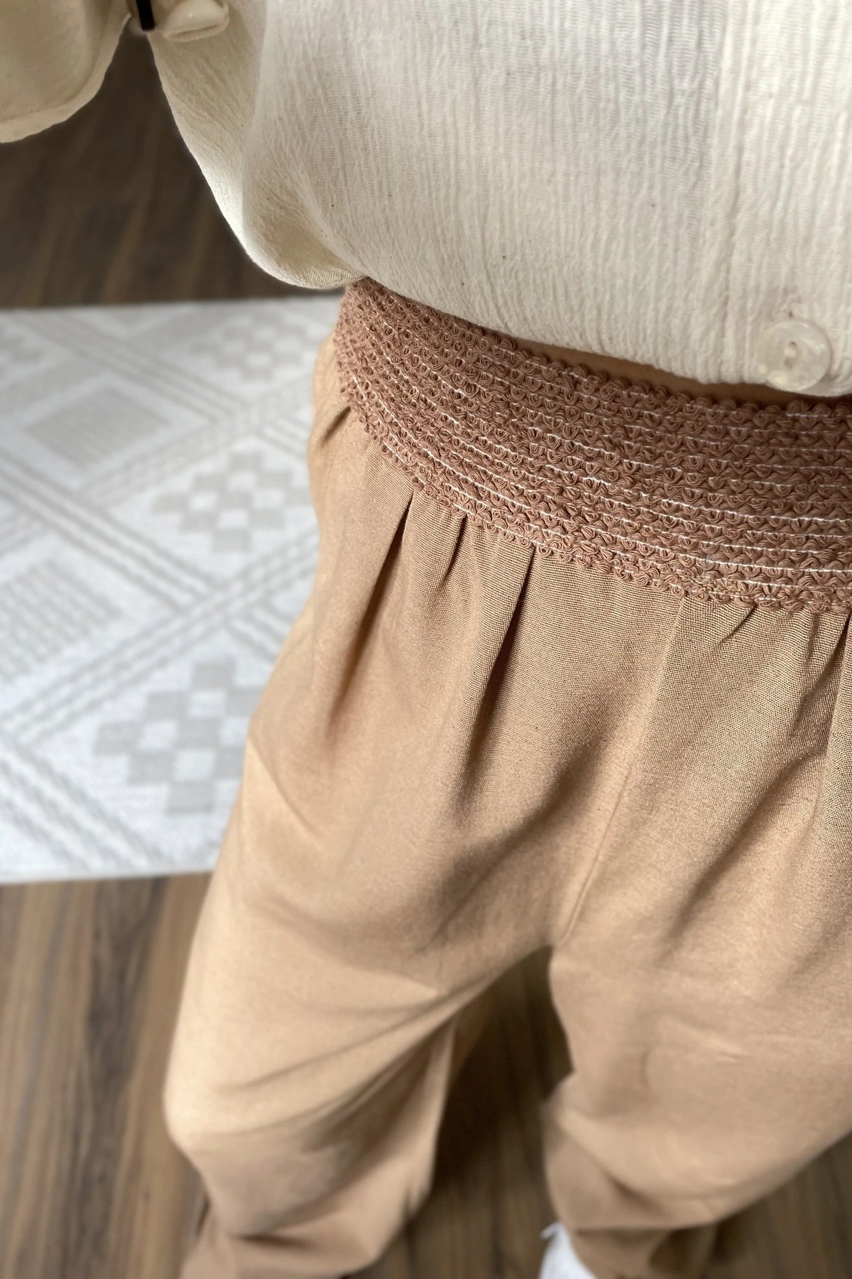 ÖRGÜ LASTİK KEMER CEPLİ BOL PAÇA VİSKON PANTOLON – CAMEL