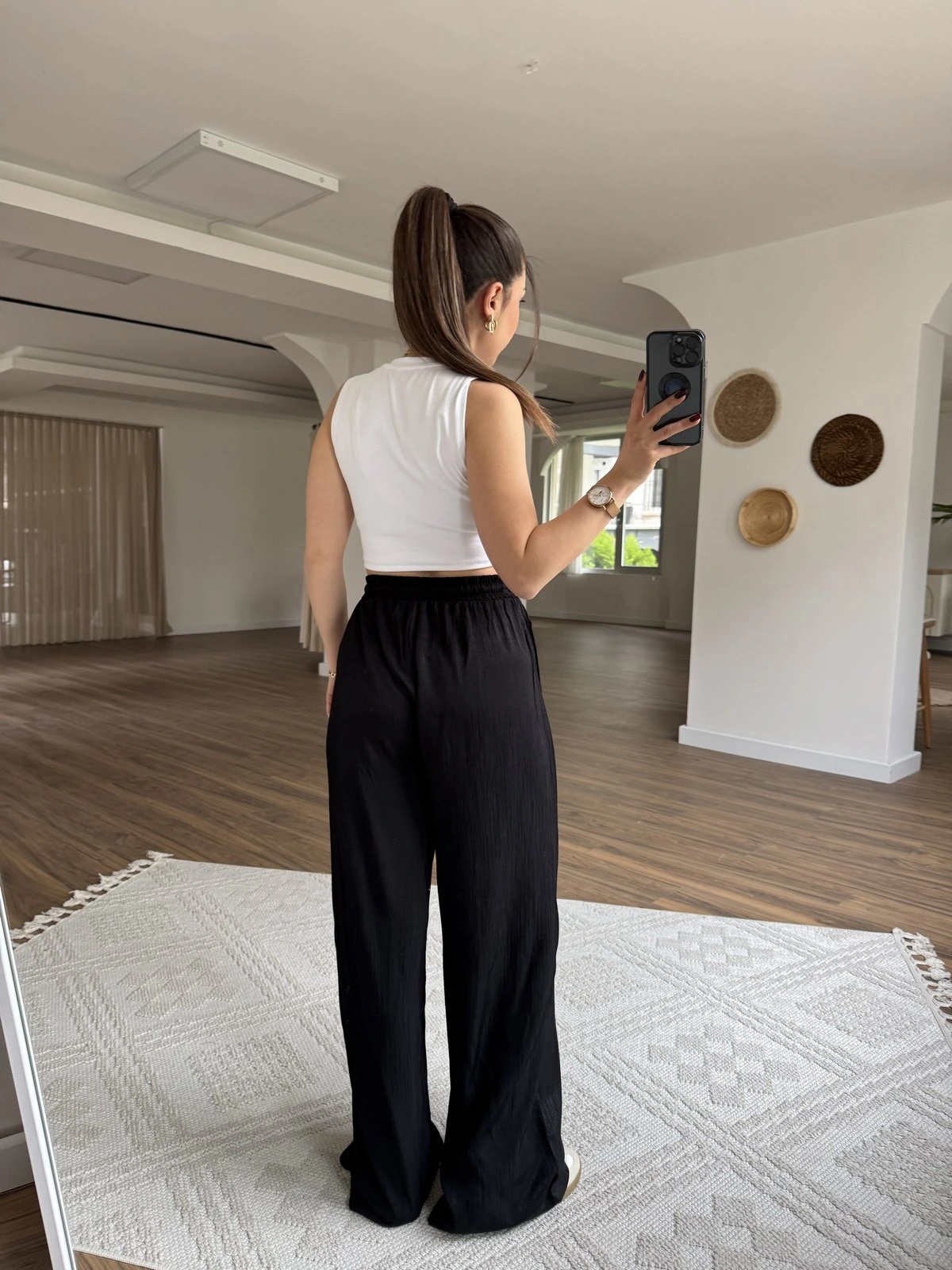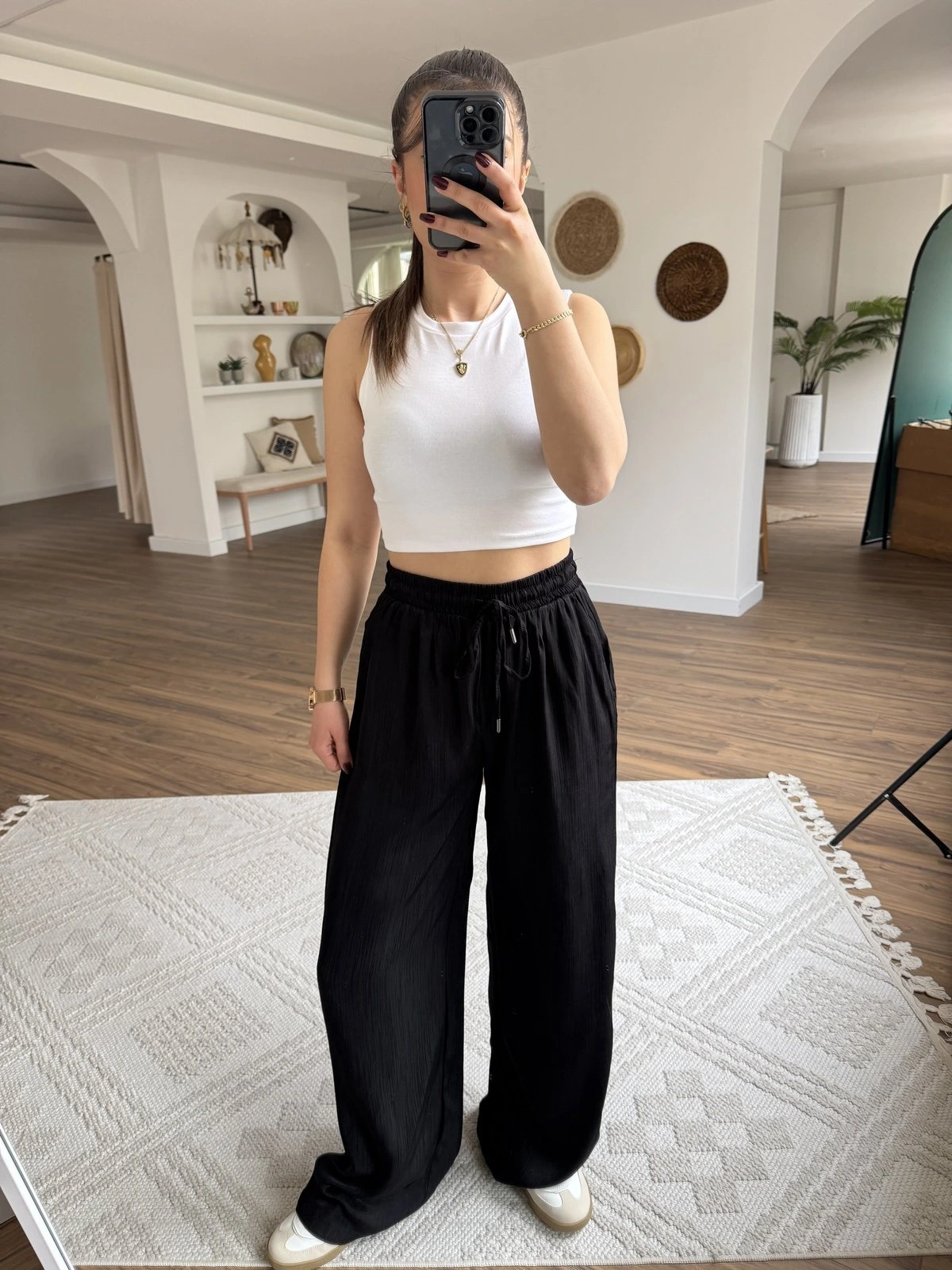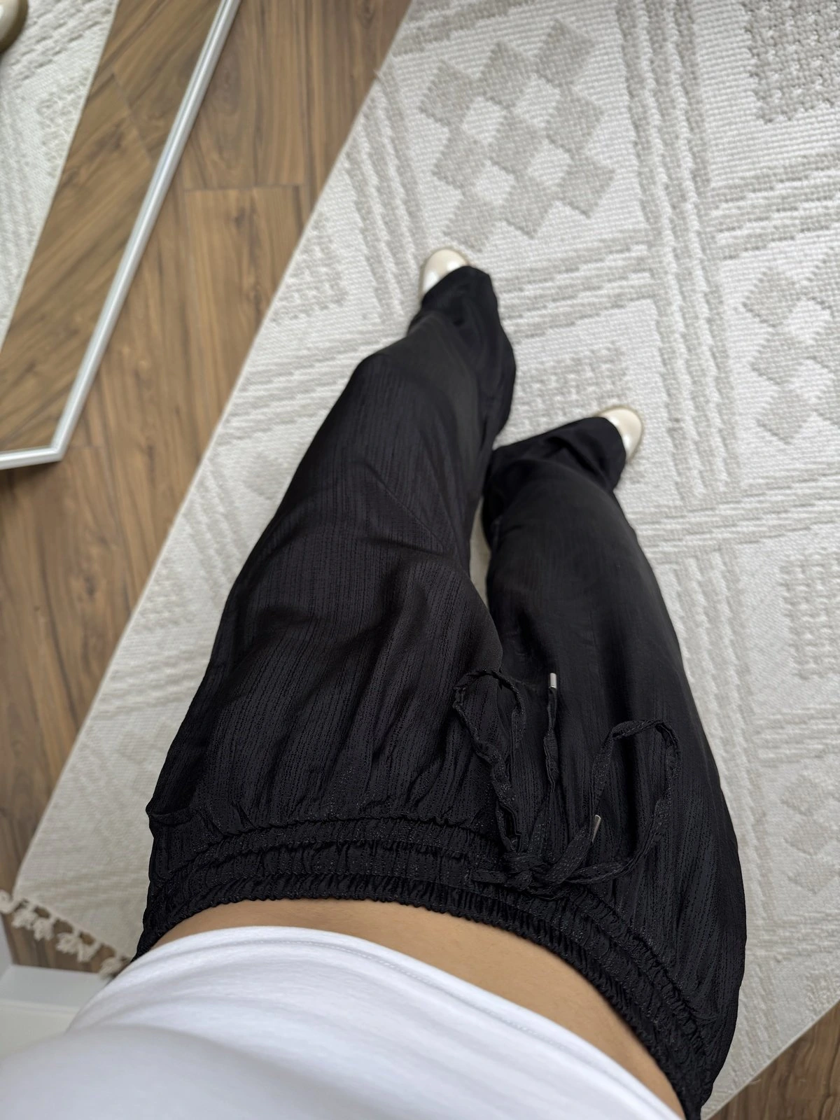 PARLAK ÇİZGİ DOKU İPEK VİSKON RAHAT PANTOLON – SİYAH