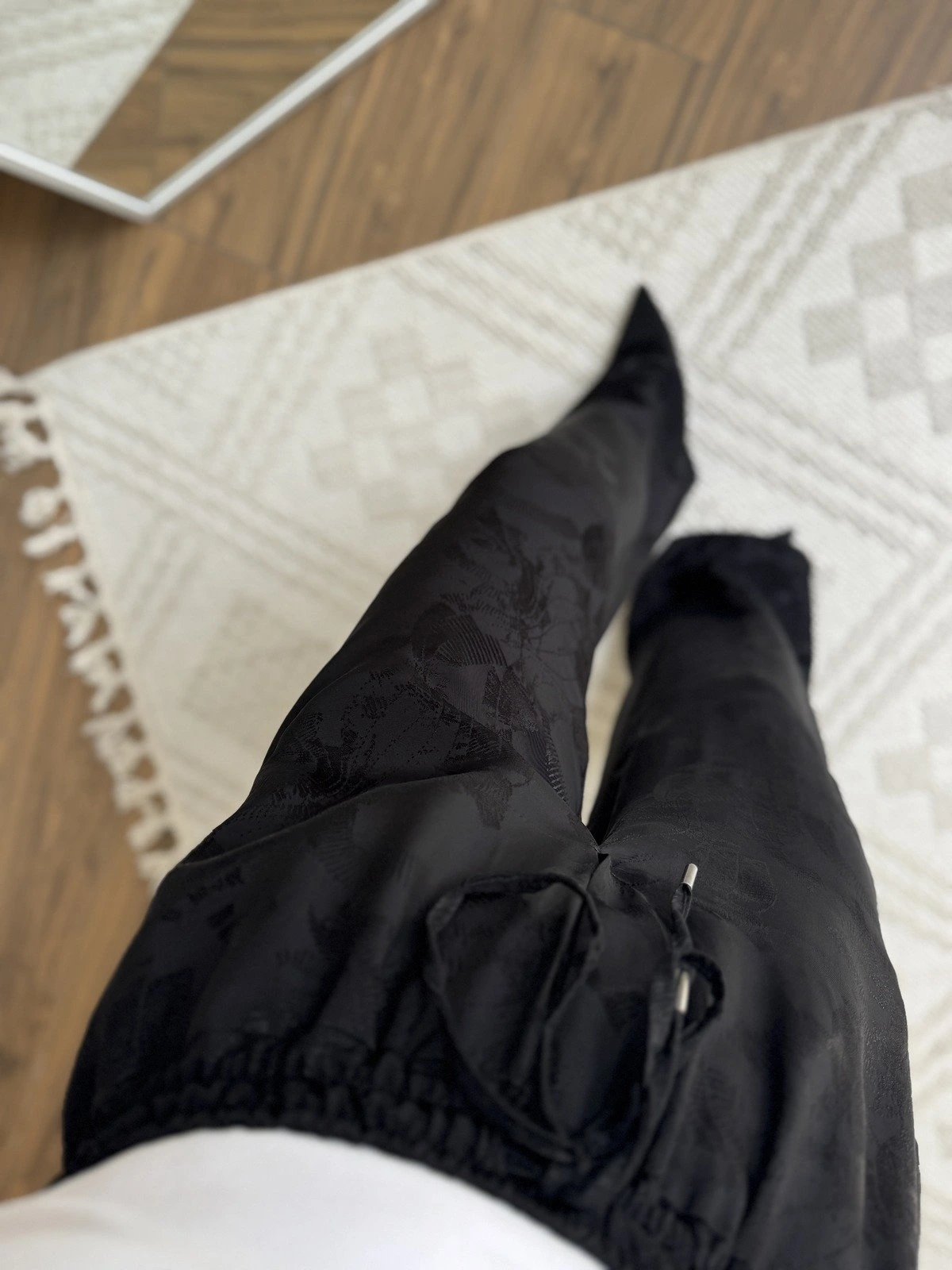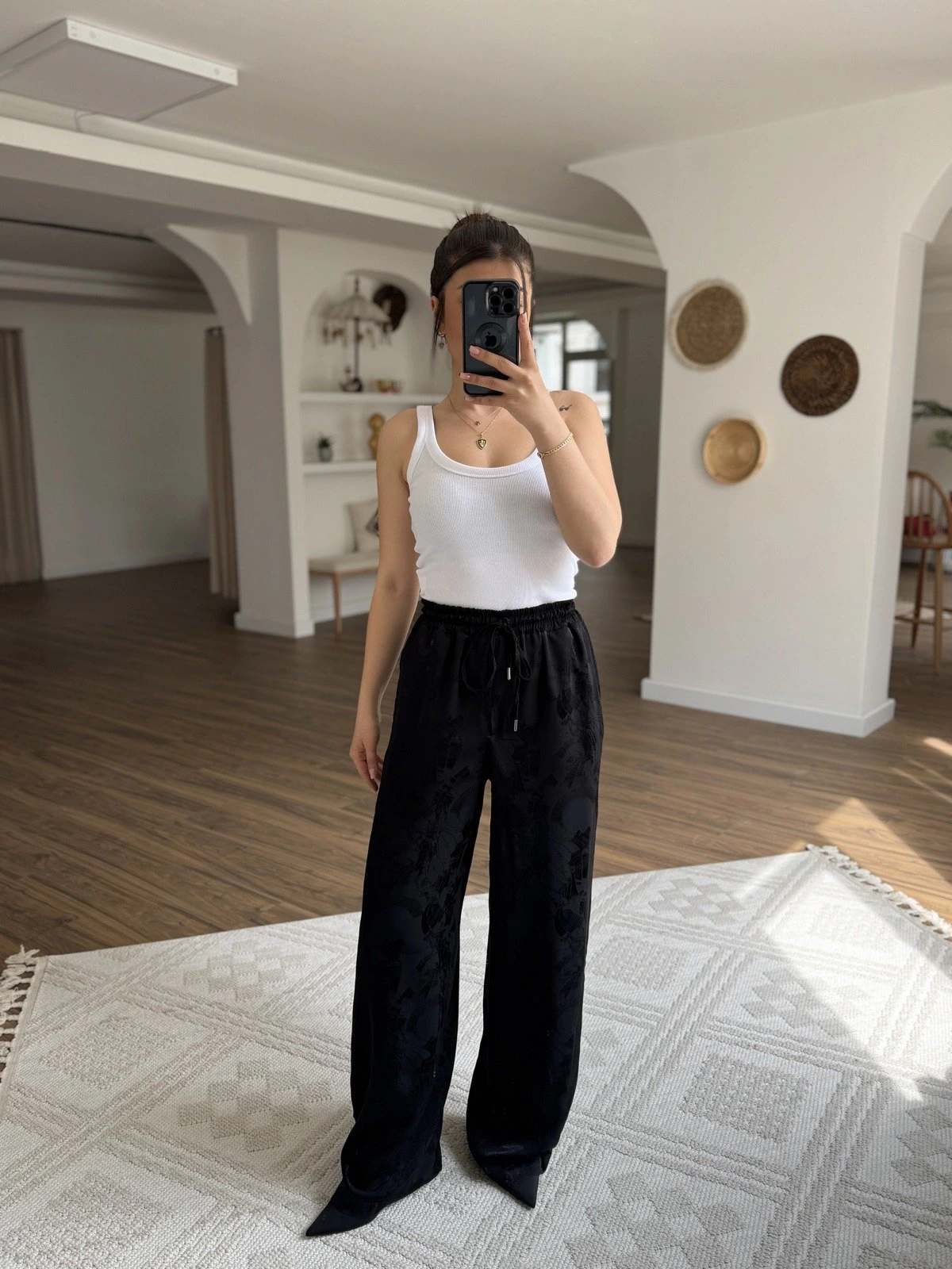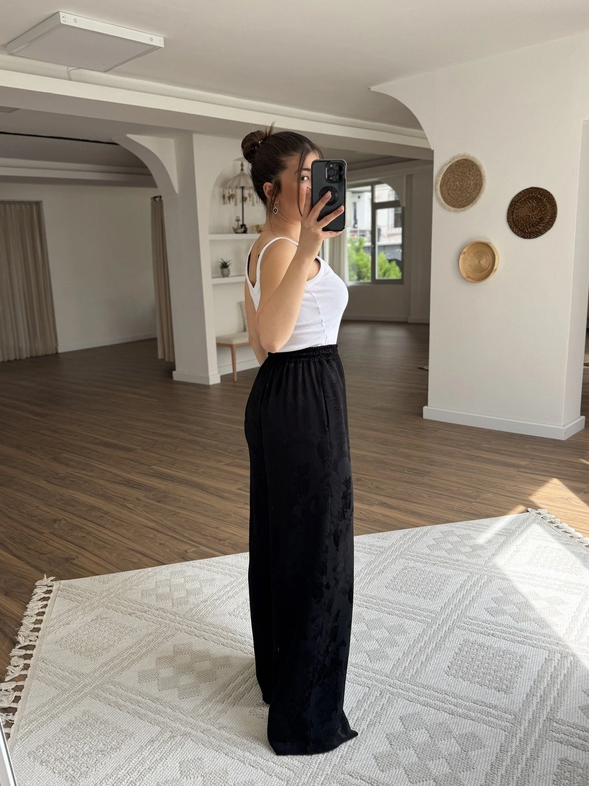 PARLAK DESEN DOKU İPEK VİSKON BEL LASTİK PANTOLON – SİYAH