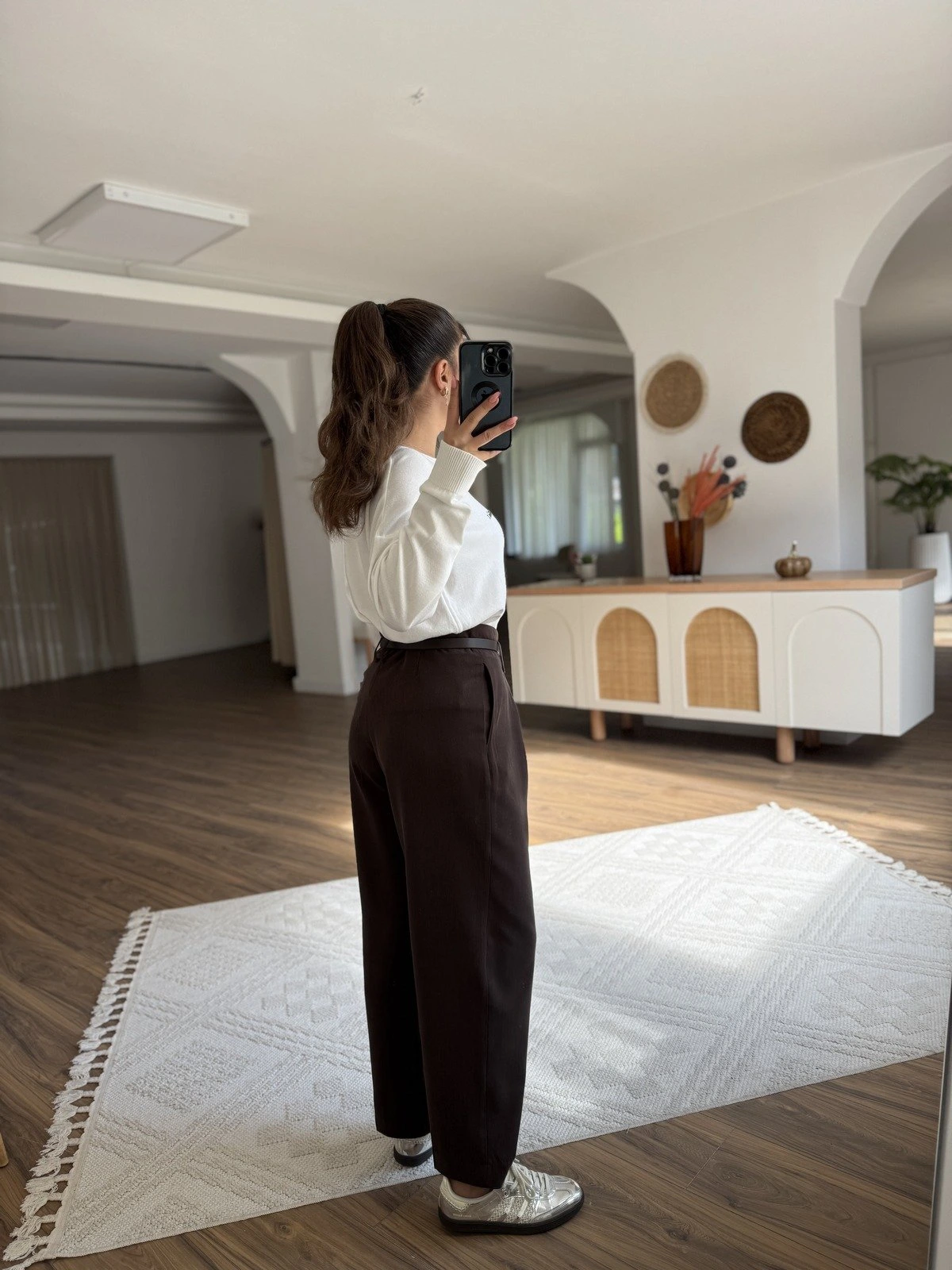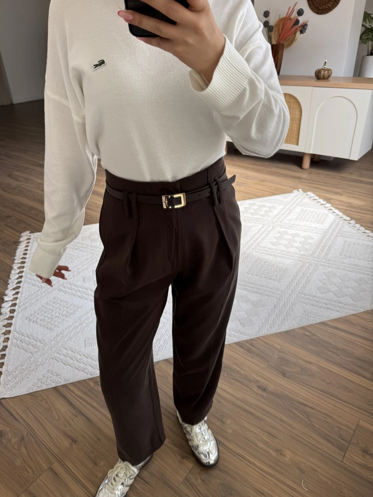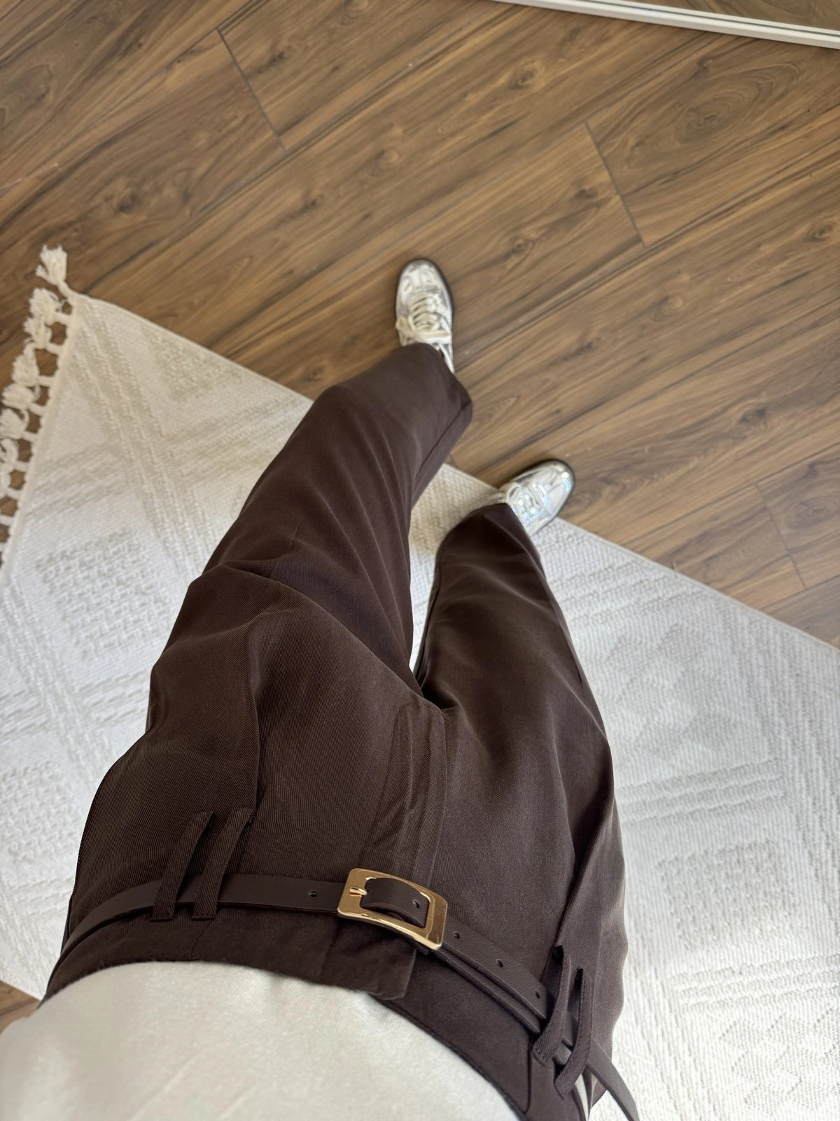 TENSEL KUMAŞ TEK PİLE CEPLİ KÖPRÜLÜ PANTOLON – KAHVE