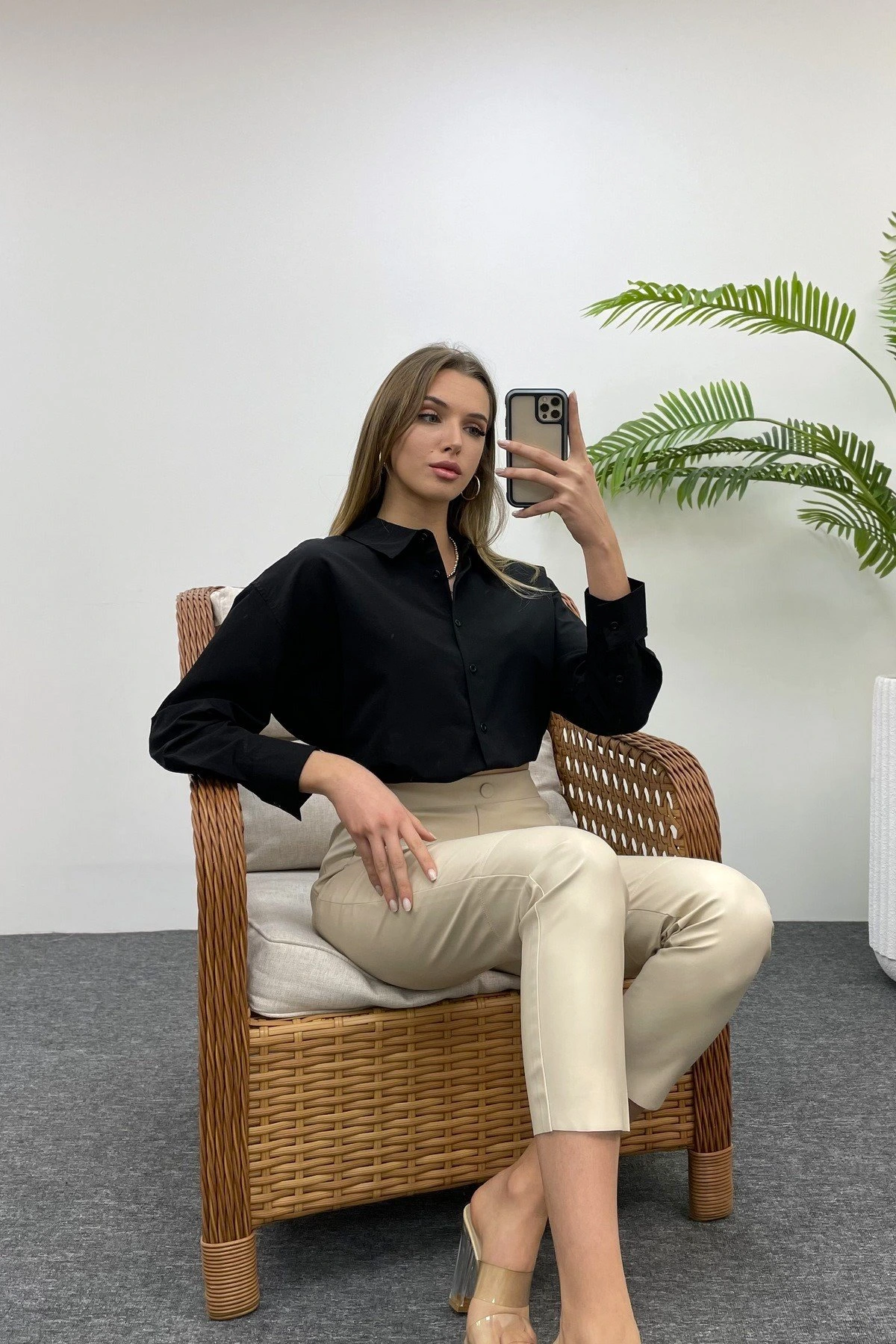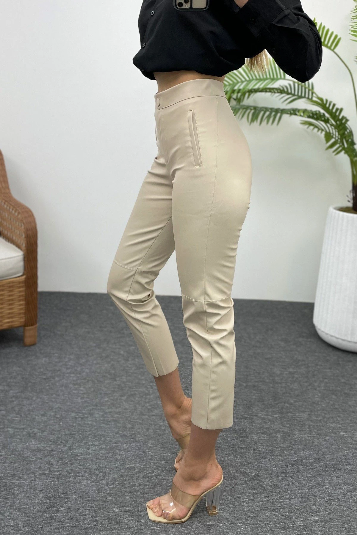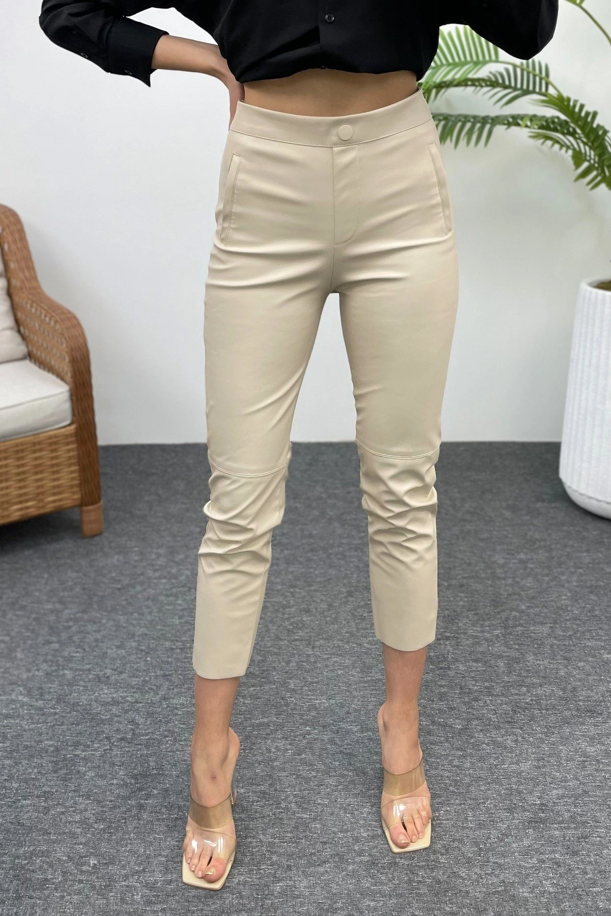 YAN FERMUARLI KESİK PAÇA DERİ PANTOLON – TAŞ