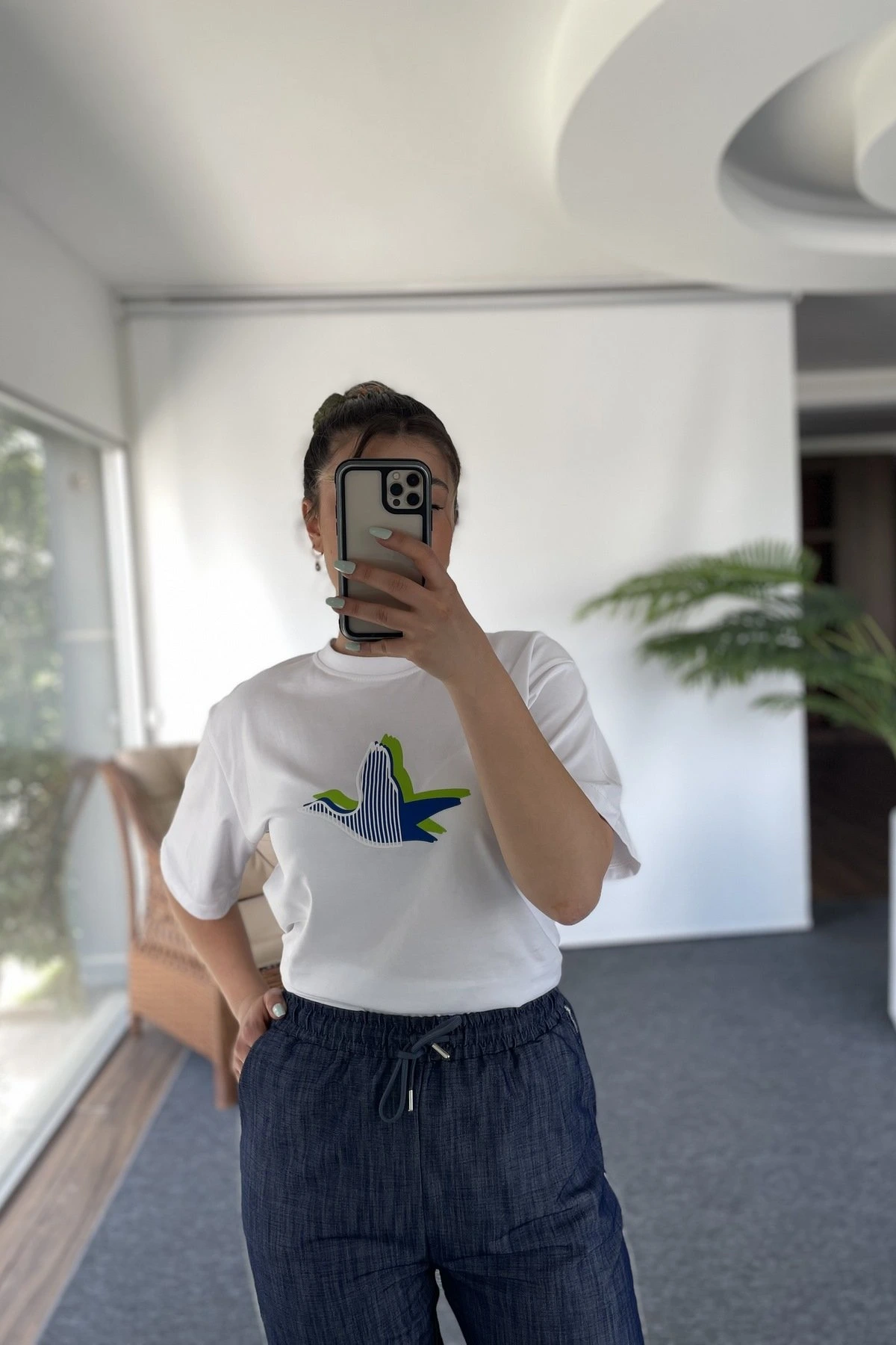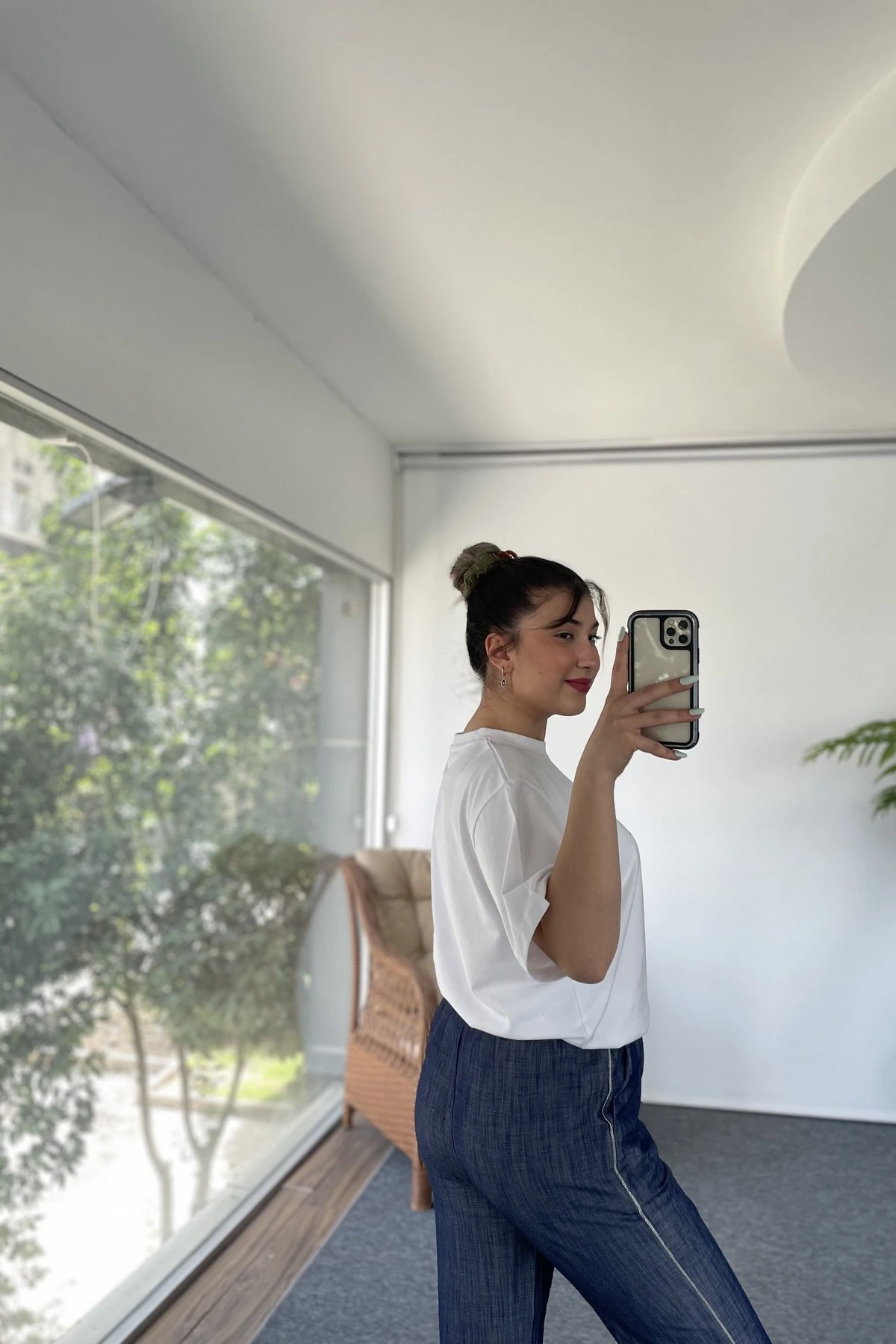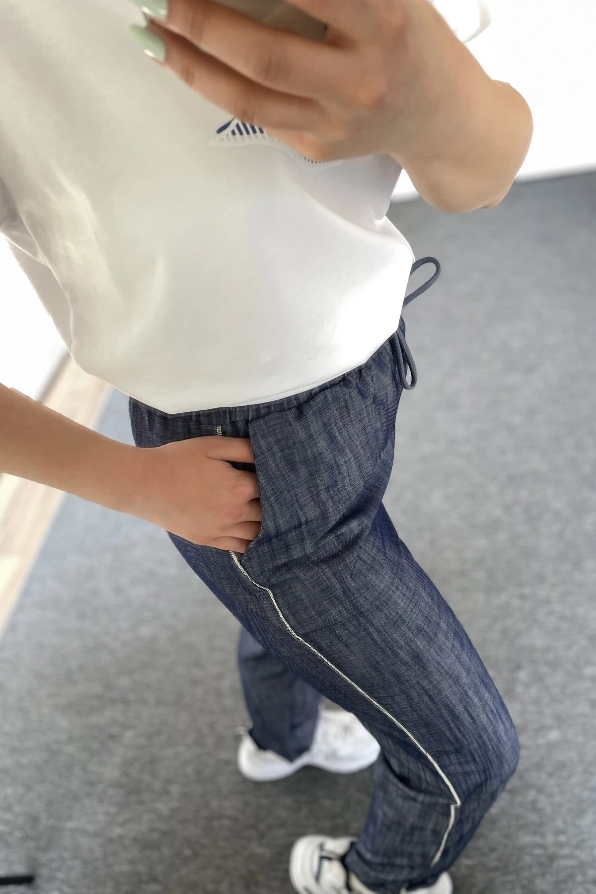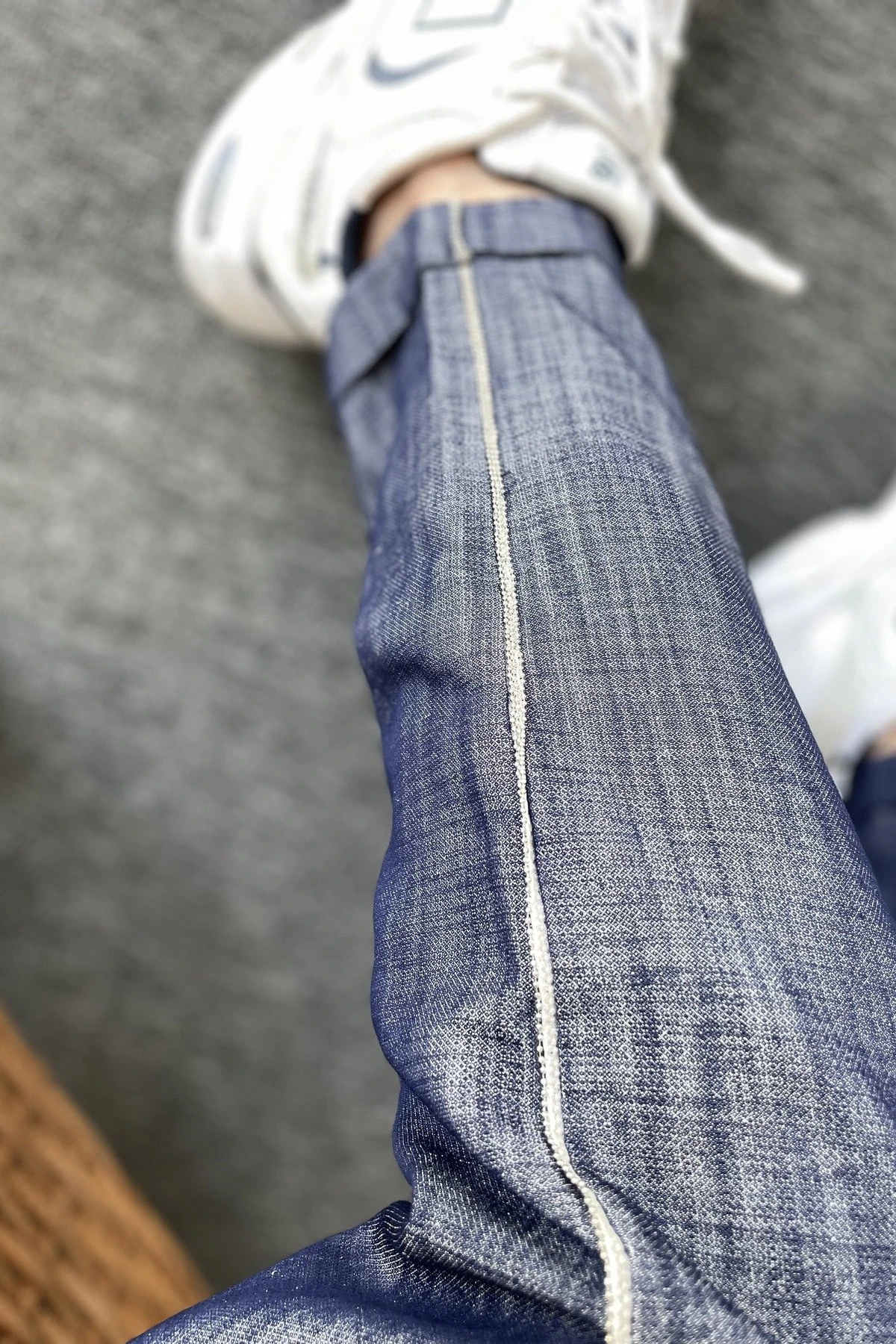 YAN ZİNCİR ŞERİT DUBLE PAÇA TENSEL PANTOLON – MAVİ