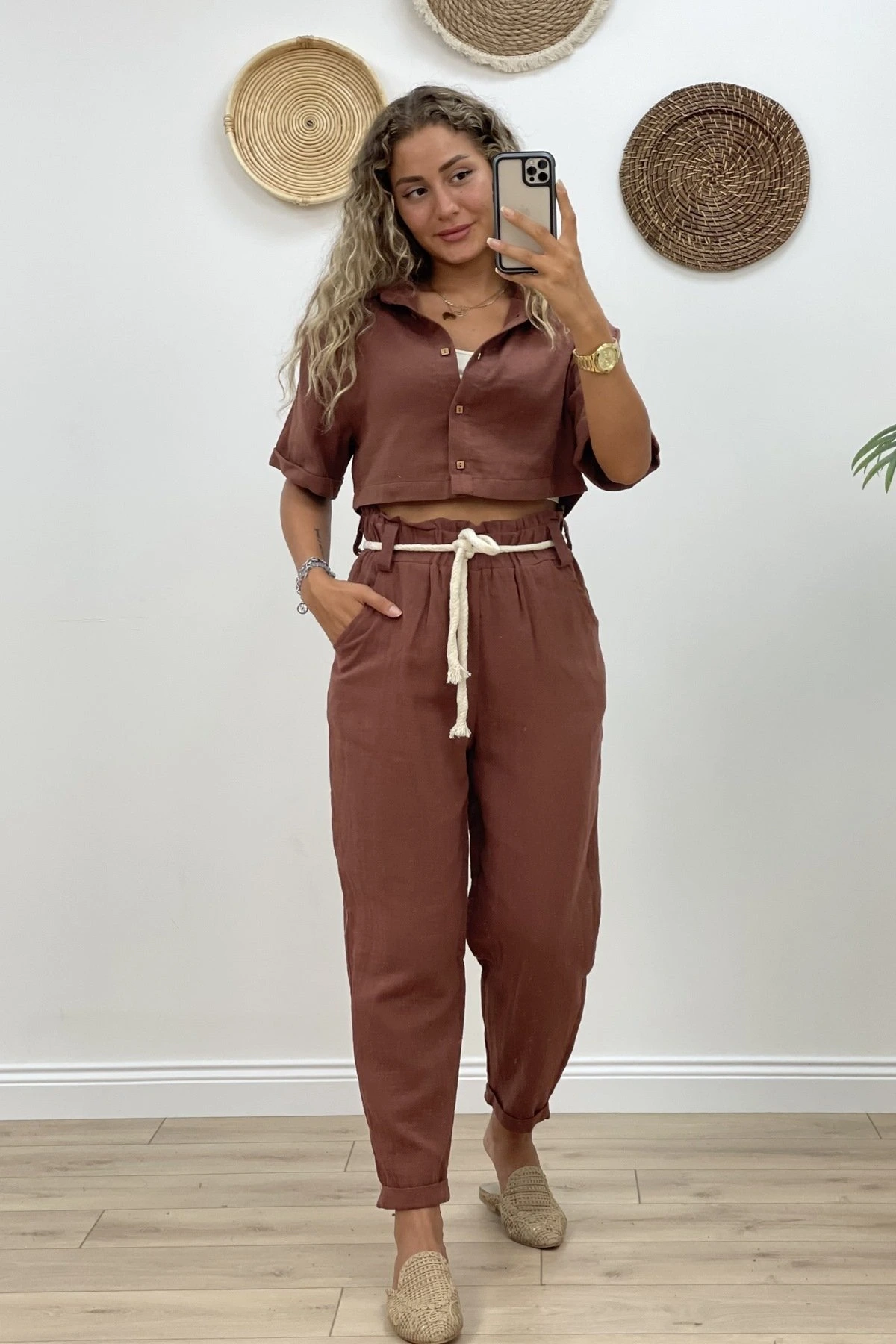 YÜKSEK BEL ÖRGÜ KEMER PAMUK PANTOLON – KAHVE