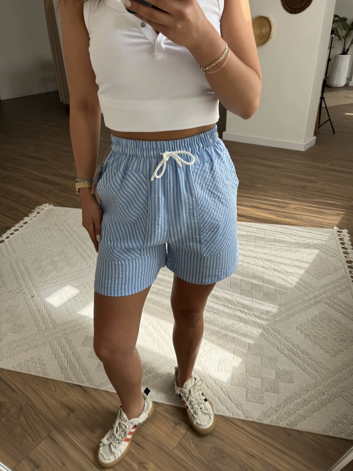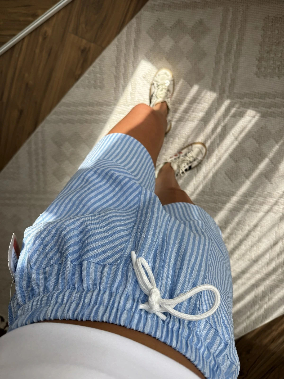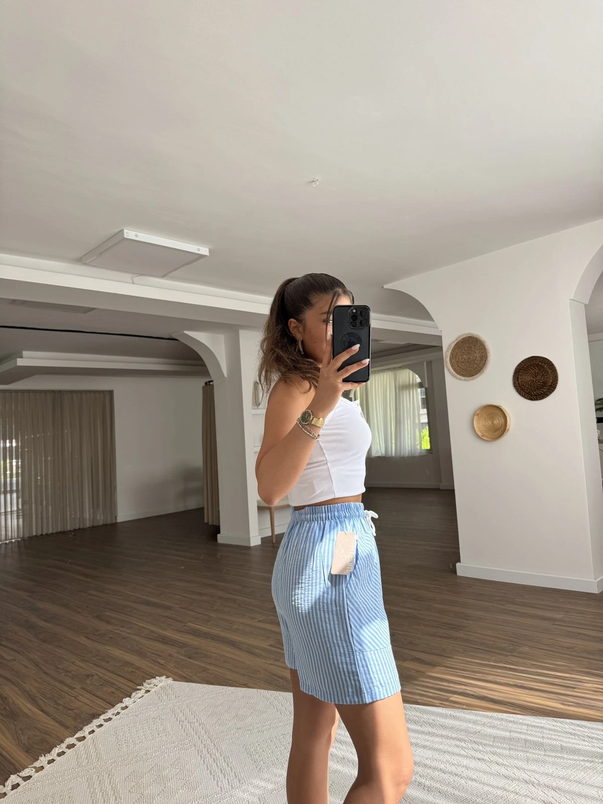 ÇİZGİLİ ÖN CEPLİ PAMUK ŞORT – MAVİ