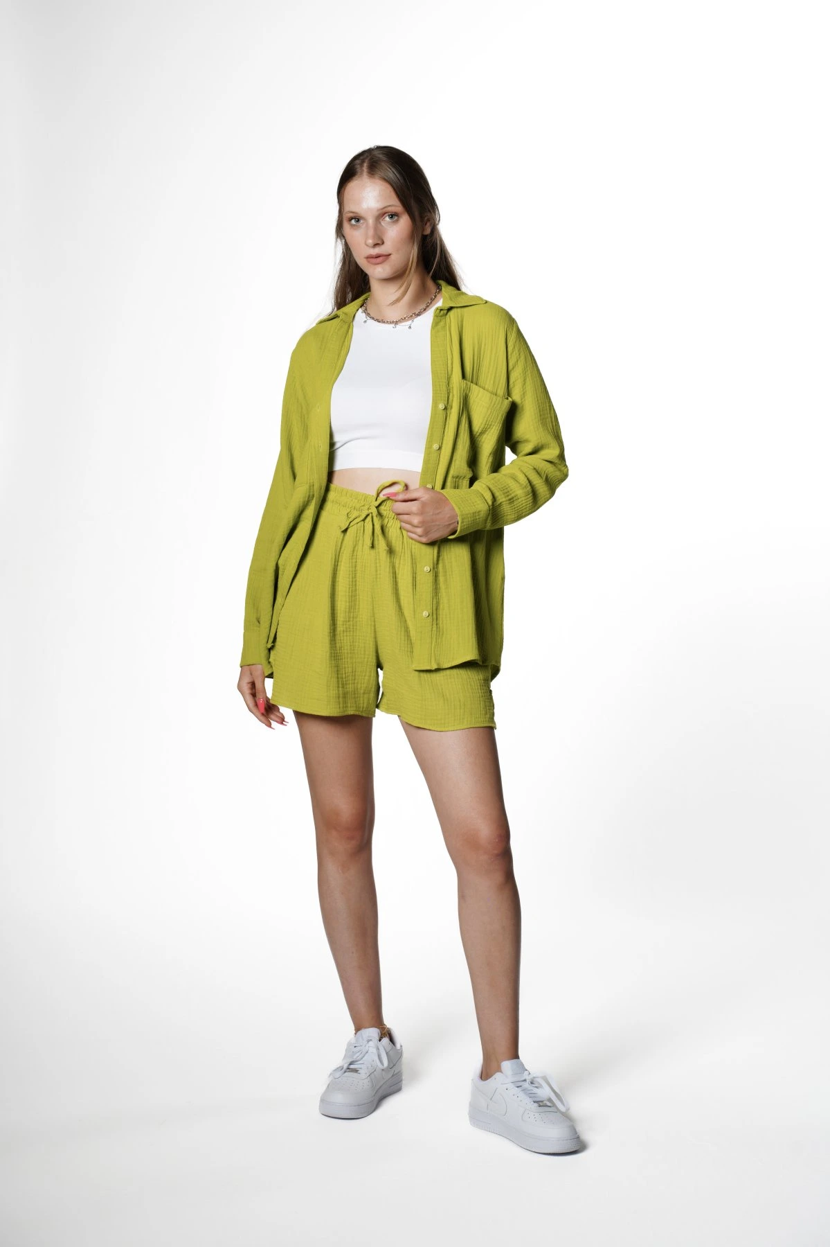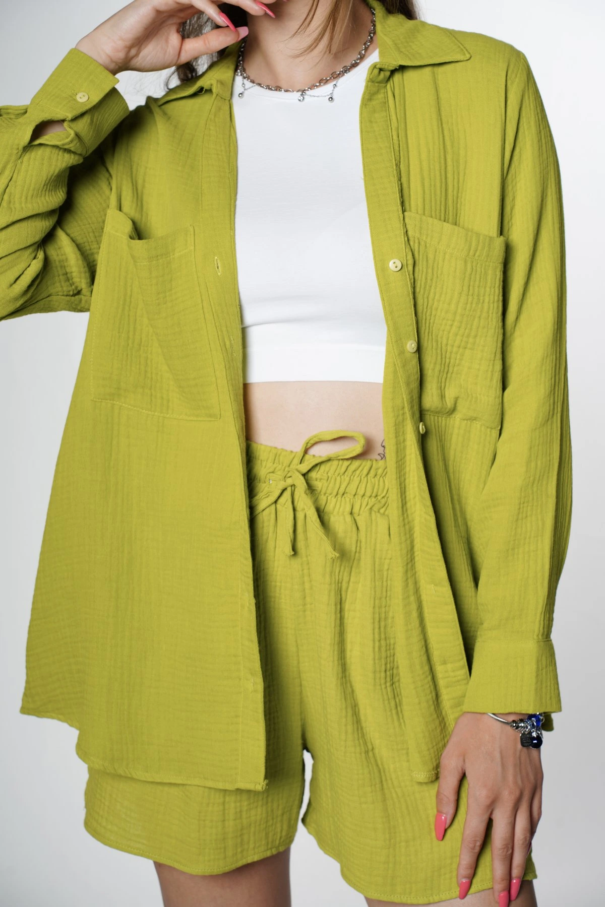 KETEN ÇİFT CEP GÖMLEK+ CEPLİ YAN YIRTMAÇ ŞORT TAKIM – OLİVE