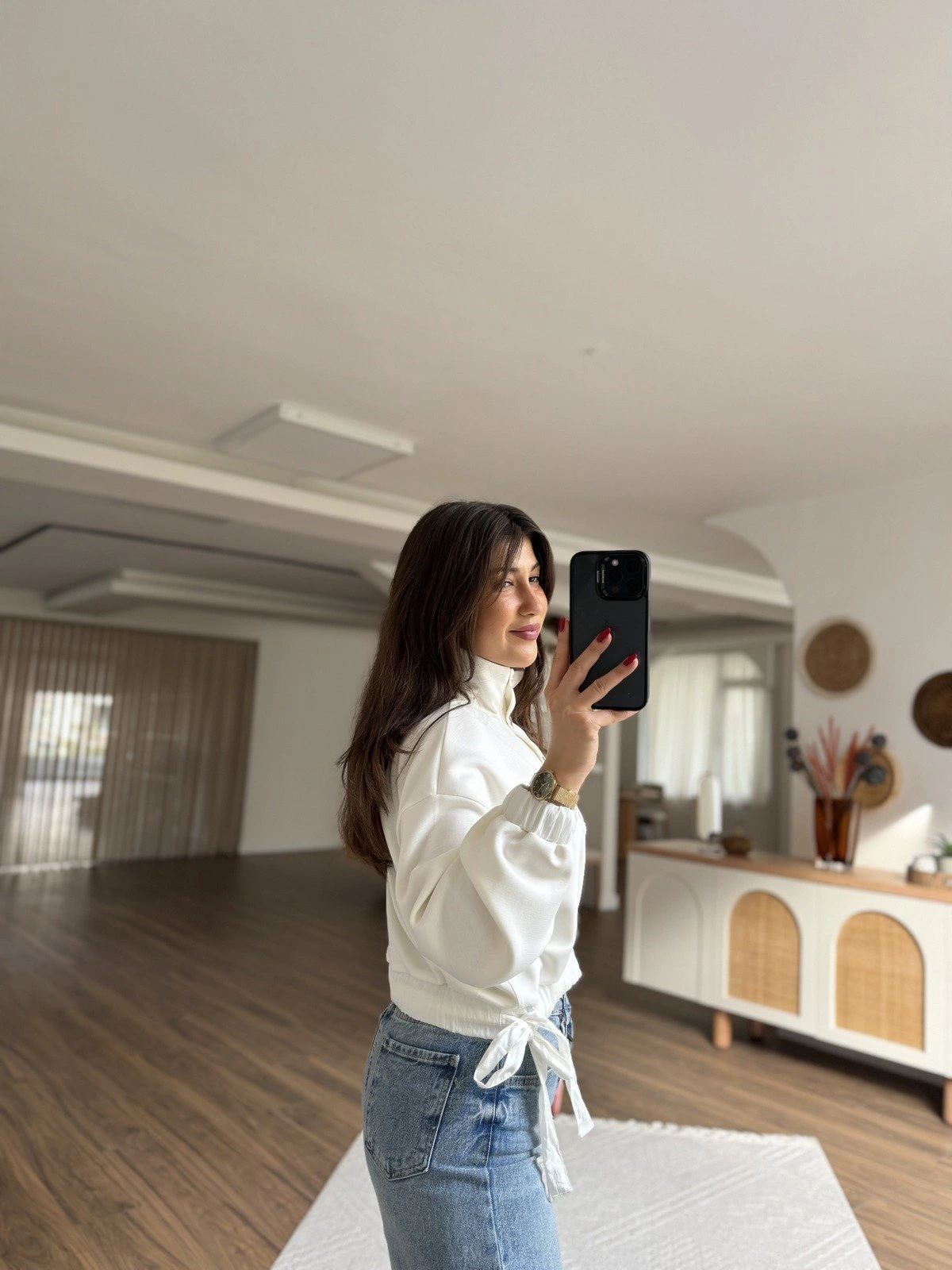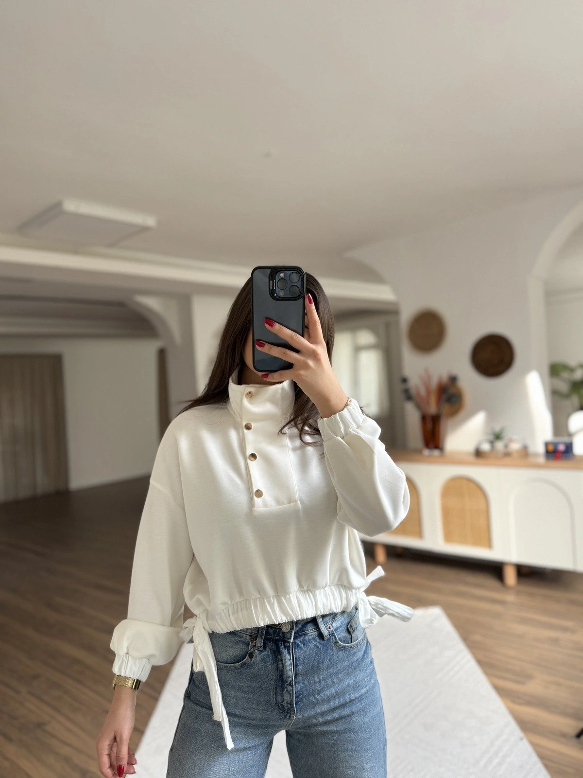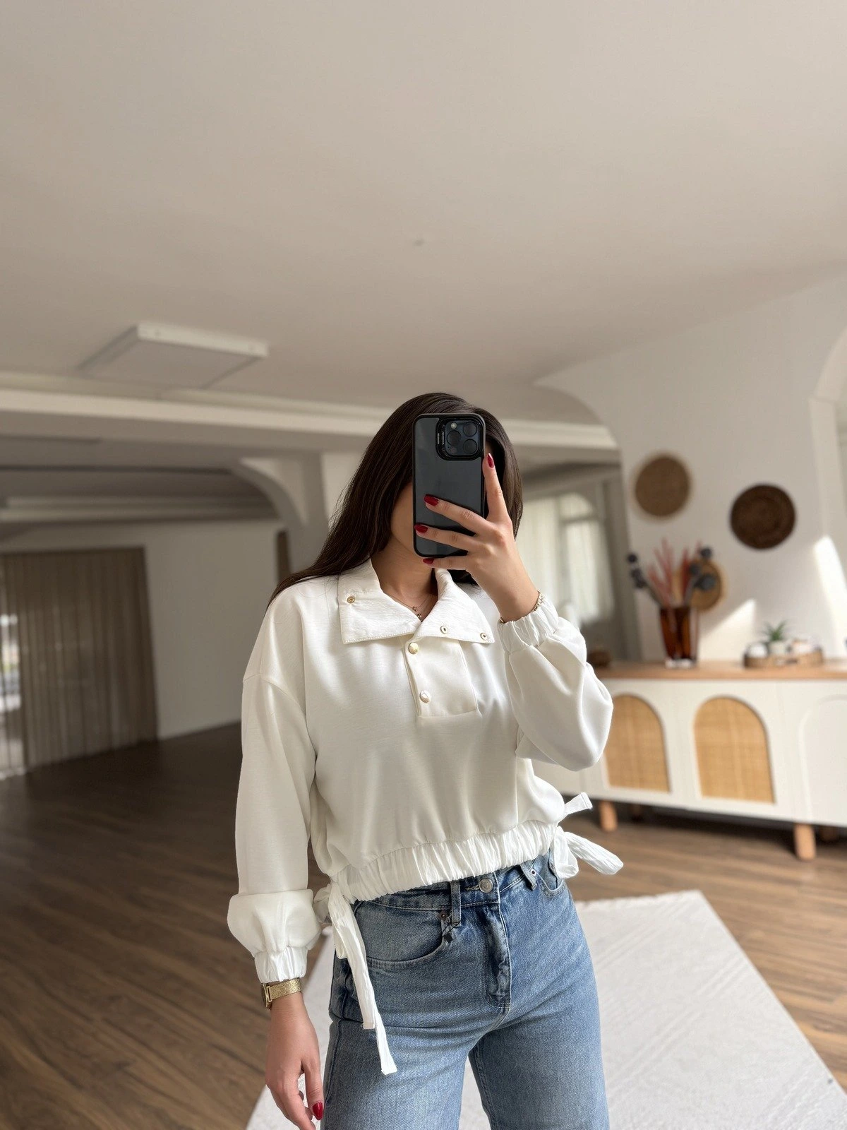 BEL BÜZGÜ BAĞLAMA DİK YAKA ÇITÇITLI KISA MODAL SWEAT – BEYAZ