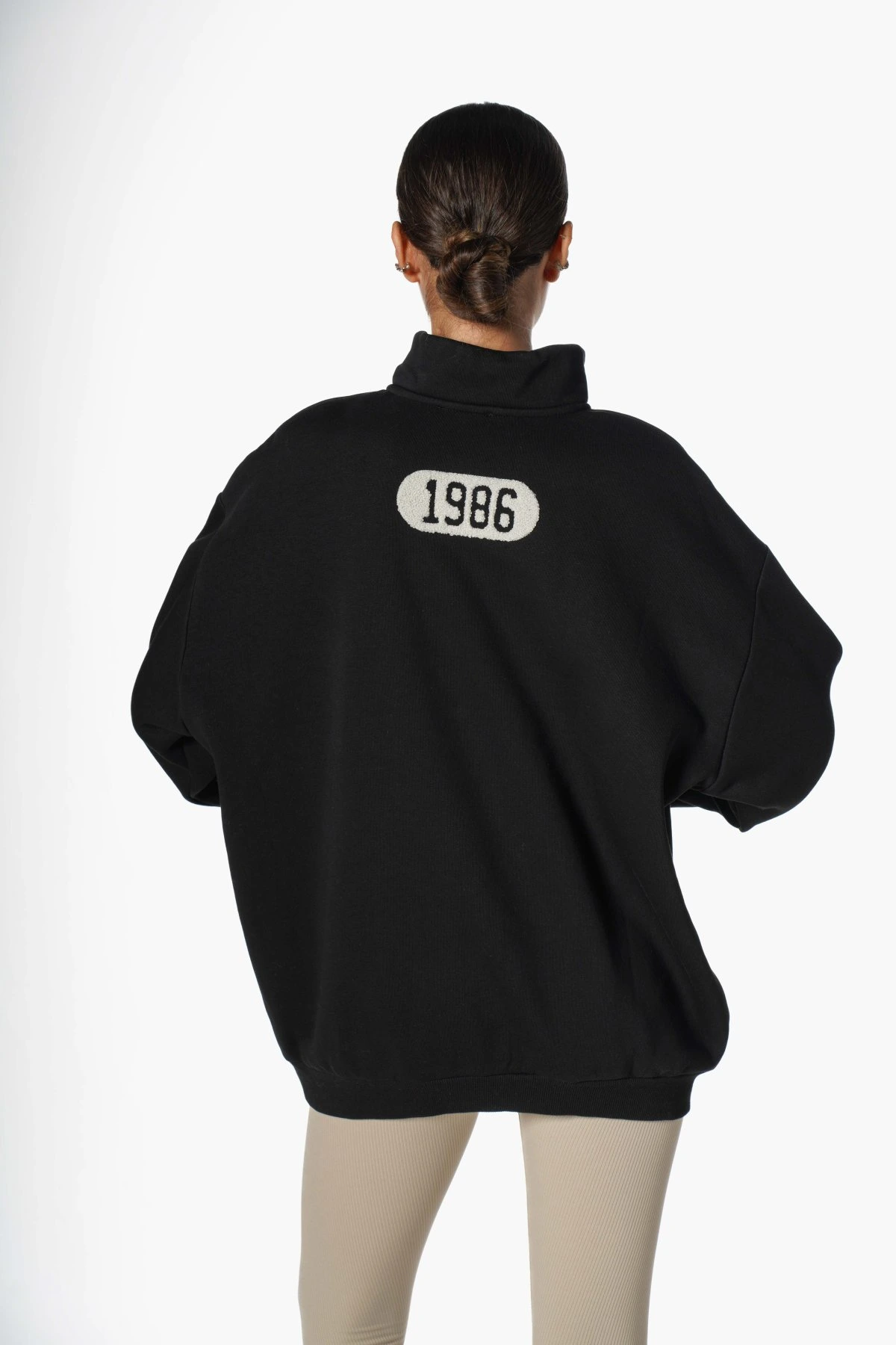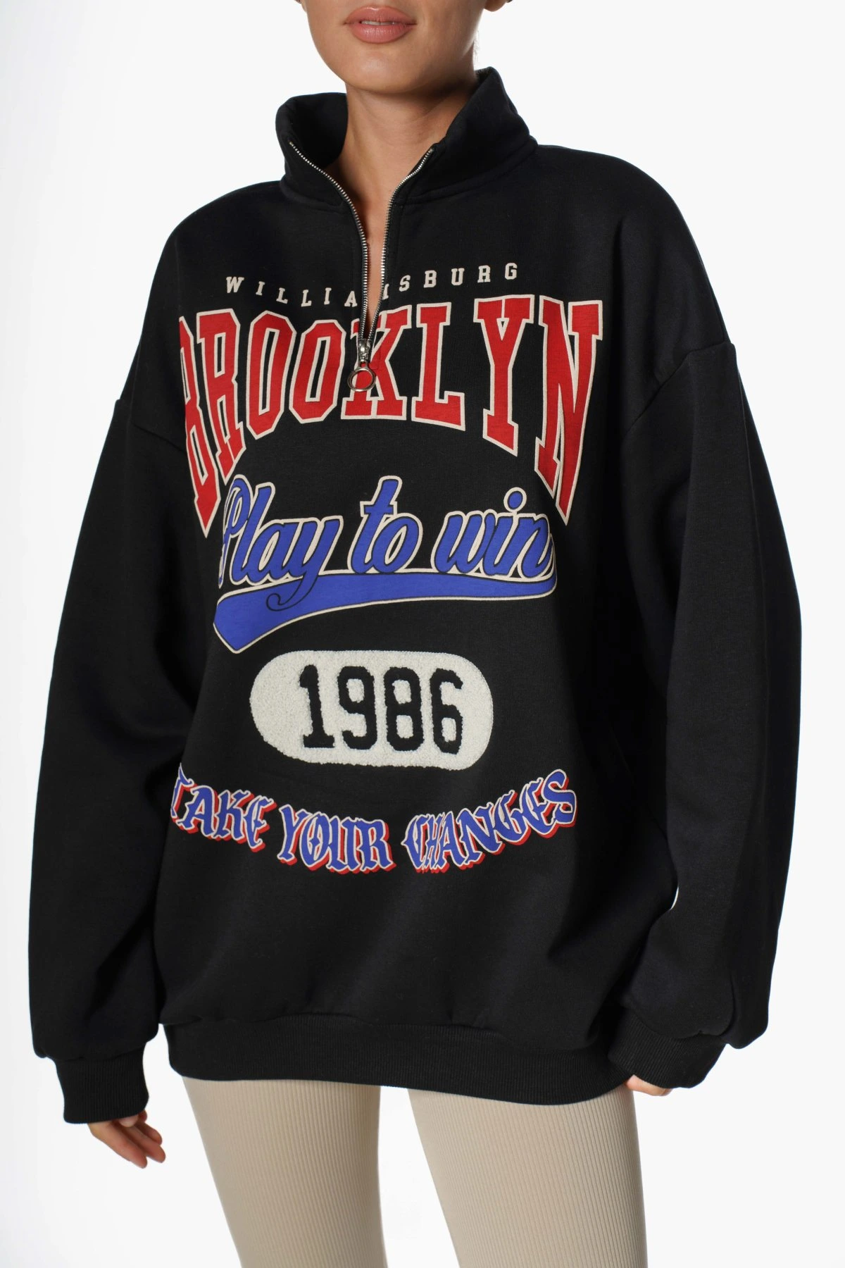 BROOKLYN KABARTMA BASKI DİK YAKA FERMUARLI SALAŞ SWEAT – SİYAH
