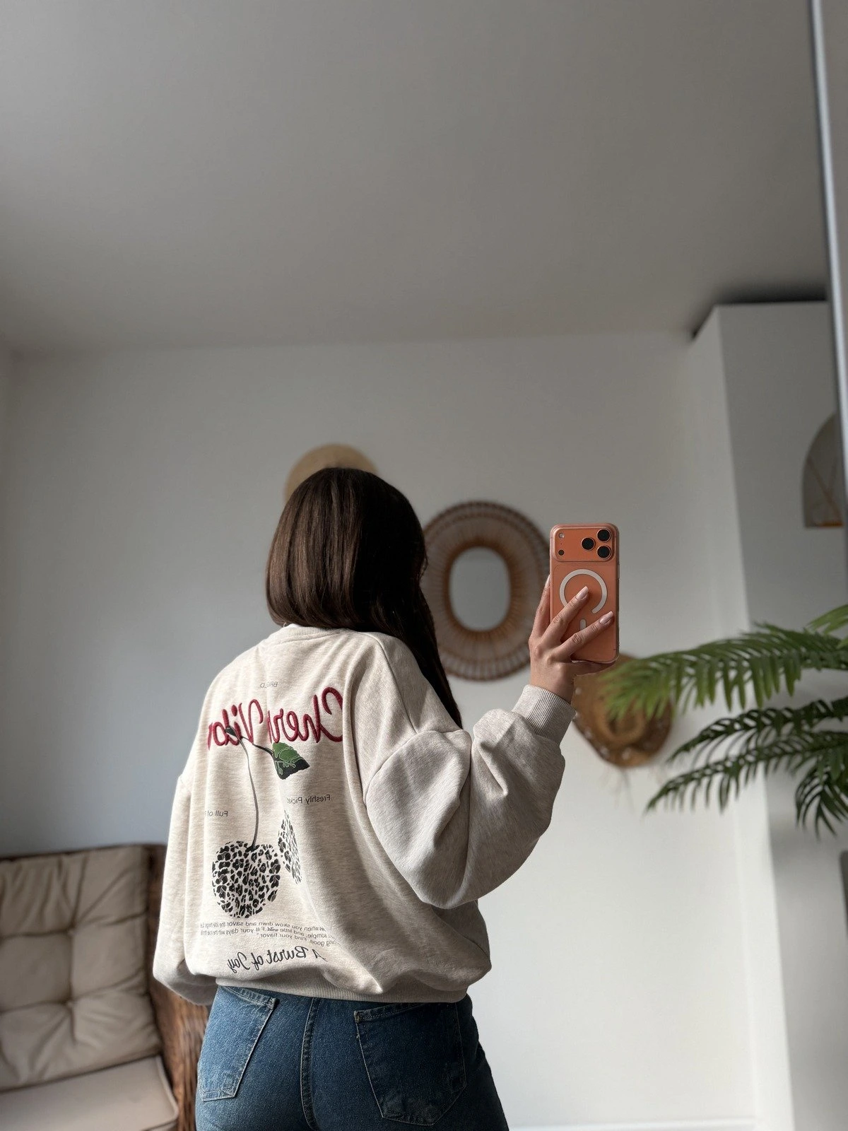 CHERRY VİBES YAZI NAKIŞ ARKA DETAY PAMUK SALAŞ SWEAT – BEJ
