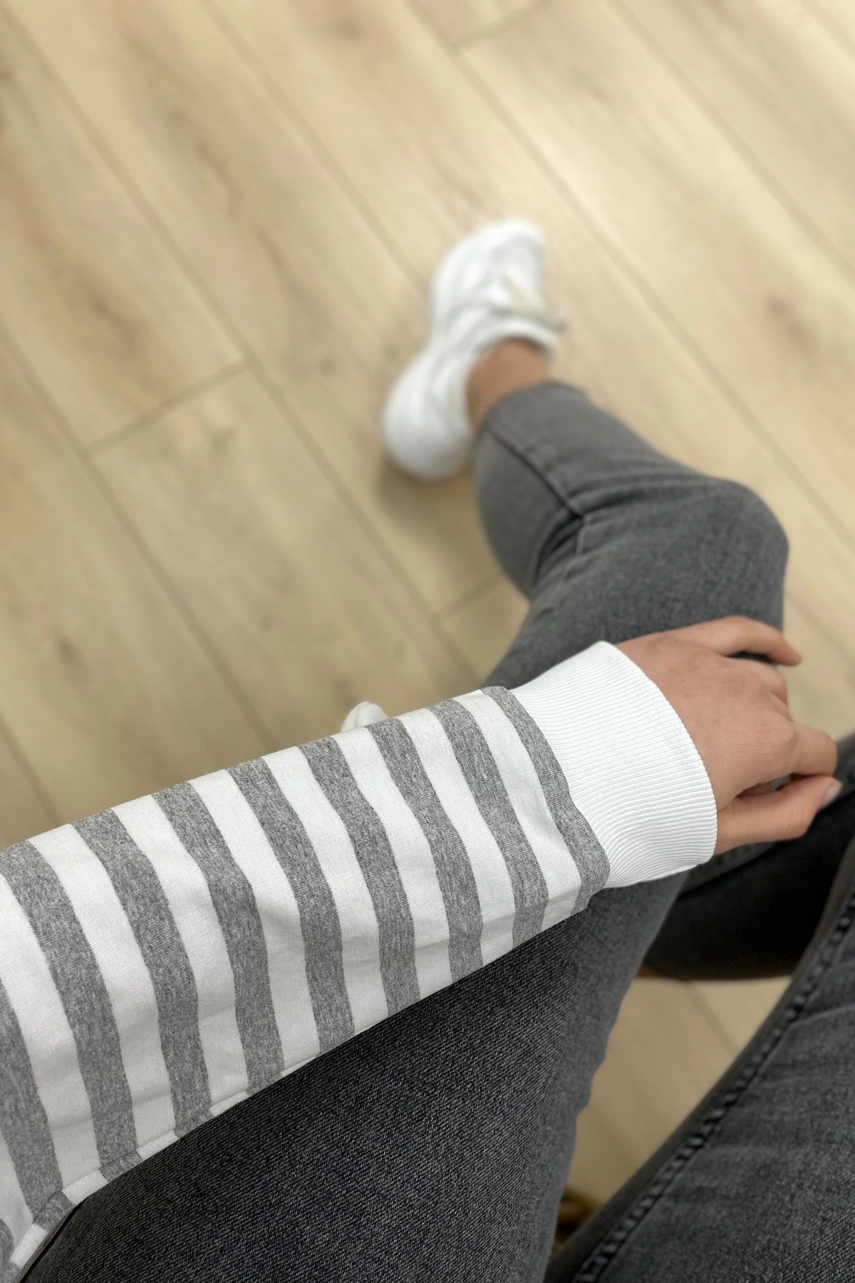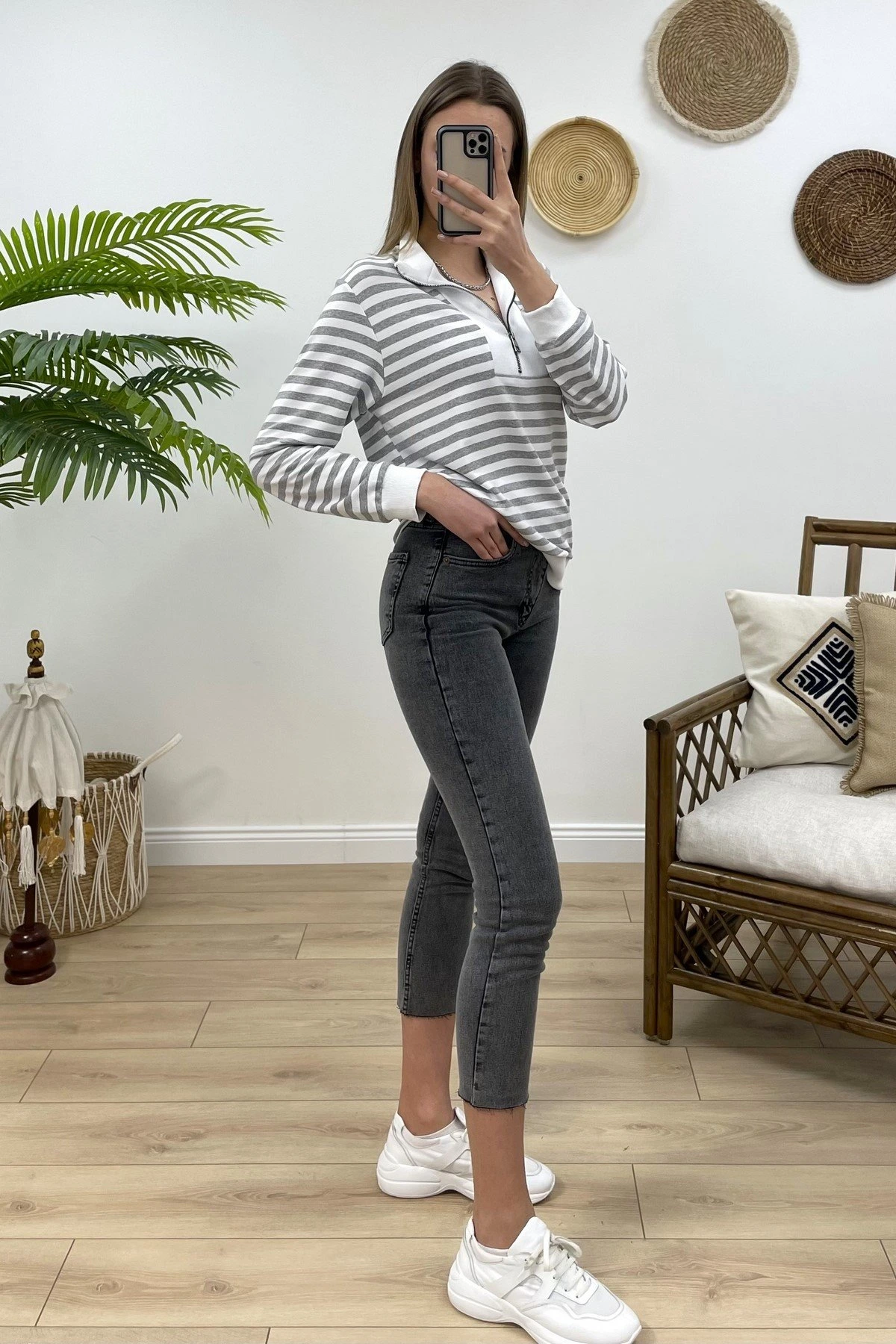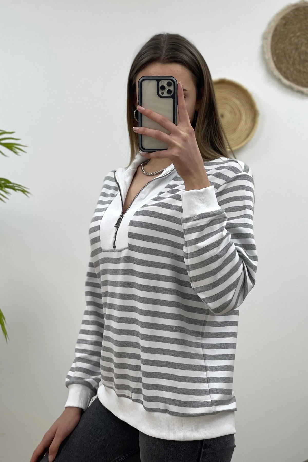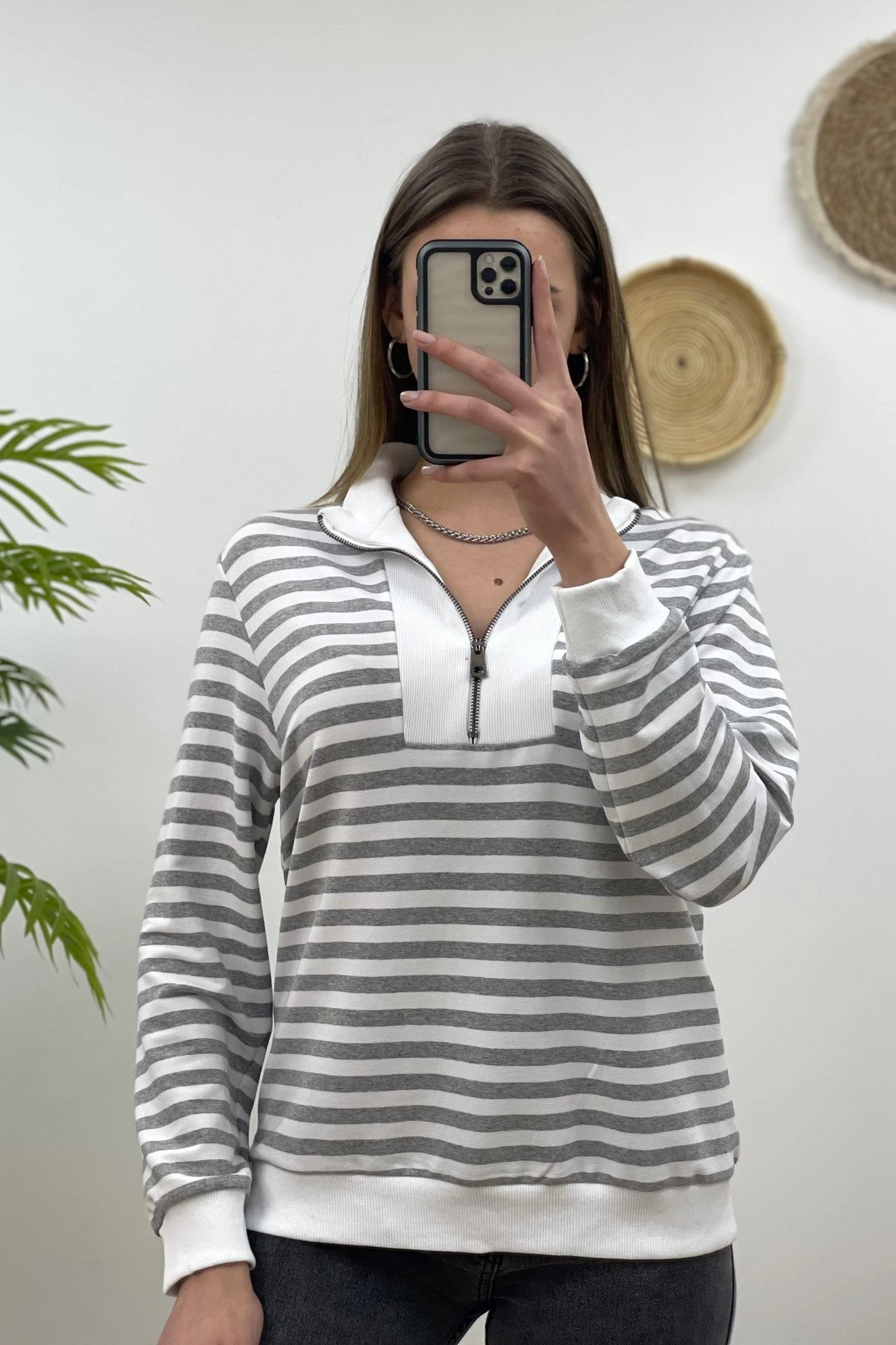 ÇİZGİLİ ÖNÜ FERMUARLI SWEAT – GRİ