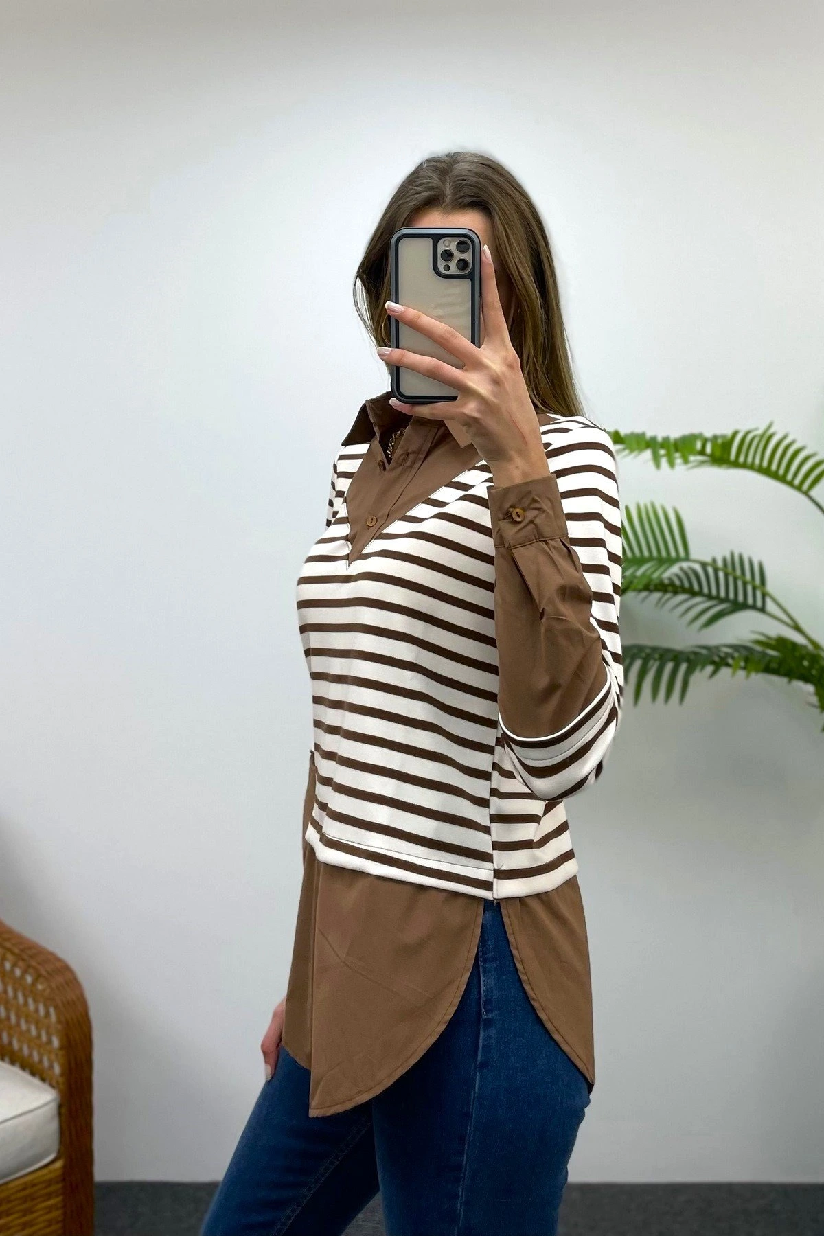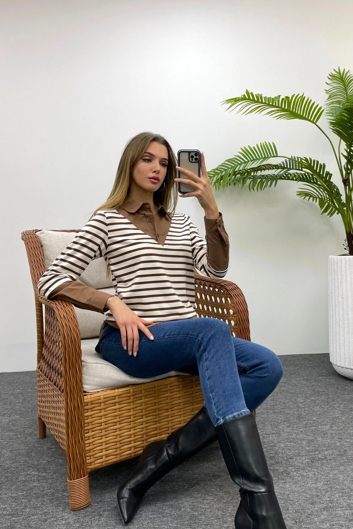 ÇİZGİLİ YAKA,KOL VE ETEK UCU GARNİLİ SWEAT – KAHVE