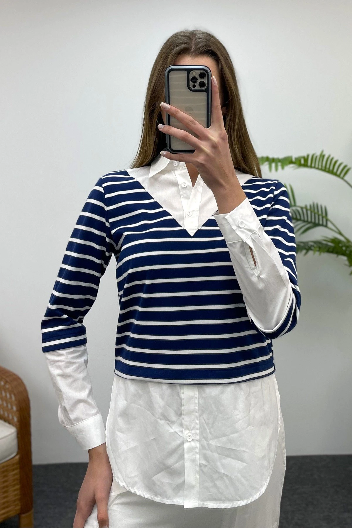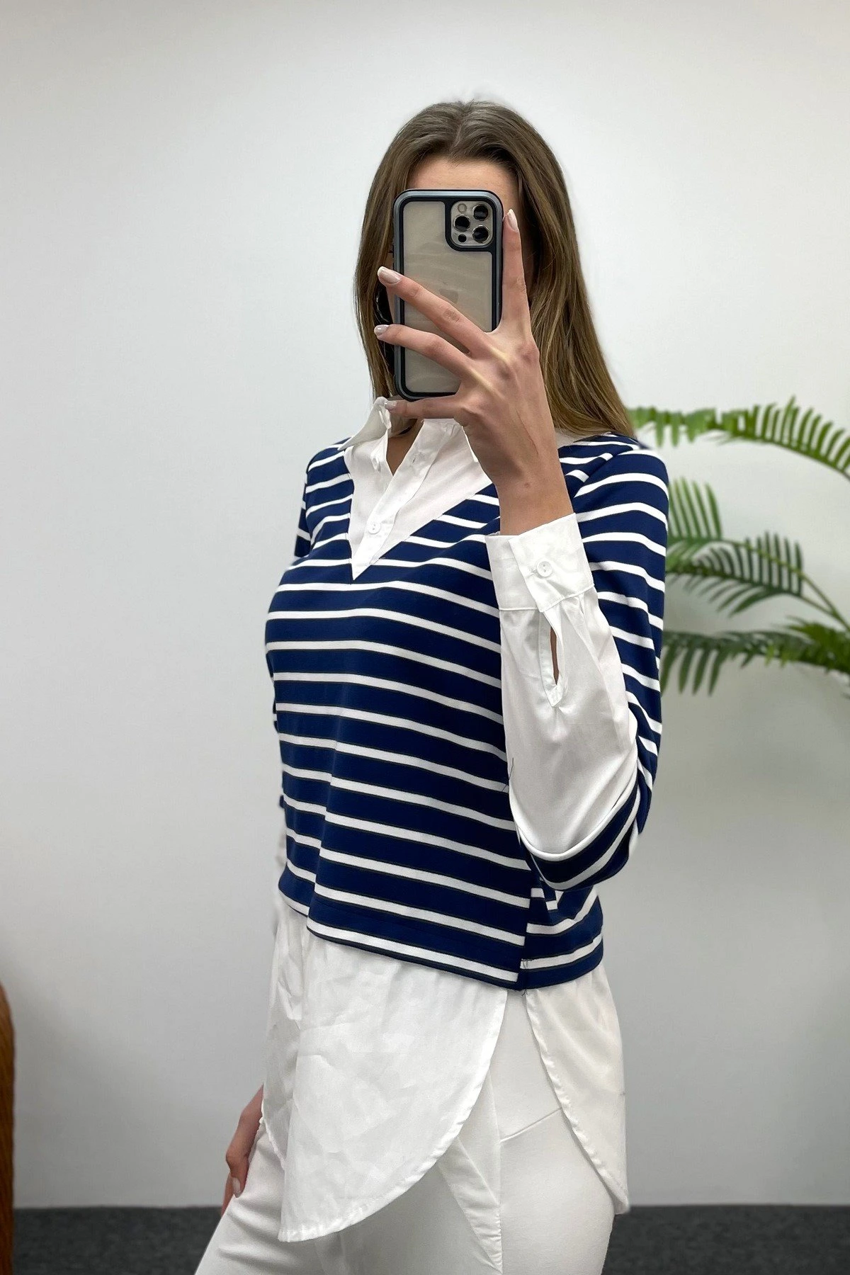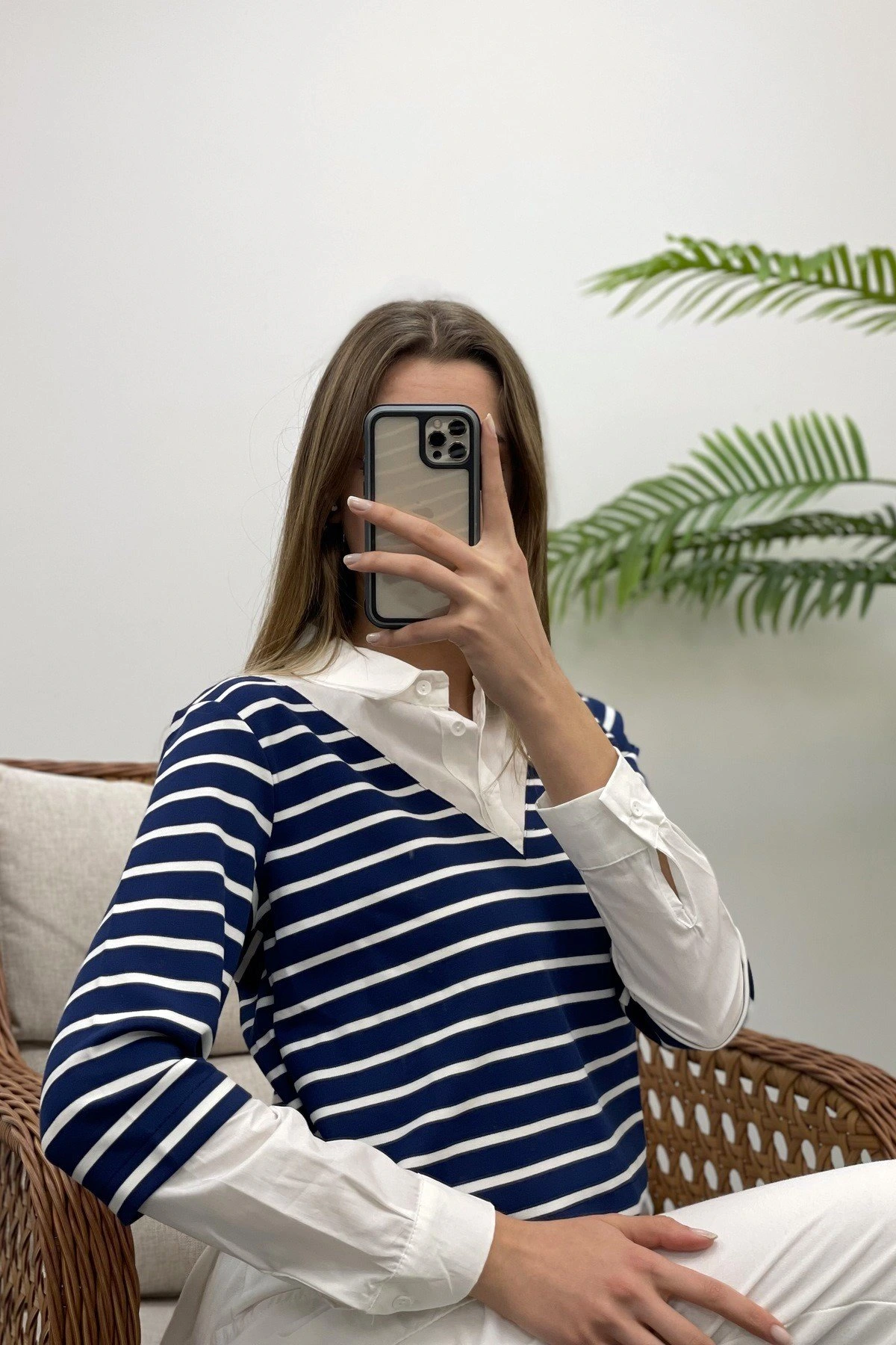 ÇİZGİLİ YAKA,KOL VE ETEK UCU GARNİLİ SWEAT – LACİVERT ÇİZGİLİ
