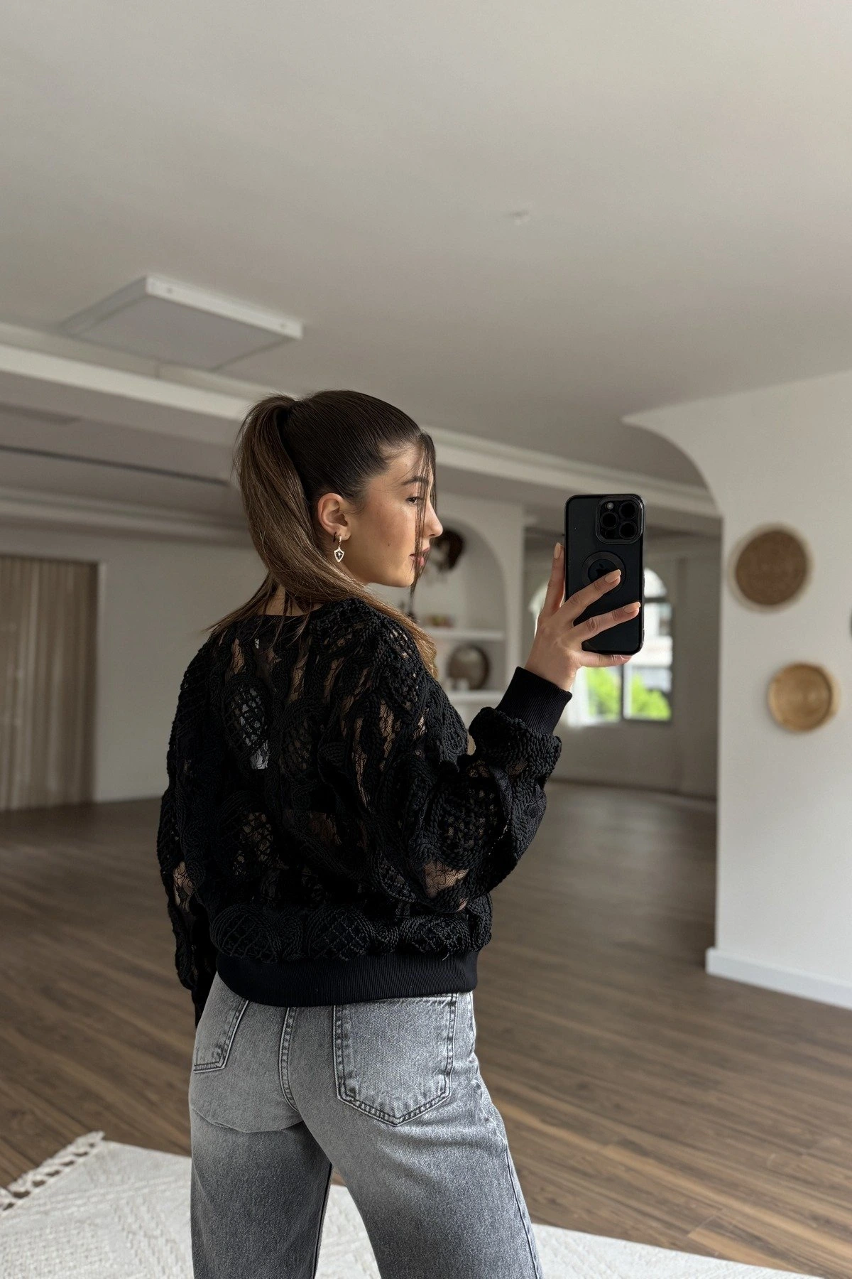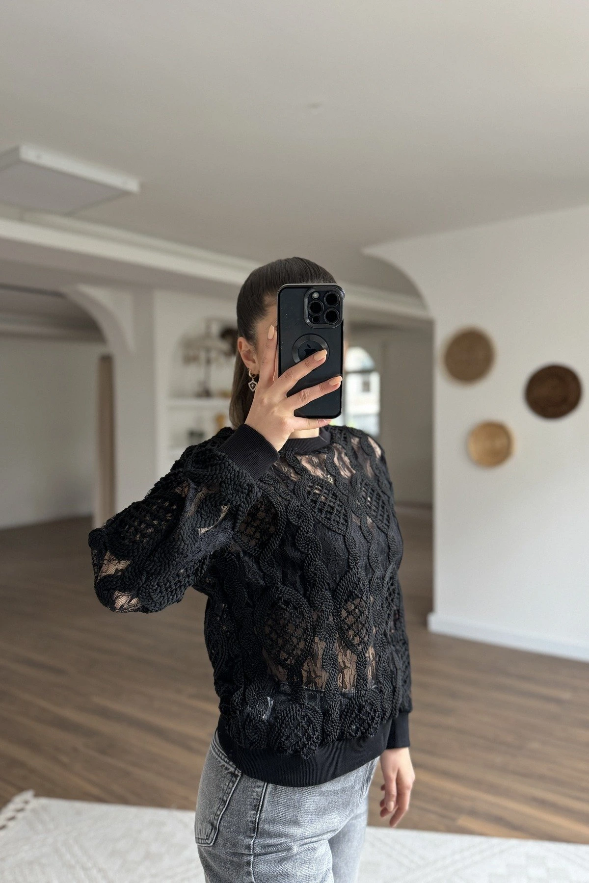 DANTEL DETAY ÖRME TRİKO SWEAT – SİYAH
