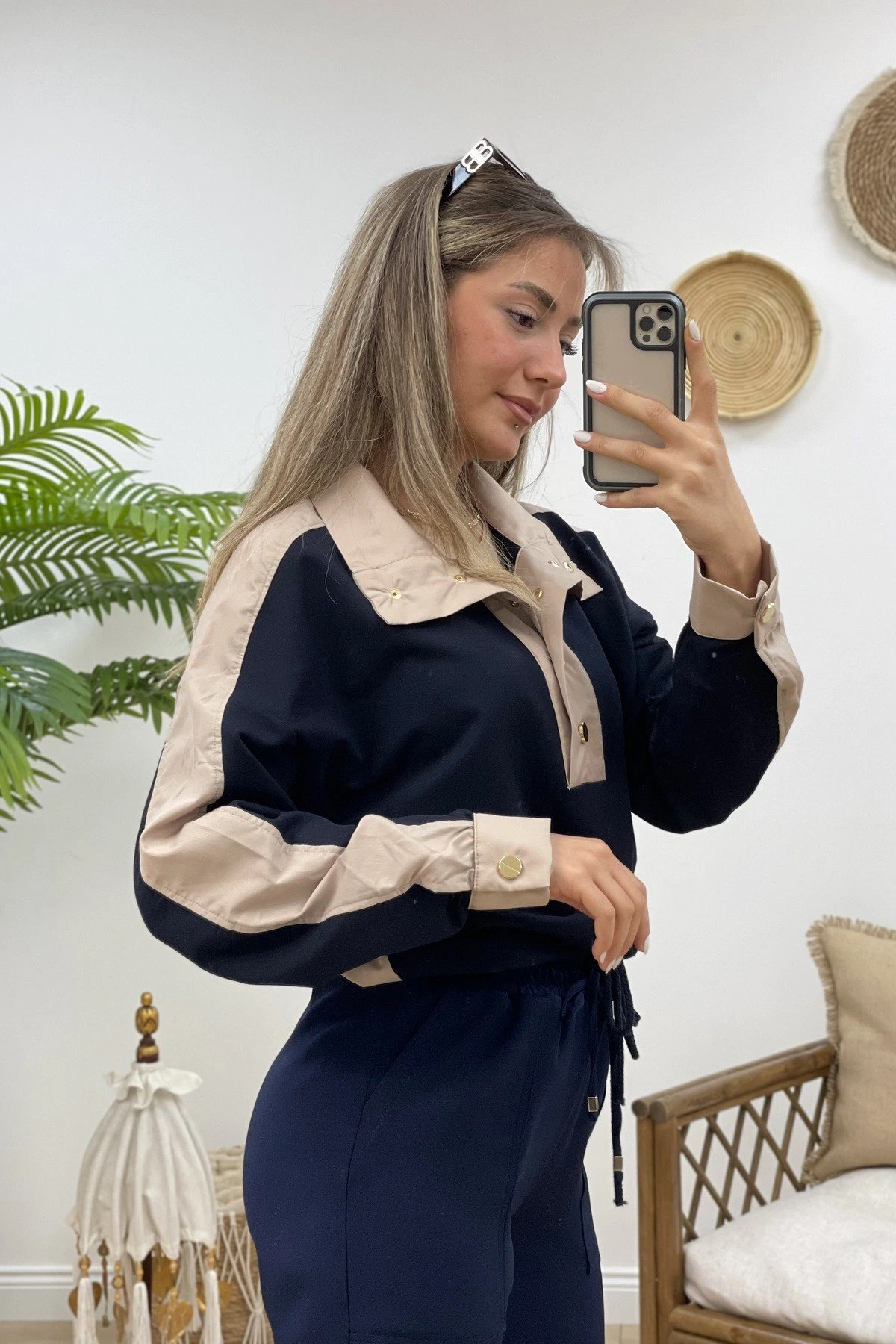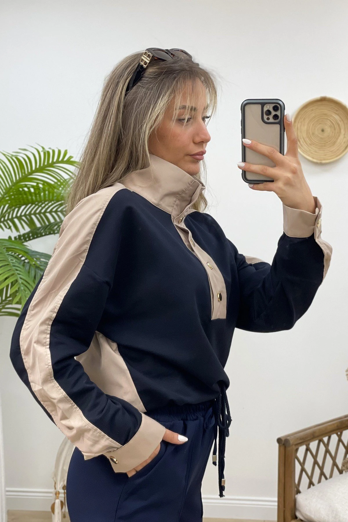 DİK YAKA 2 RENKLİ BEL BÜZGÜ SWEAT – LACİVERT