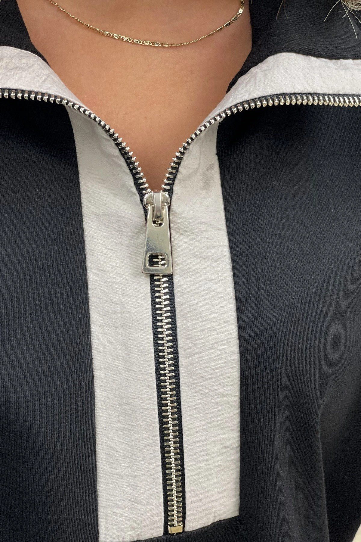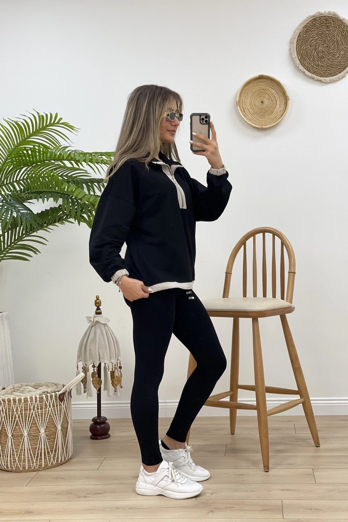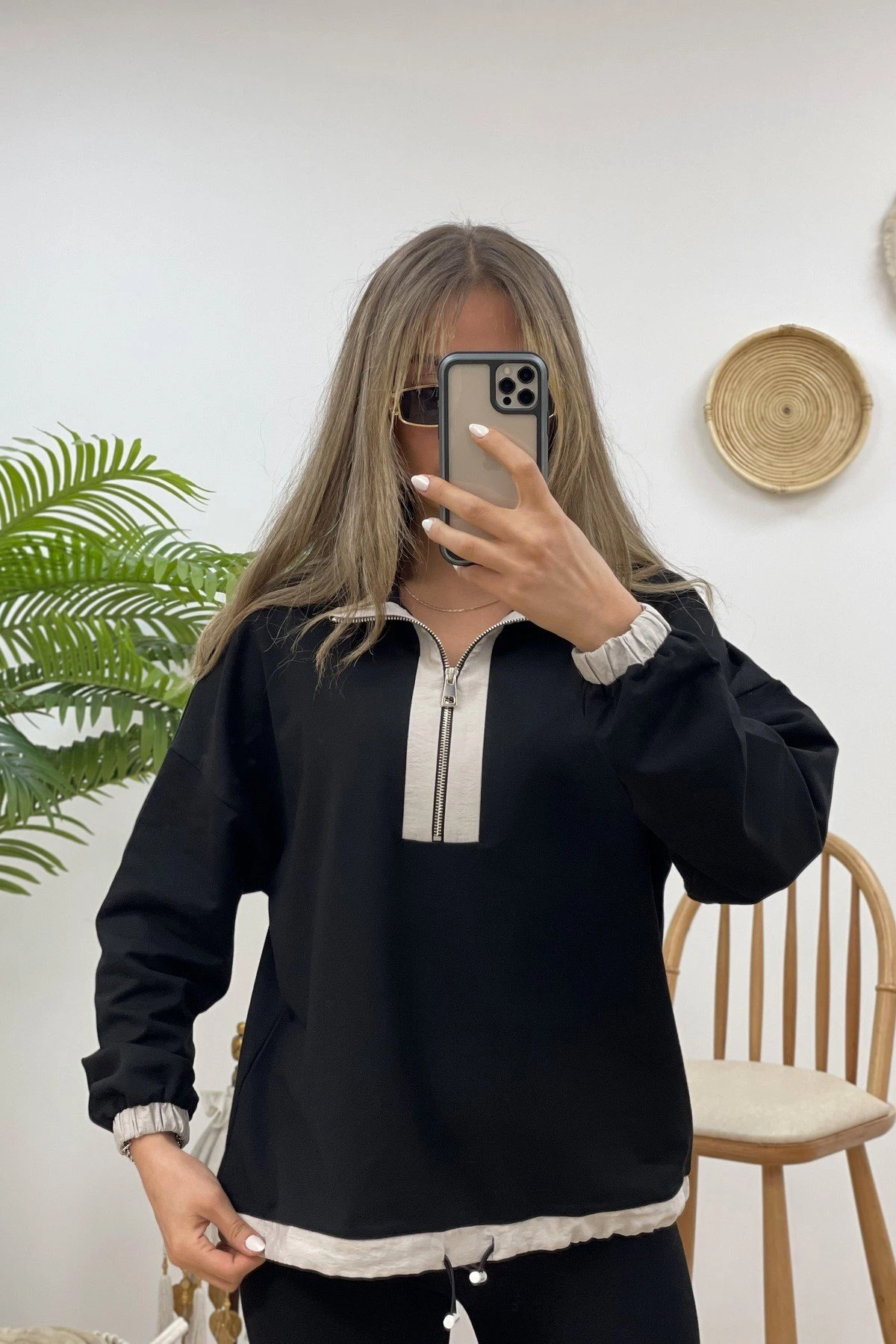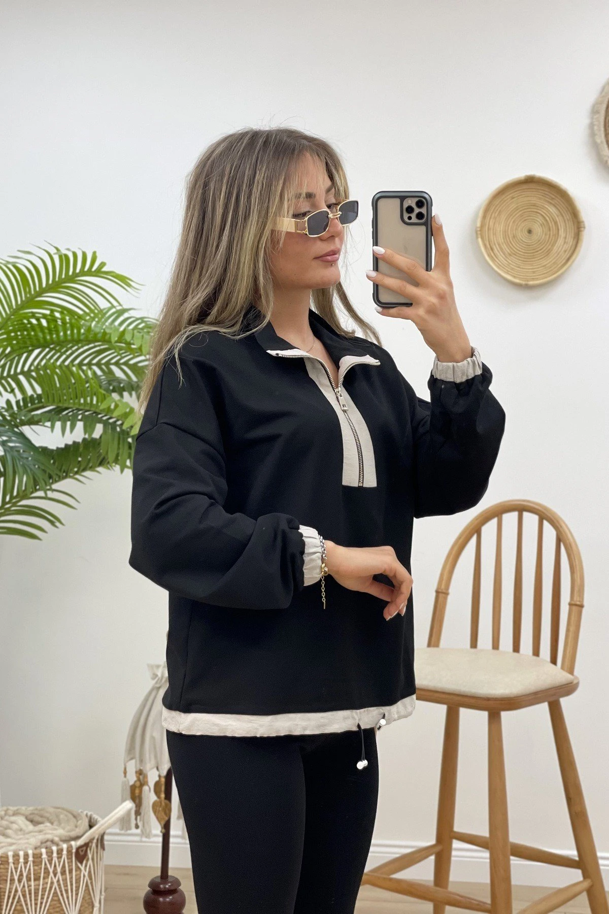 DİK YAKA FERMUARLI BİYELİ BEL BÜZGÜ SWEAT – SİYAH