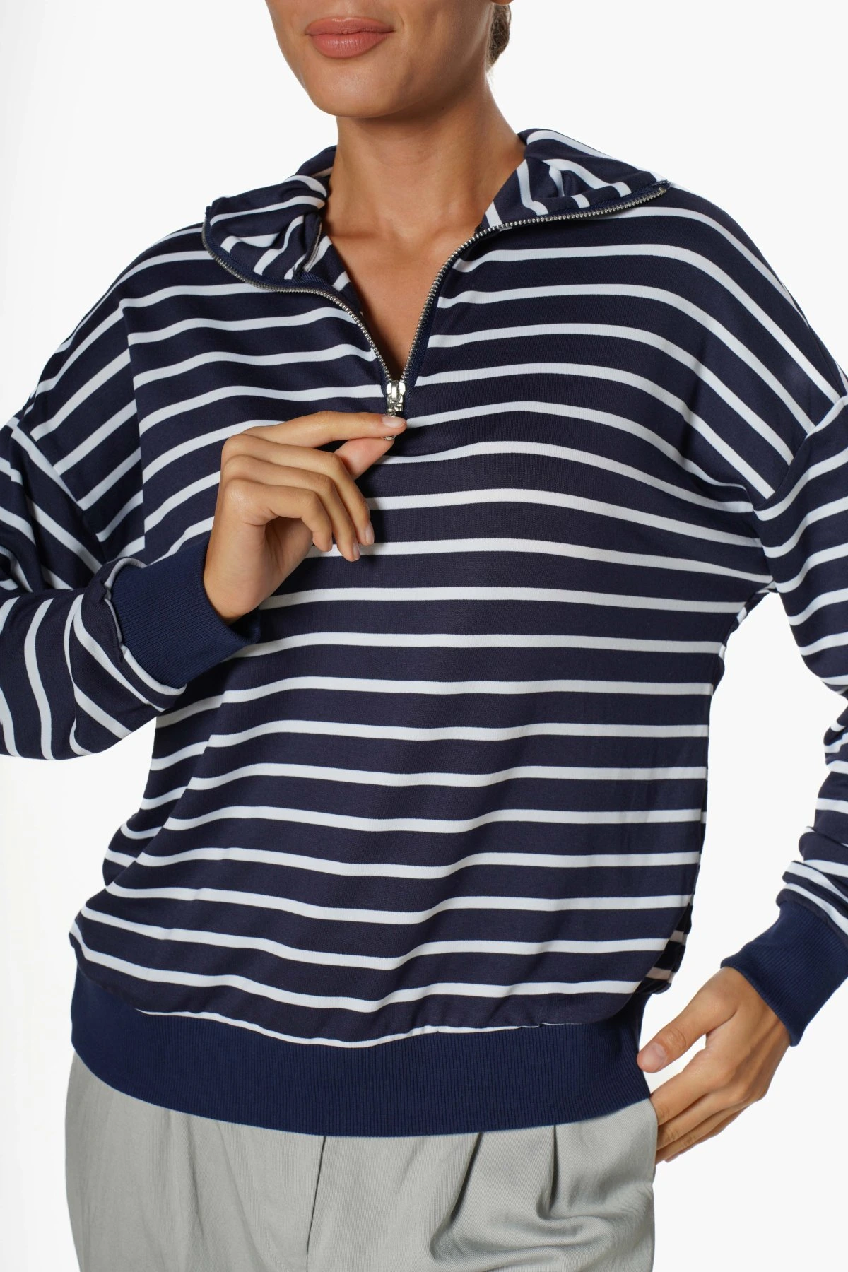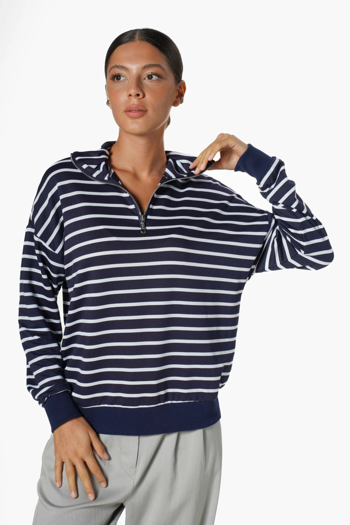 DİK YAKA FERMUARLI ETEK VE KOL UCU RİBANALI İNCE DOKUMA SWEAT – LACİVERT BEYAZ