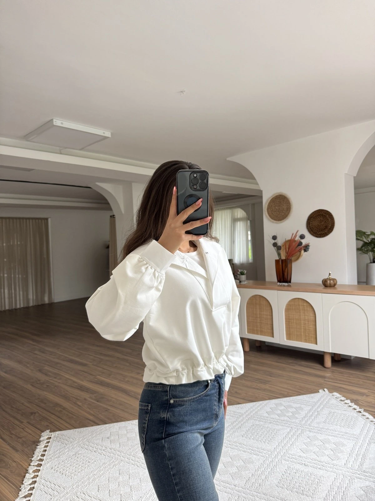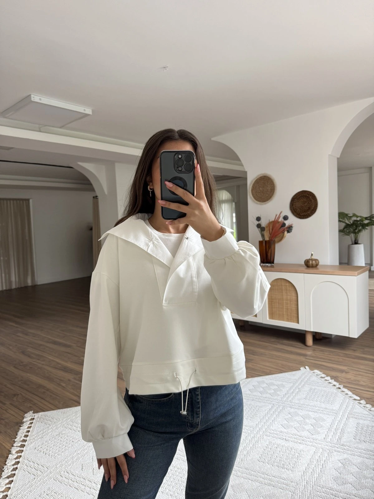 DİK YAKA GARNİLİ BEL BÜZGÜ PAMUK SWEAT – EKRU