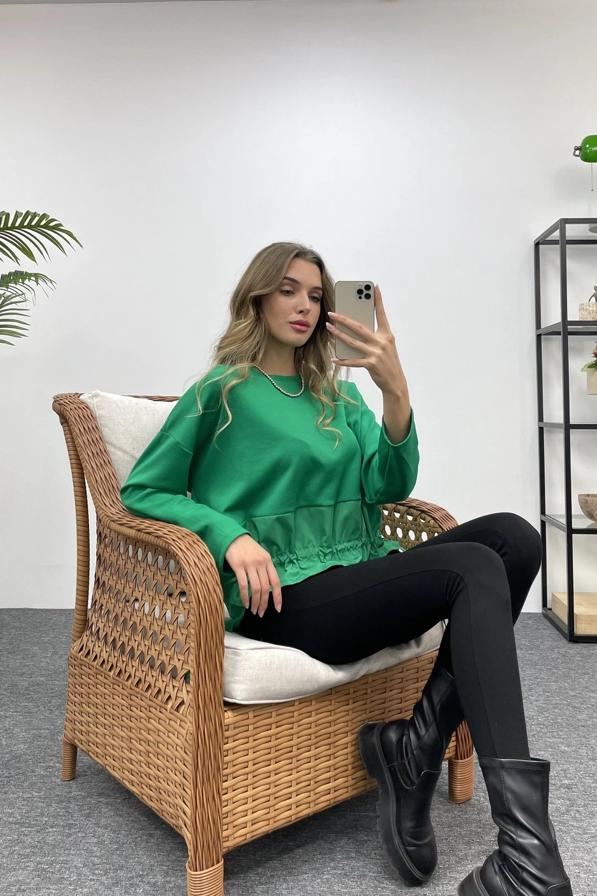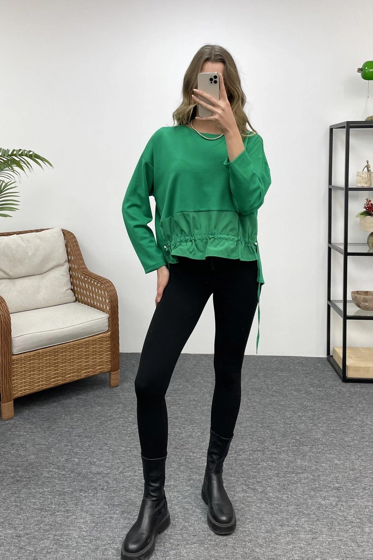 ETEĞİ BÜZGÜ GARNİLİ SWEAT – ÇİMEN YEŞİLİ