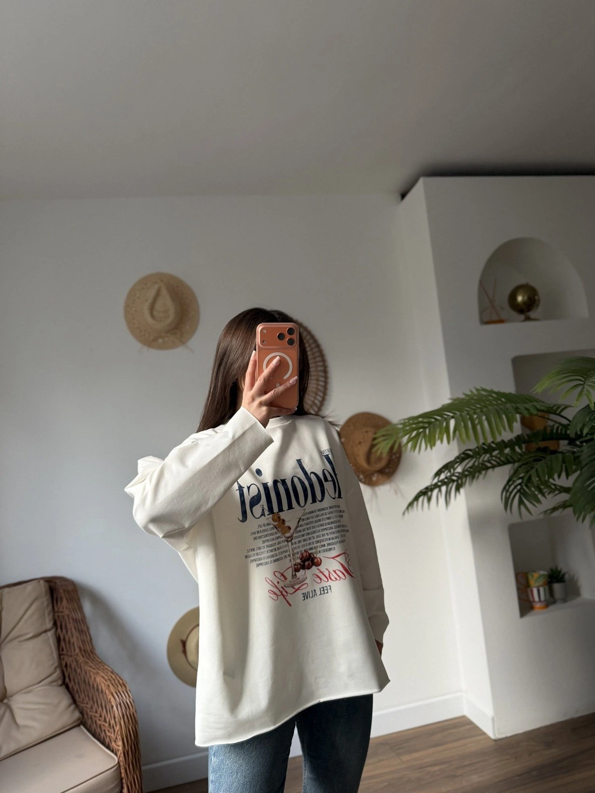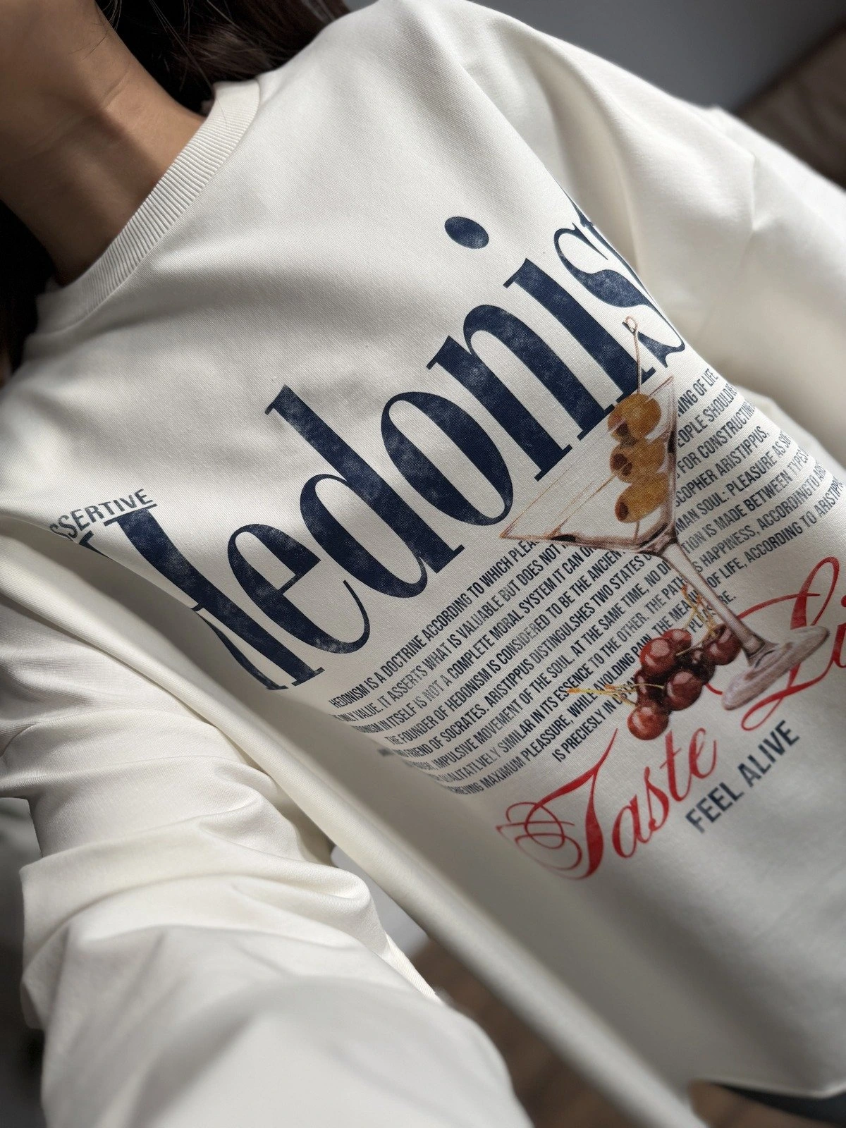 HEDONİST YAZI BASKI KOL VE ETEK LAZER KESİM İNCE PAMUK SALAŞ SWEAT – EKRU