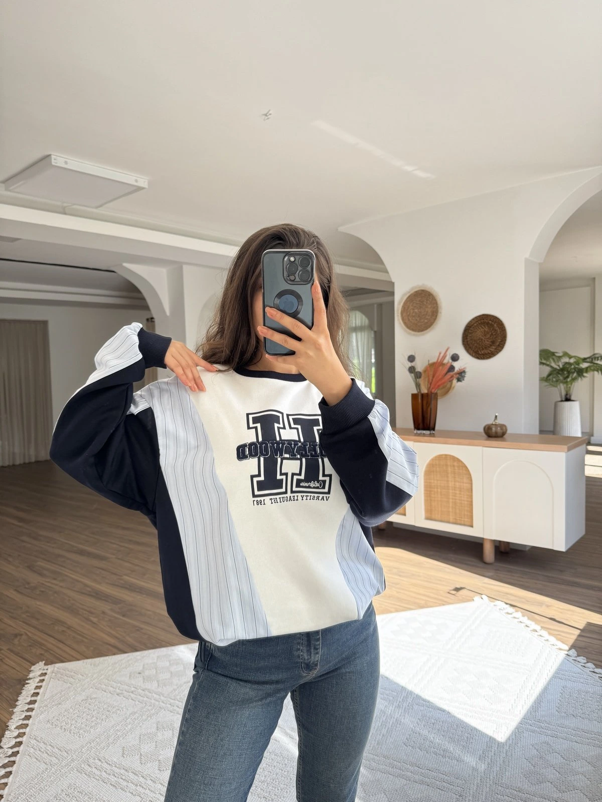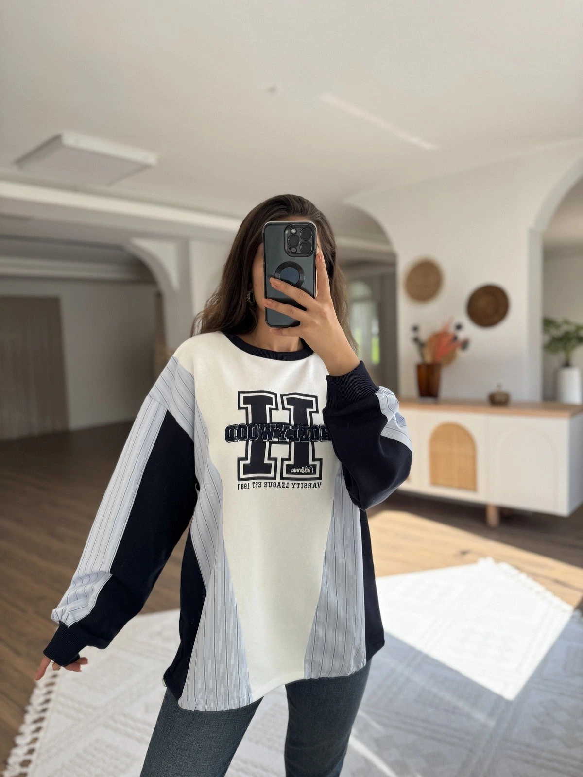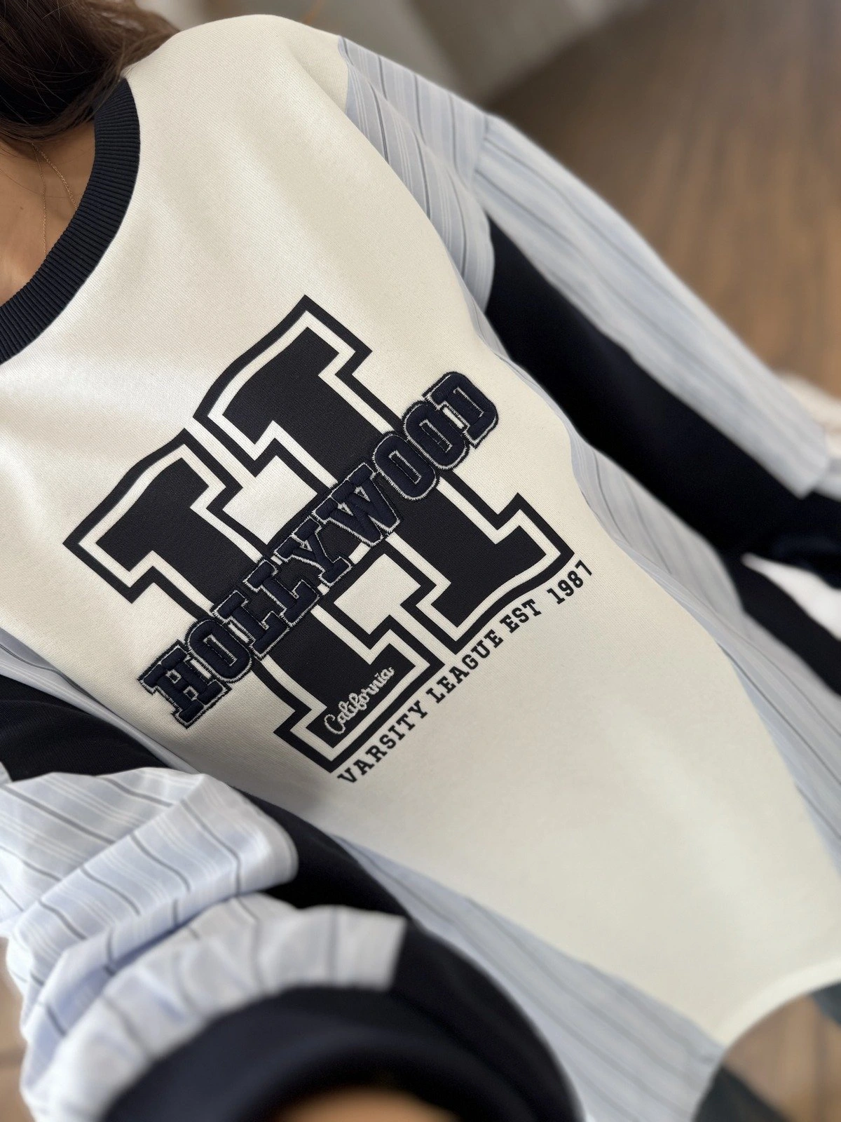 HOLLYWOOD YAZI BEL BÜZGÜ ÇİZGİ GARNİLİ SALAŞ PAMUK SWEAT – EKRU