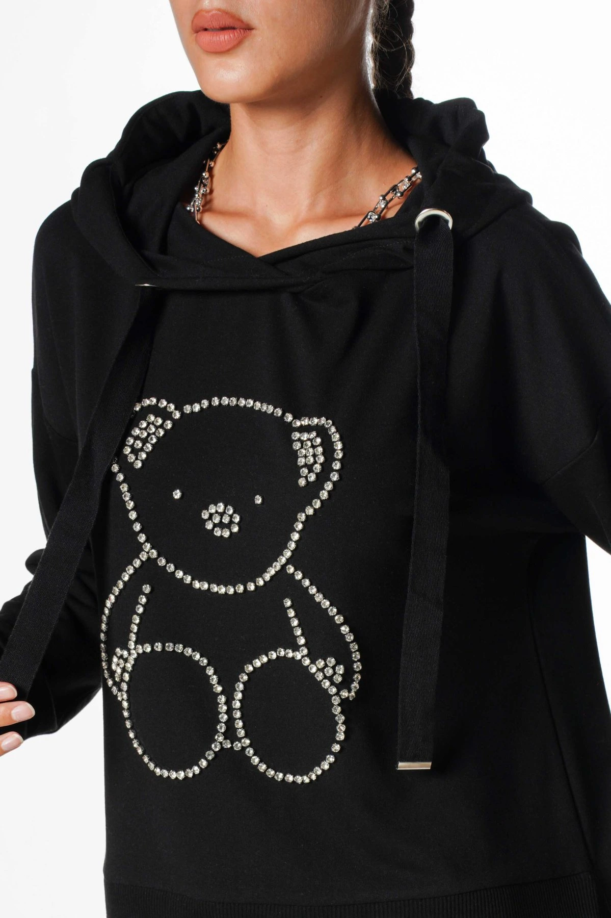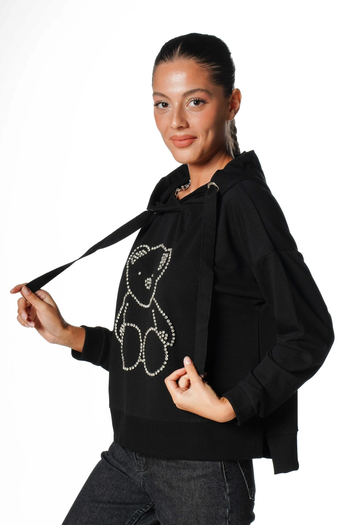 KAPÜŞONLU AYICIK TAŞ İŞLEME PAMUK SWEAT – SİYAH