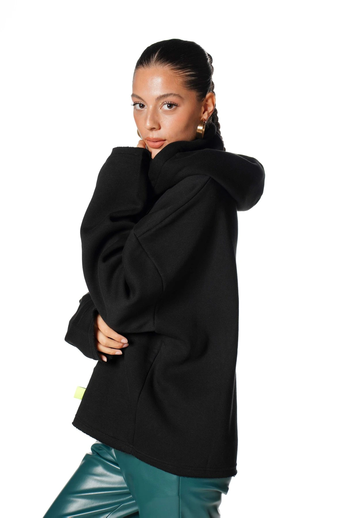 KAPÜŞONLU ETEĞİ DÜZ KANGRU CEP MİDNİGHT YAZI NAKIŞ SWEAT – SİYAH
