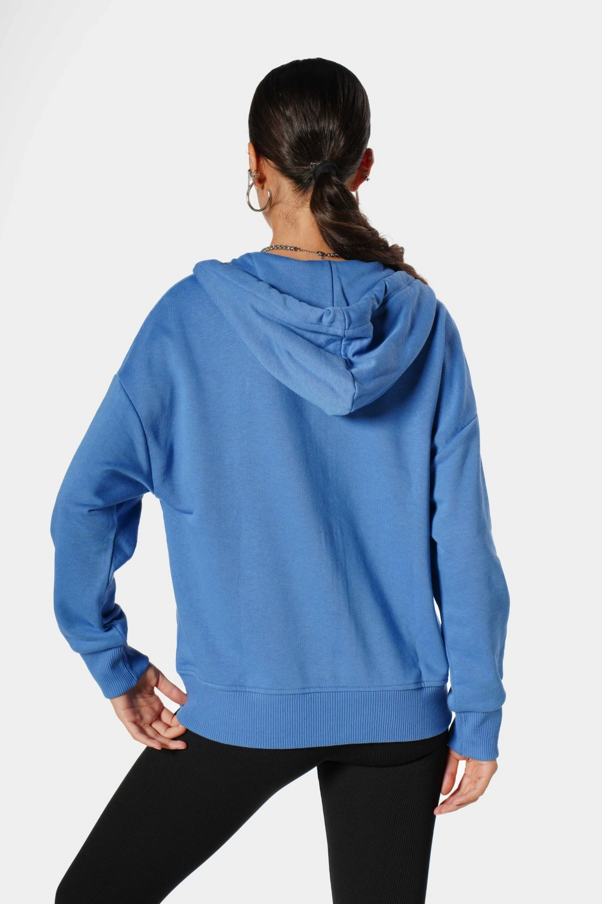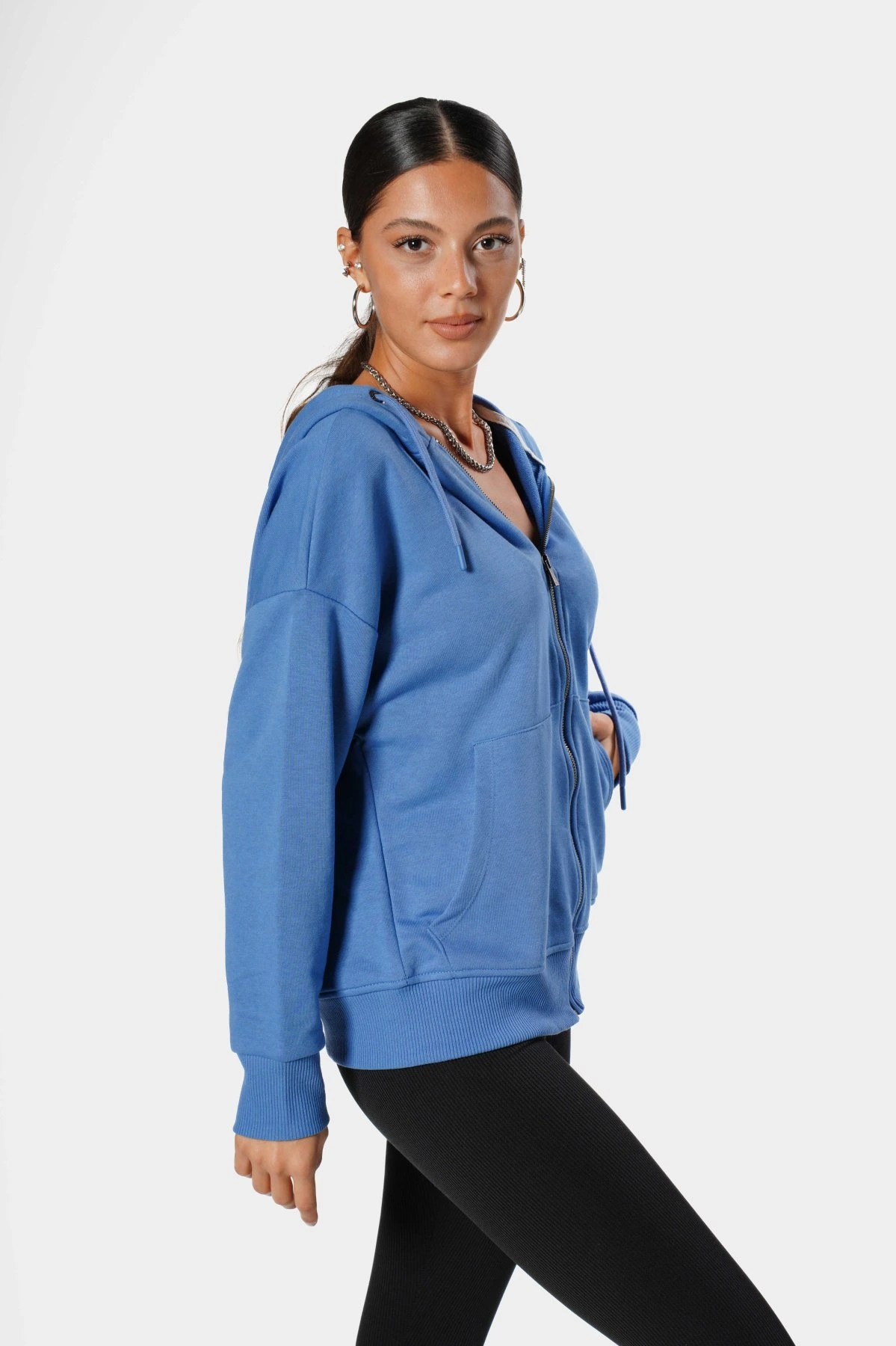 KAPÜŞONLU FERMUARLI PAMUK SWEAT – İNDİGO